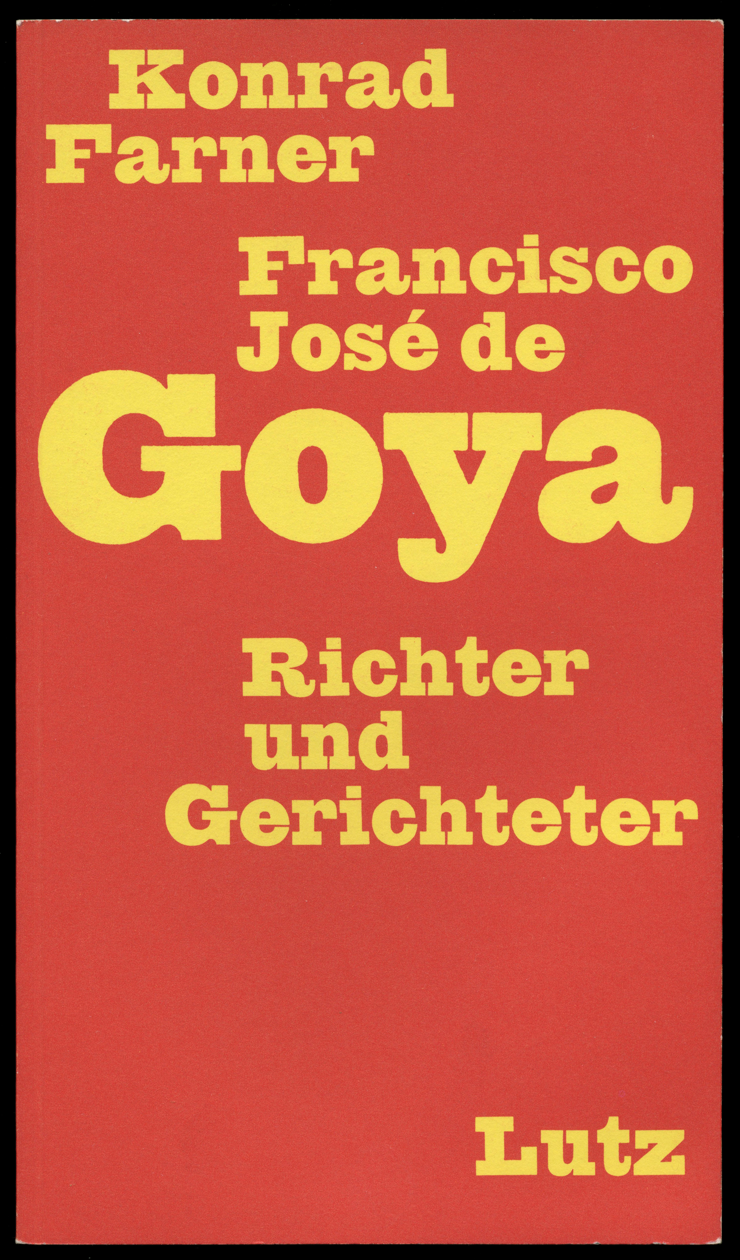 Starting in 1970 Hans-Rudolf Lutz (1939–1998) self-published a series of texts by the Marxist art historian Konrad Farner (1903–1974). In order to break a longstanding boycott of Farner, who as a distinctive member of the Swiss Communist Party (“Partei der Arbeit”) after the 1956 Hungarian uprising was vilified as an “enemy of freedom”. Only in the course of the ’68 movement Farner was rediscovered and given the opportunity to take part in the discourse about art and social commitment. The present booklet – first of the series – contains the text of a lecture on the Spanish painter Francisco José de Goya, held at the Kunsthaus Zürich in February 1970. From 1975 on new editions of some of the more popular booklets (not this one) were published by the Verlagsgenossenschaft (later Limmat Verlag), a cooperative publishing house Lutz helped to set up and for which he worked for some time as a book designer.