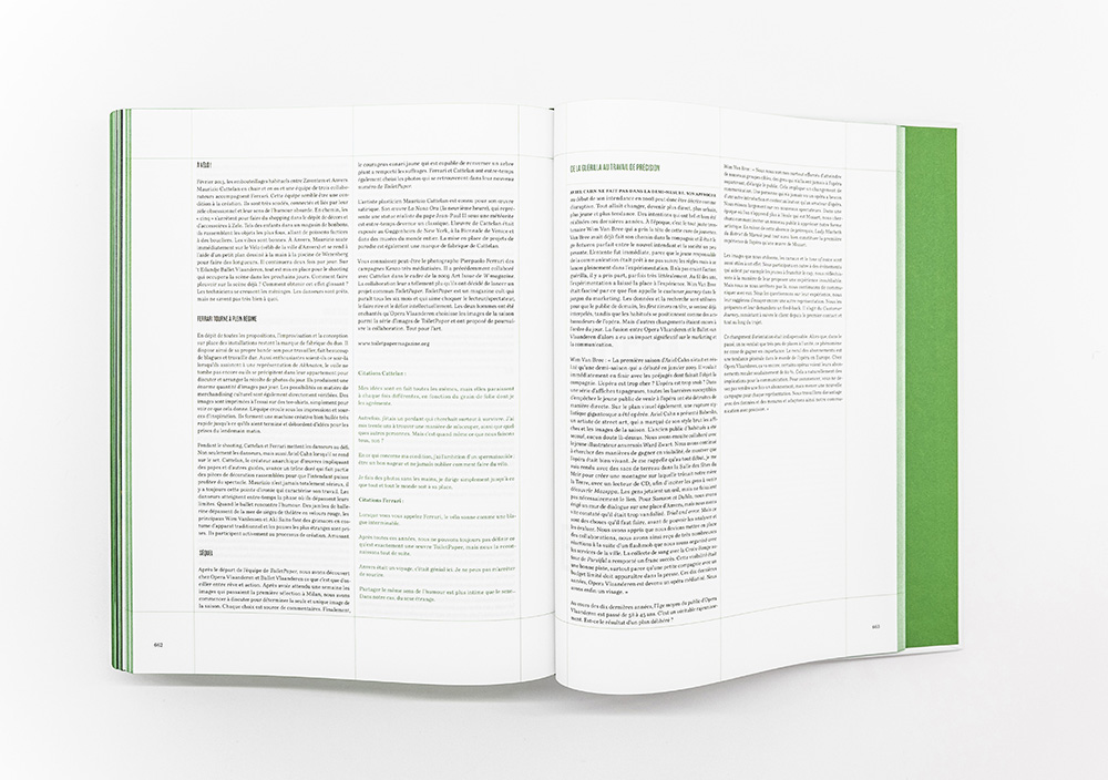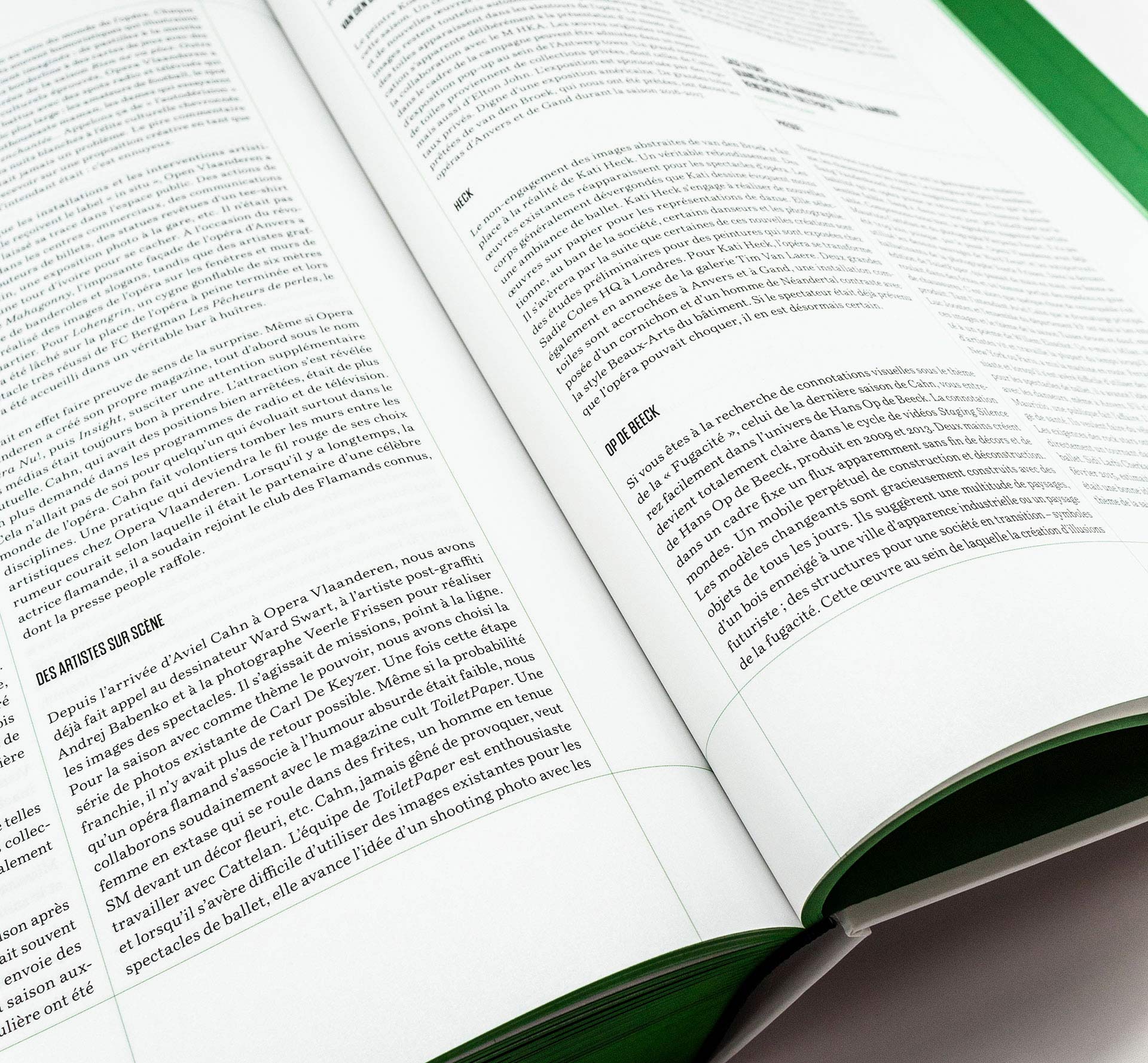 Two types of body text can be distinguished: the main text, and short essays by guest writers. The distinction between these two is made clear through a different grid and differences in typography. The book is set in Bressay (Dalton Maag), with titles and quotes set in Dharma Gothic (Ryoichi Tsunekawa / Dharma Type). Translations are listed one after the other, the grid and typographical interventions make clear the separation between the languages.