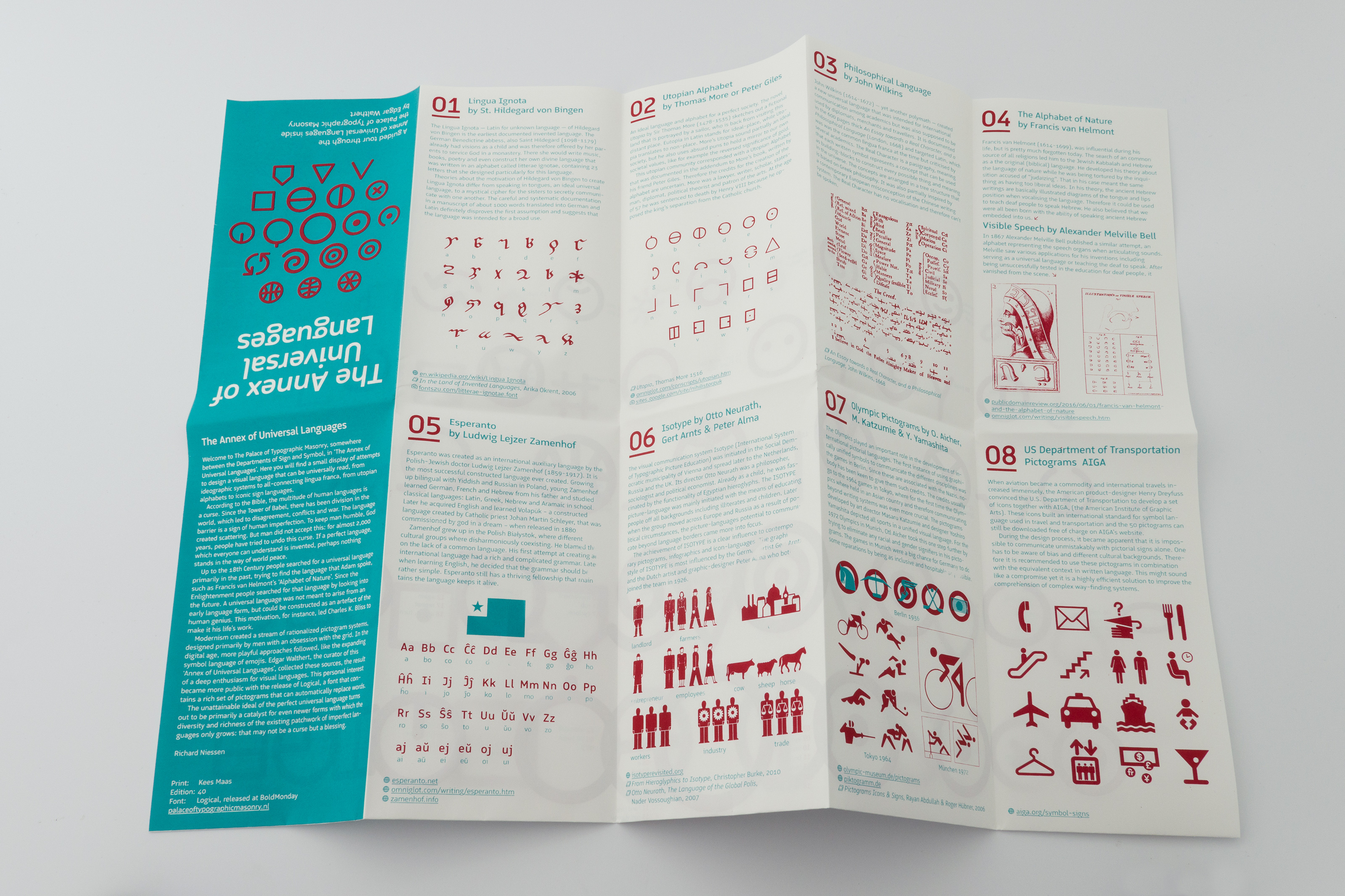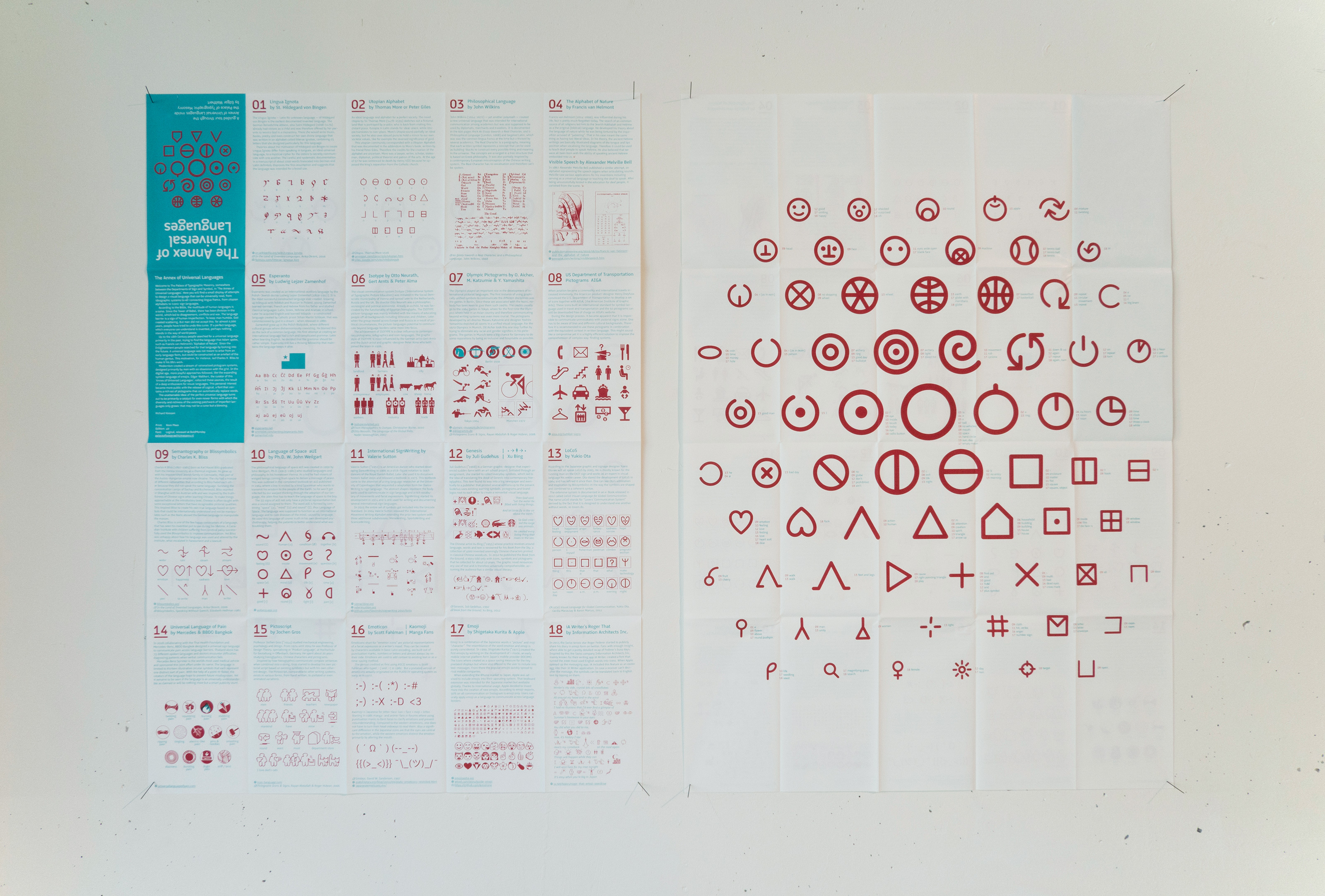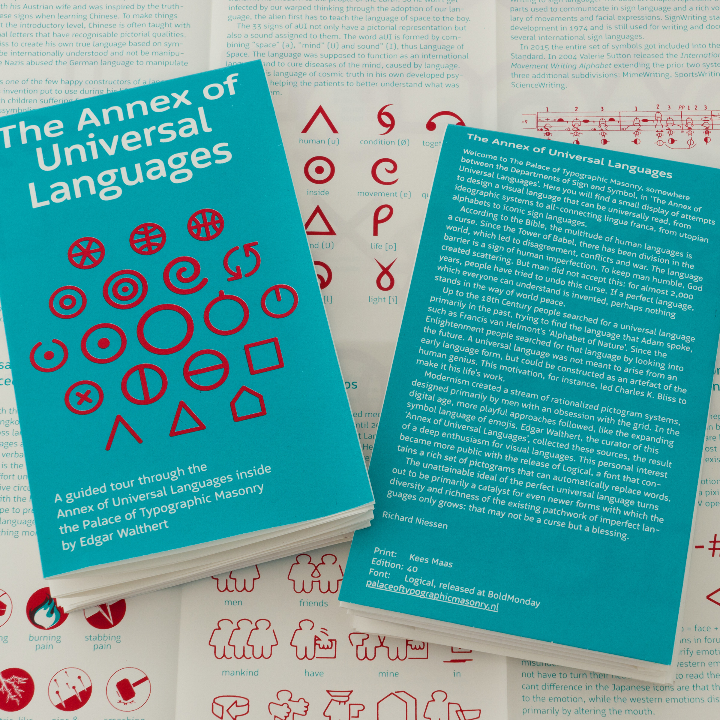 Welcome to The Palace of Typographic Masonry, somewhere between the Departments of Sign and Symbol, in ‘The Annex of Universal Languages’. Here you will find a small display of attempts to design a visual language that can be universally read, from ideographic systems to all-connecting lingua franca, from utopian alphabets to iconic sign languages.