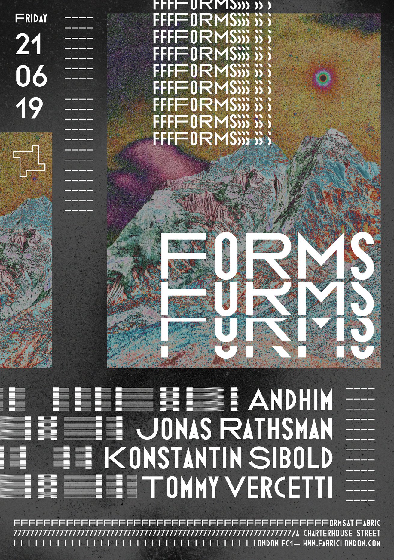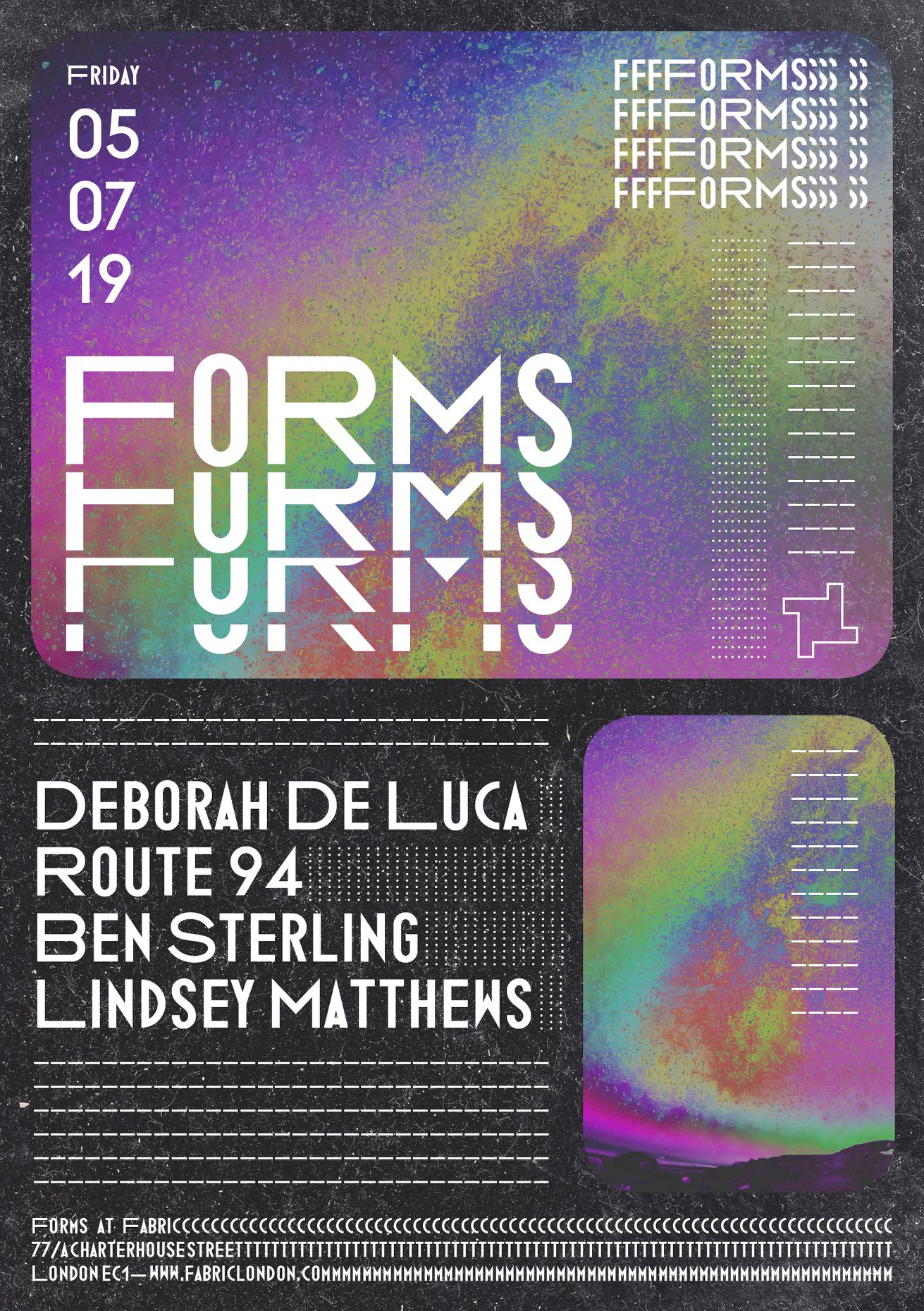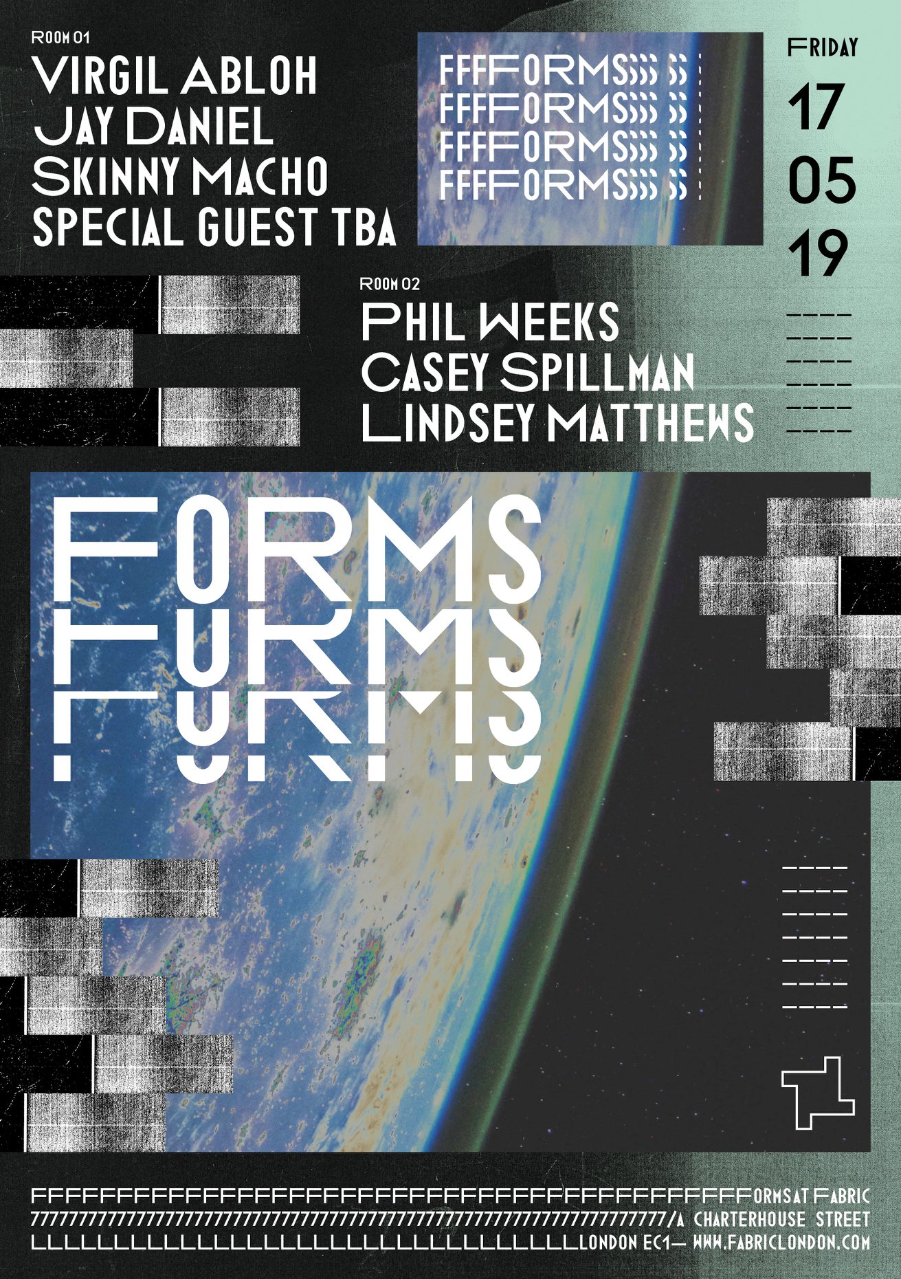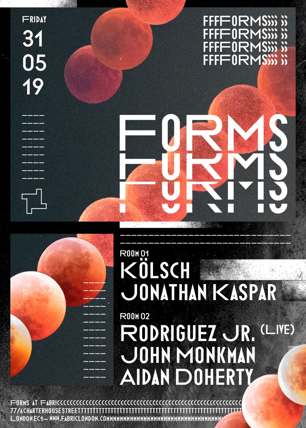 Posters for the Friday night event at London nightclub Fabric. Forms showcases lively house, techno, disco and more. Acts range from international stars including Virgil Abloh, to local names. Regular artists include Kasra, Fabio & Grooverider, Skream and Monki.