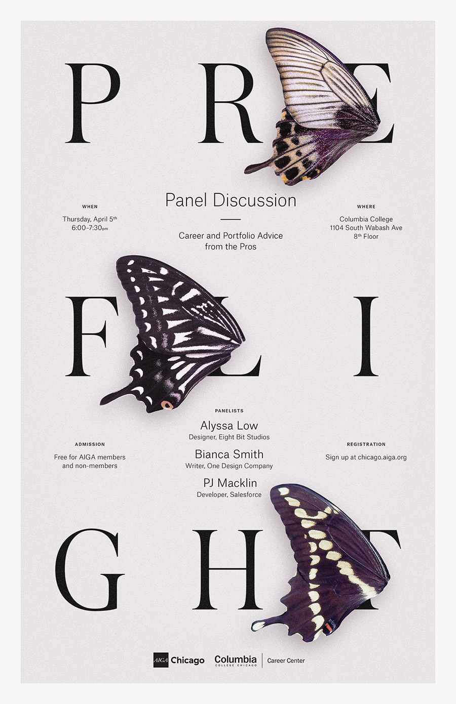 The event title is set with all caps Austin, using Atlas Grotesk for smaller text. Austin as a display-level typeface was selected to relate formally to the organic swooping forms of the butterfly wings that anchor the design system. Whereas Atlas provides significant contrast for the nitty gritty details of communication.
