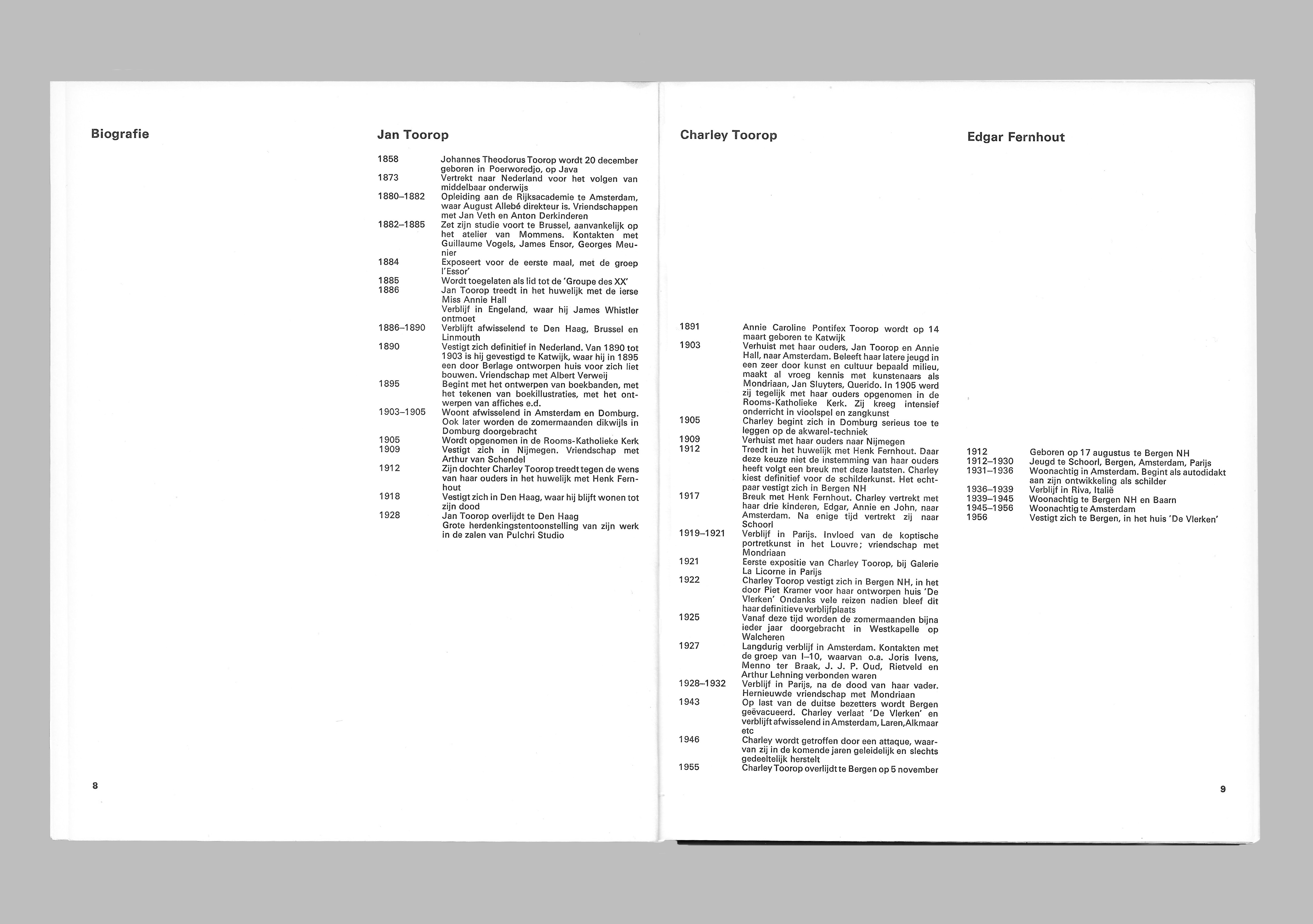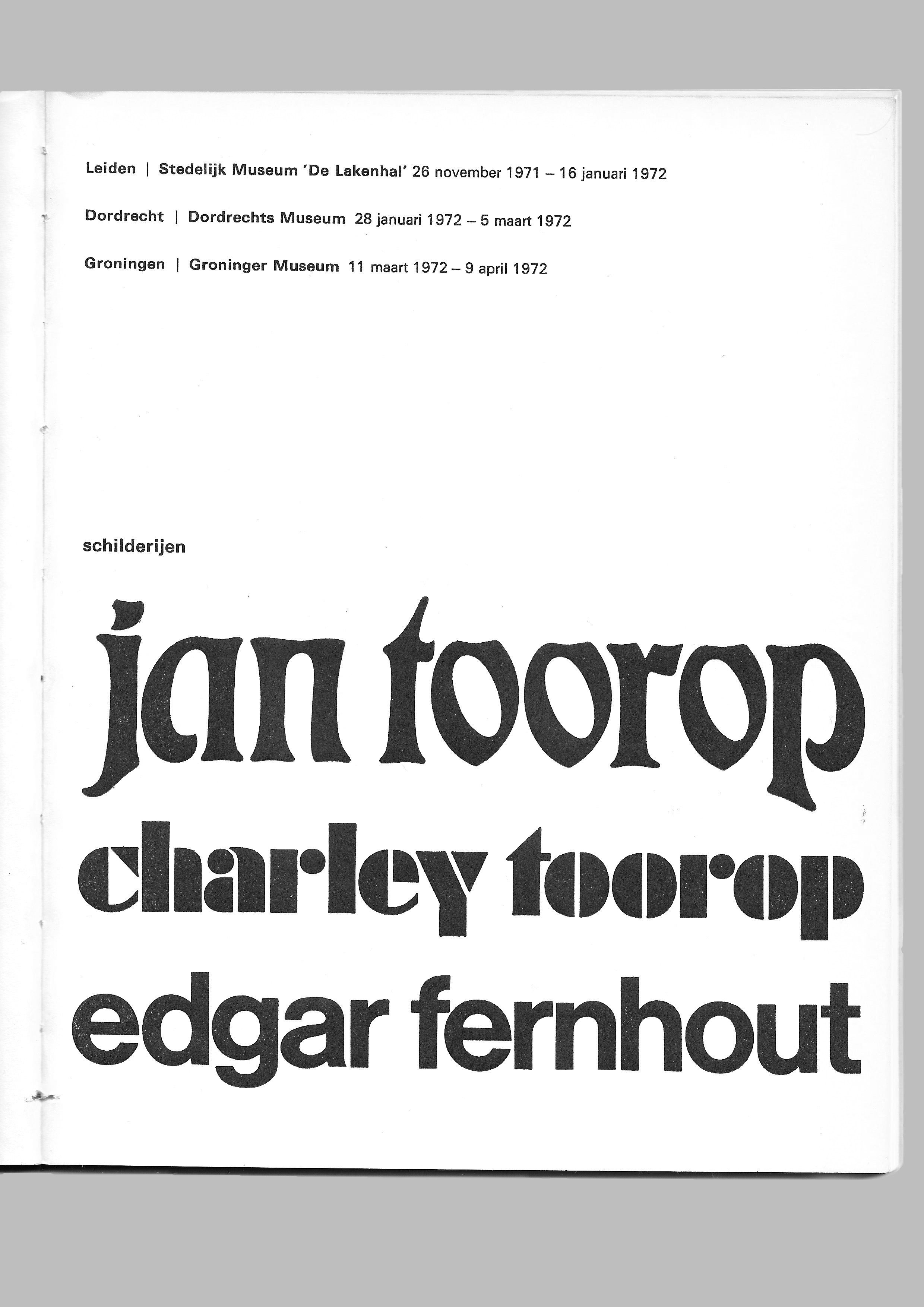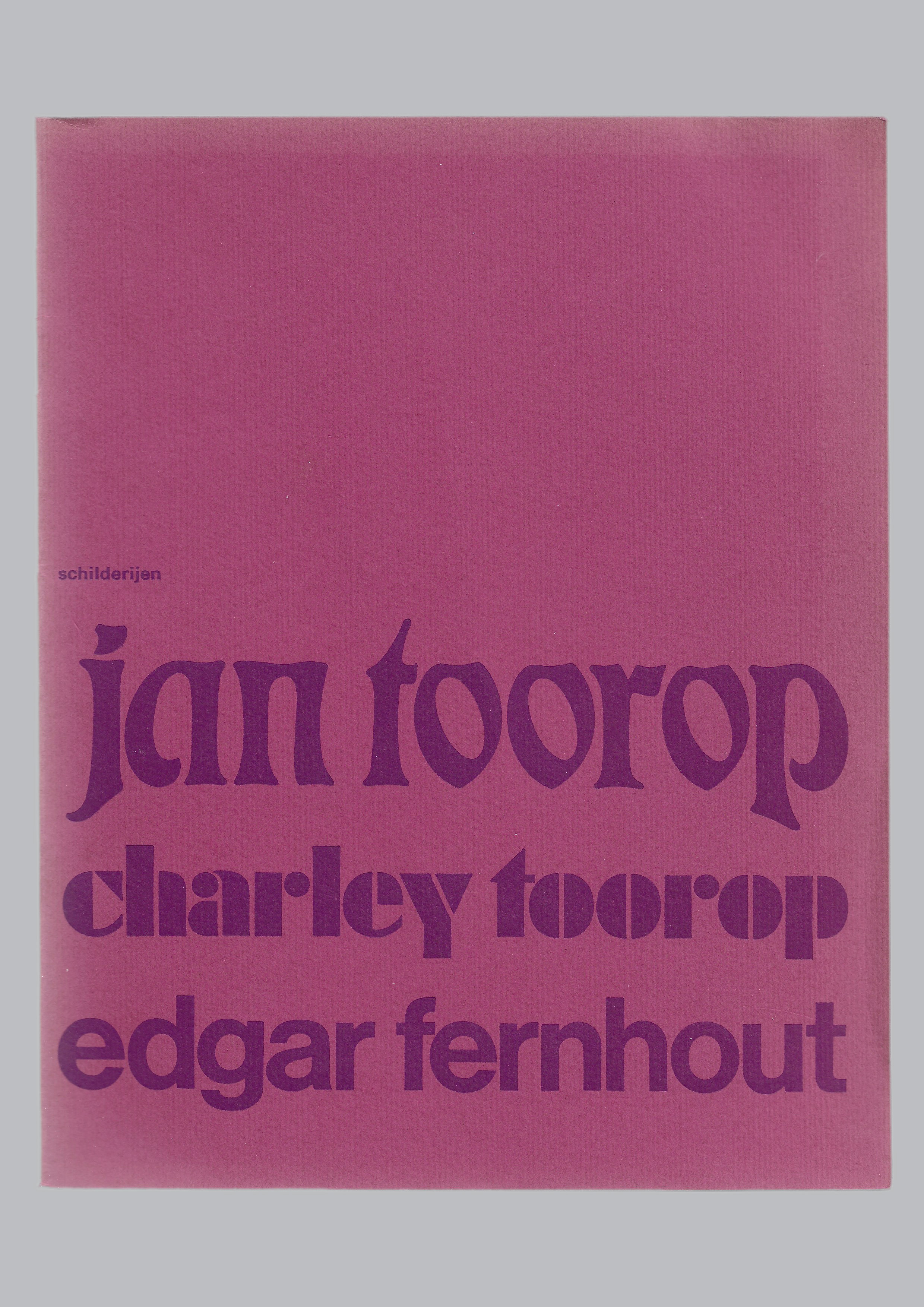 A paperback exhibition catalog title schilderijen (“paintings”) / Jan Toorop / Charley Toorop / Edgar Fernhout issued in 1971 in response to three exhibitions (respectively in Leiden, Dordrecht, and Groningen). The exhibitions and catalog brought together the work of three generations of artists: Jan Toorop, his daughter Charley Toorop and her son Edgar Fernhout, who was 60 years old at the event of the exhibition. In 1974, two years after this exhibition, Edgar Fernhout died in his parental home in Bergen.