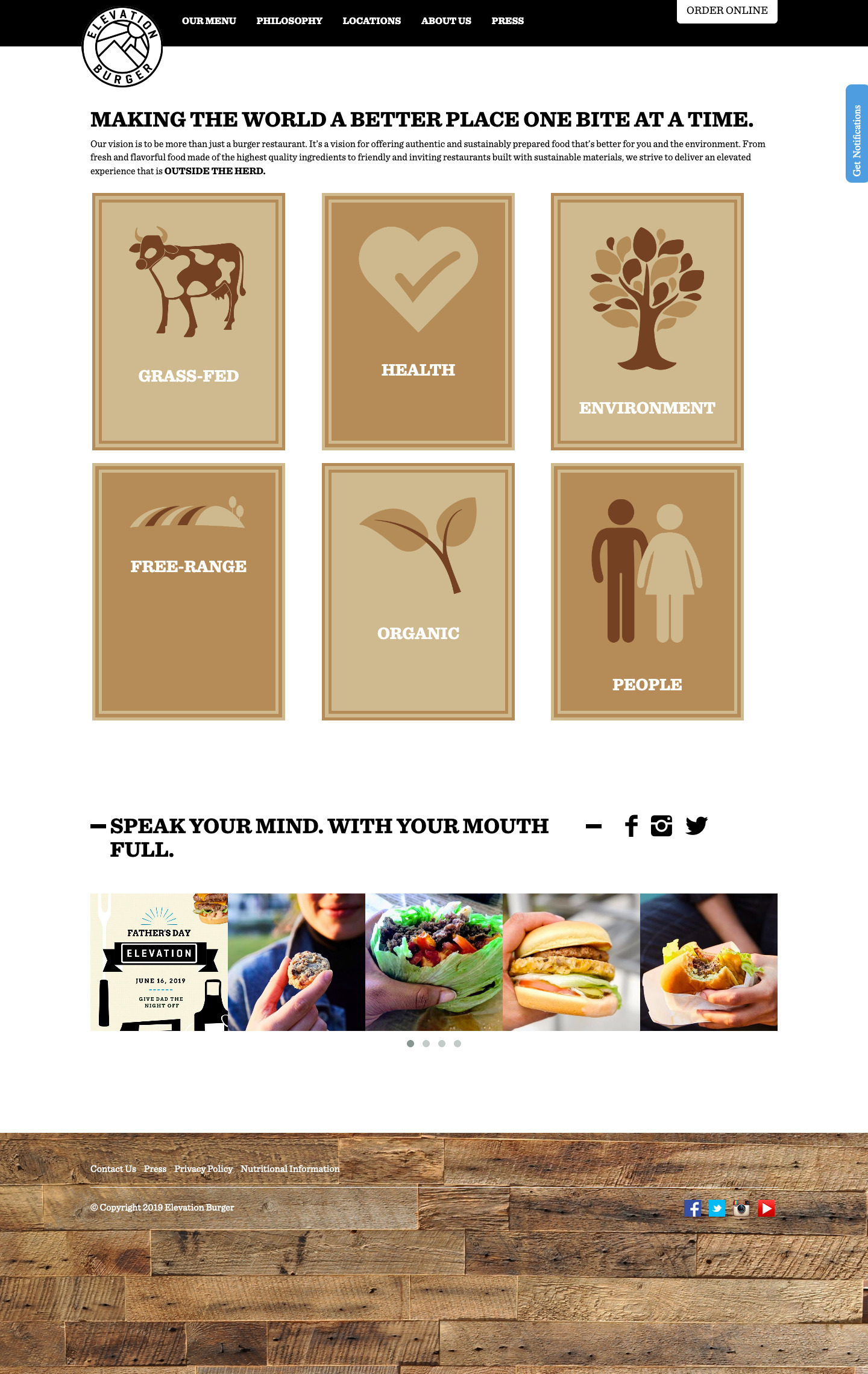 Elevation Burger was originally conceived in 2002. Our founder, Hans Hess, couldn’t find the burger he’d been dreaming about since he left California in 1999. (…) Driven by a passion for good food that’s organic, sustainable and fresh, Elevation Burger began franchising in 2008. — Elevation Burger