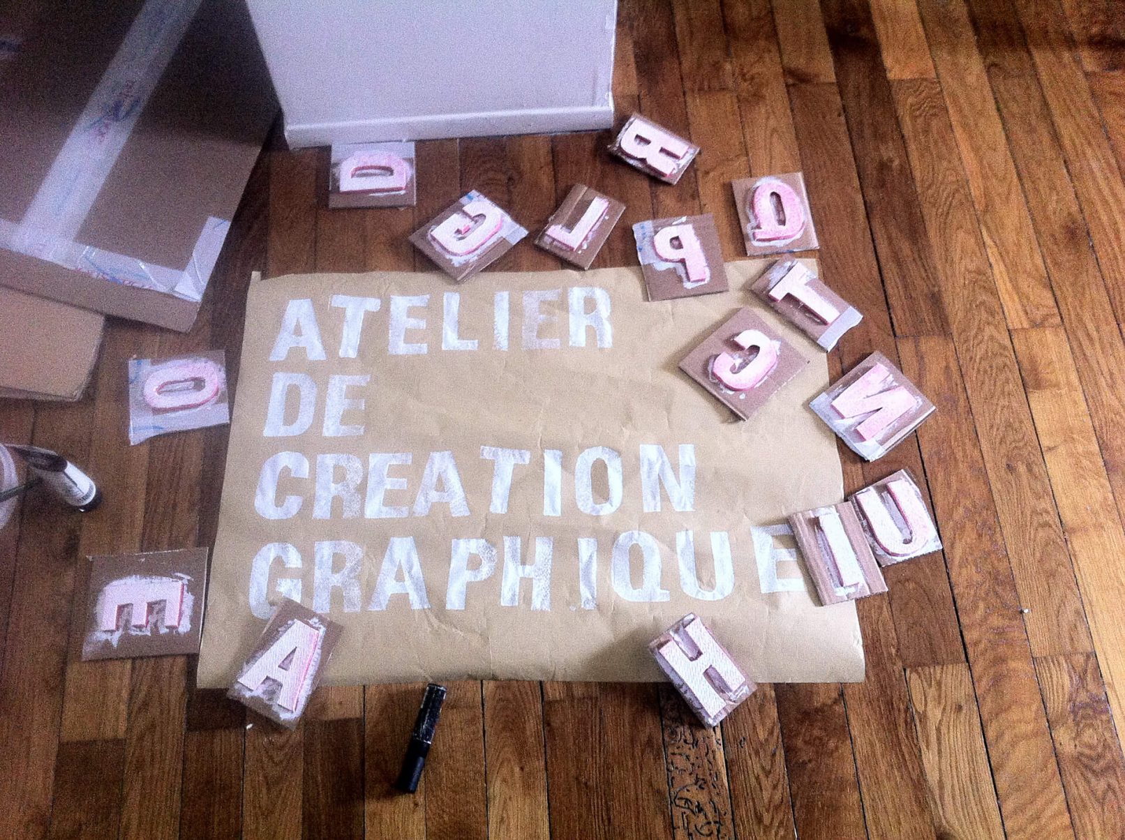 On site, the two alphabet sets with caps from Univers (in 50 and 80pt) were also used to print ephemeral signs intended to indicate the different spaces, workshops or animations present during the occupation. The stamps were made from gym mats laminated on cardboard.