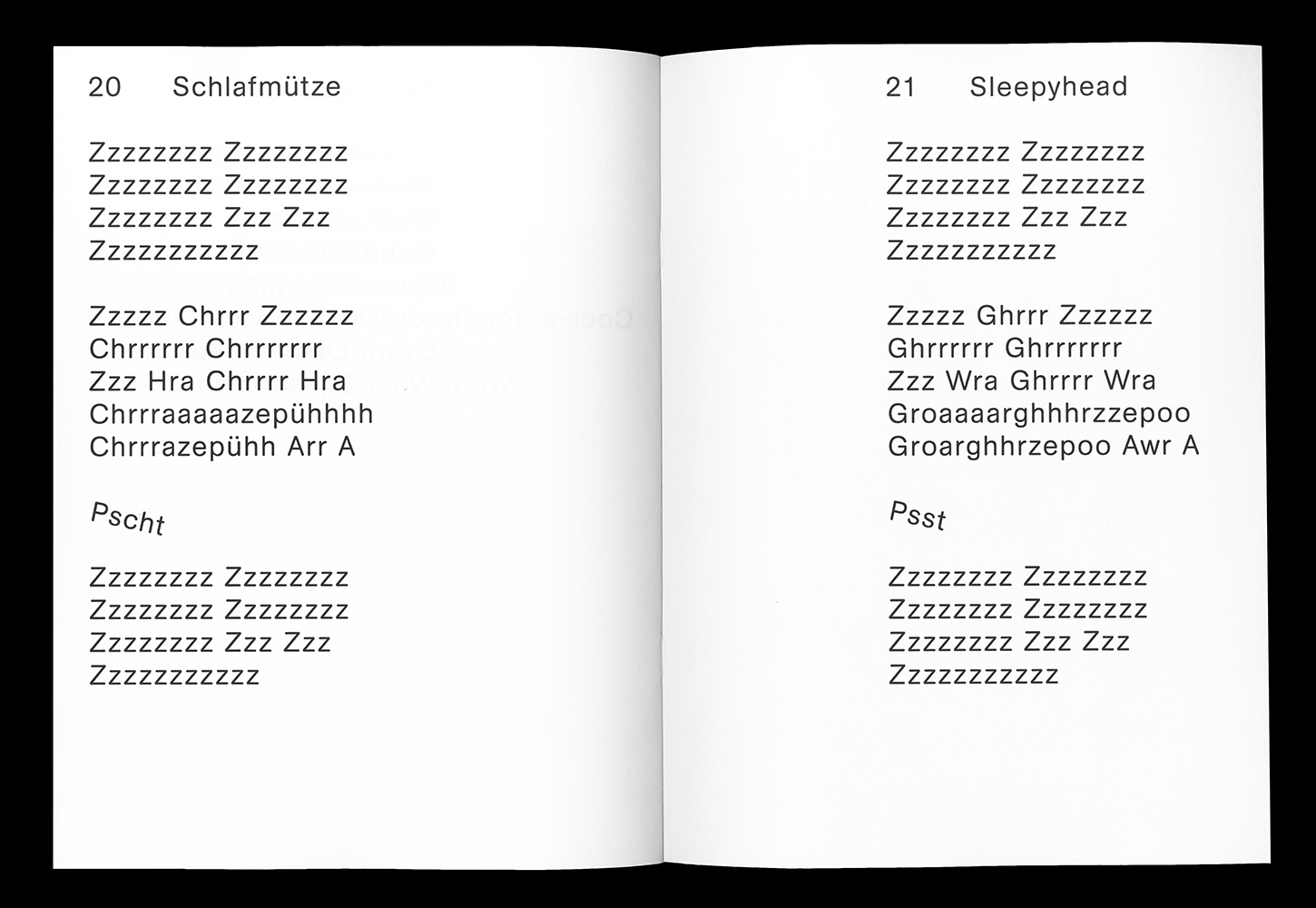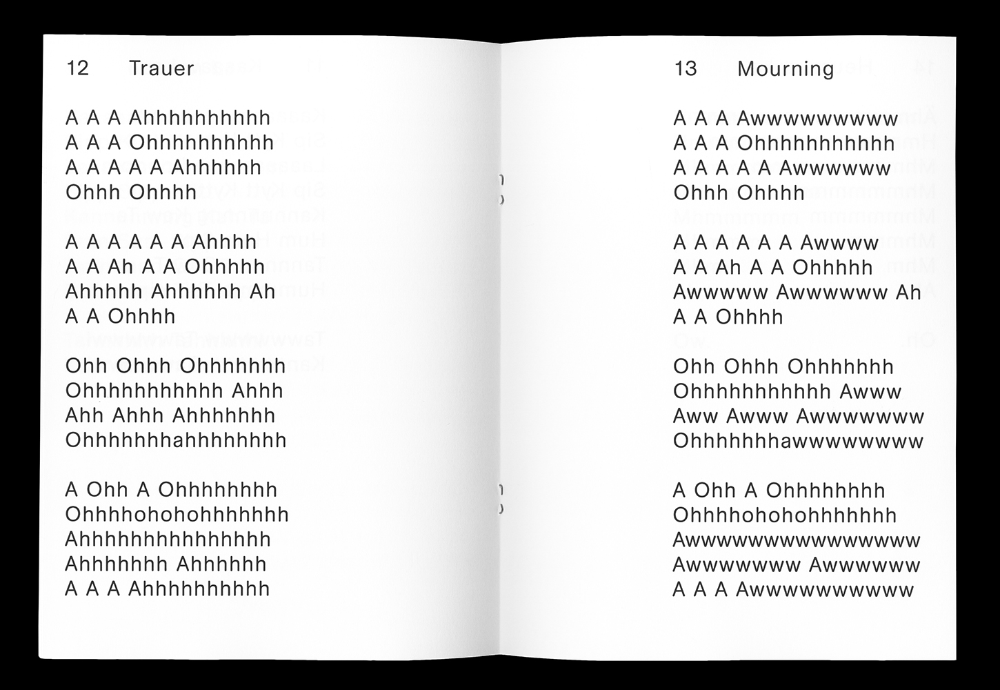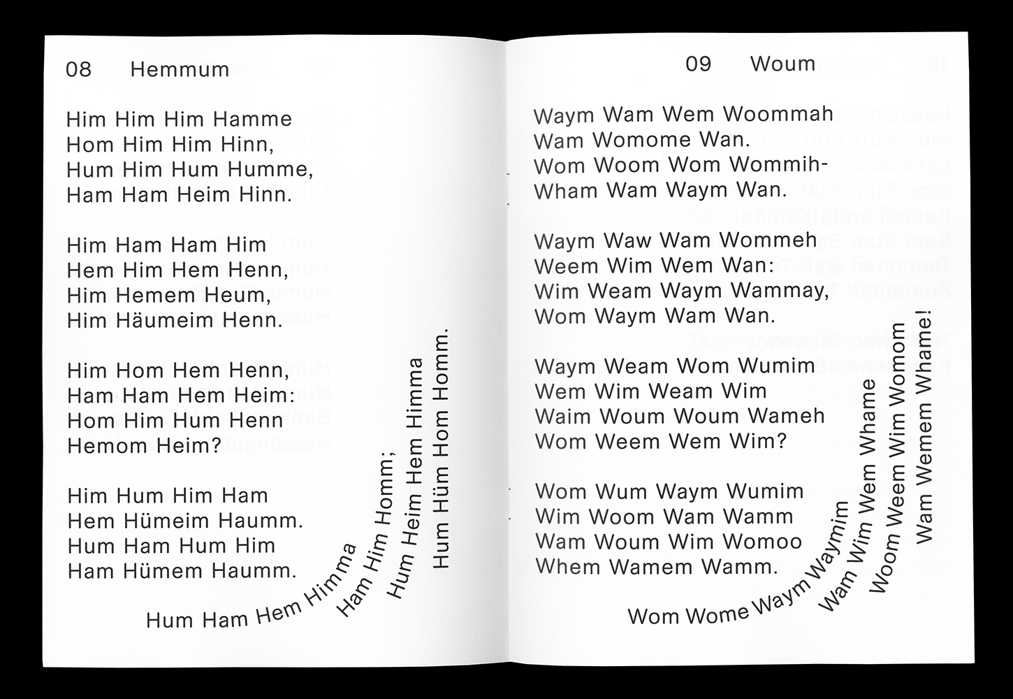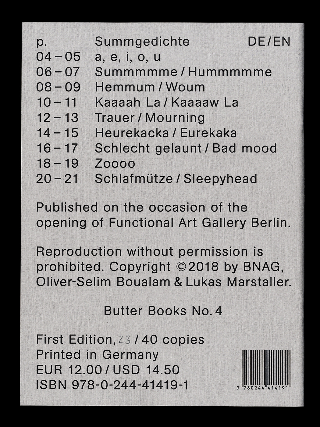 Summgedichte (“humming poems”) was published by Butter Books on the occasion of the opening of Functional Art Gallery Berlin in an edition of 40 copies. The book was conceived and designed by BNAG, a Karlsruhe / Marrakesh based design studio run by Oliver-Selim Boualam and Lukas Marstaller.