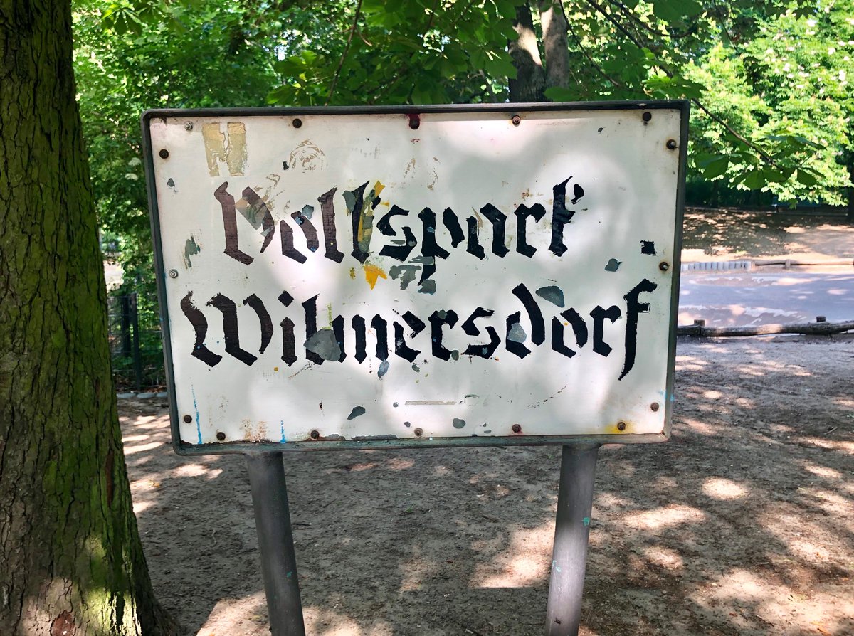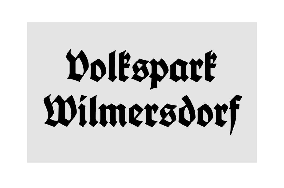 I don’t know how old this sign is. The park was originally designed in 1912–1914 and remodeled several times, in 1935, 1945, 1960–1965, and 1986–1987, according to the Berlin Monument Authority. From 1917 to 1945, the park was named Hindenburgpark. Chances are the sign was made in the 1980s or even later, and the type style chosen in an attempt to refer to the period of construction – Deutsche Schrift was first issued in 1910 and enjoyed great popularity in the 1910s and 1920s. I doubt that stenciled blackletter signs were a common thing back then, though. It looks rather historicizing to me, but in a refreshingly punk way.
