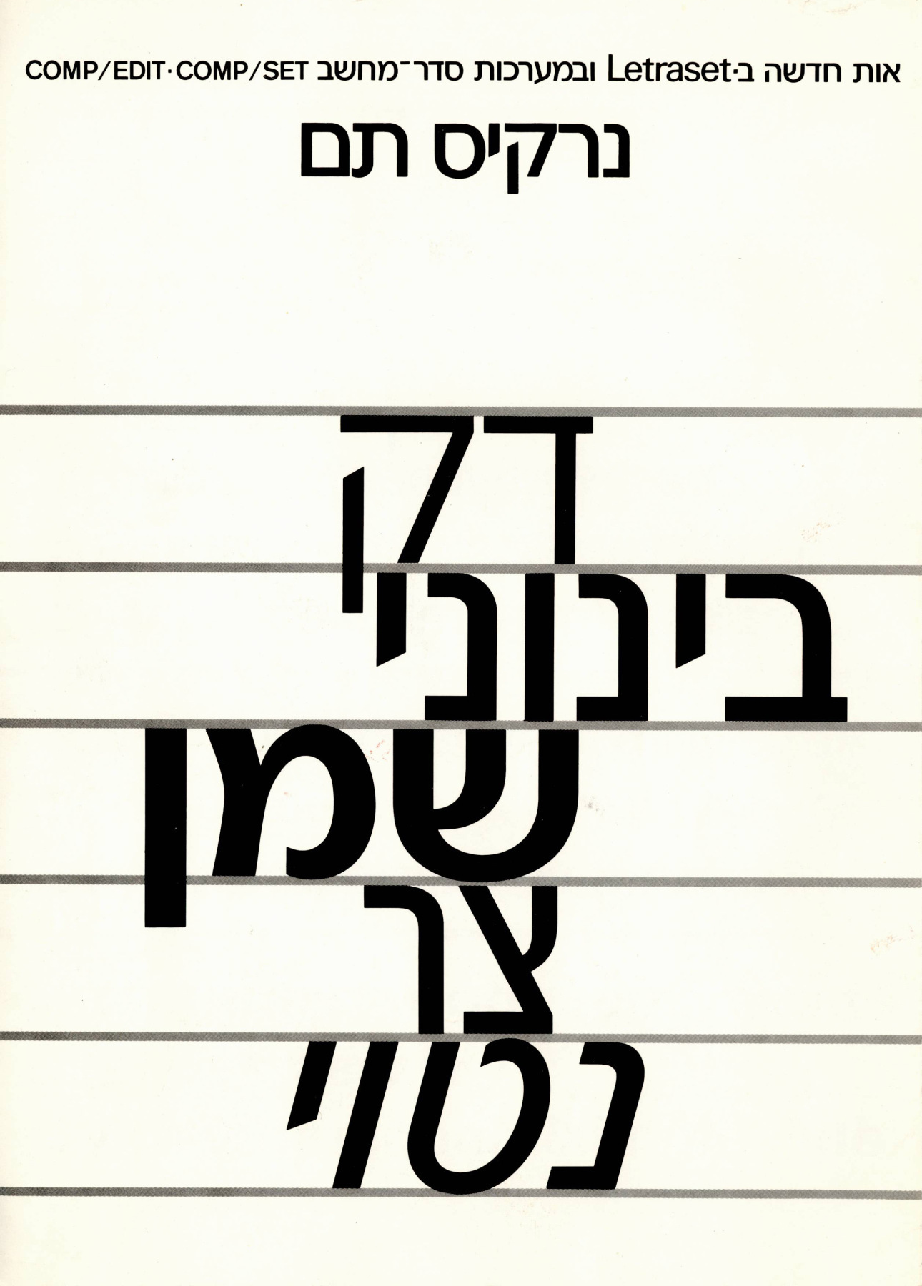 Cover of the pamphlet issued by Letraset on the occasion of the launch of Narkiss Tam (נרקיס תם) in 1979/80. This Hebrew typeface was designed by Zvi Narkiss (1921–2010) to match Adrian Frutiger’s Univers. See more images of this brochure on the website of Yaronimus.