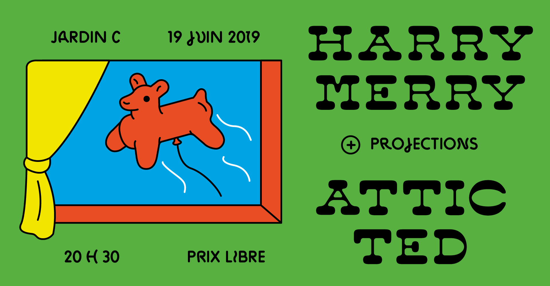 First use of my first font Louisette for the concert of Harry Merry and Attic Ted, two musicians playing a weird carnival music. I decided to use Louisette, an inverted rounded revival I made this last year inspired by monstruous italians. To support it, I used Zig Zag who could easily fit to my illustration style and add a funny aspect to the poster.