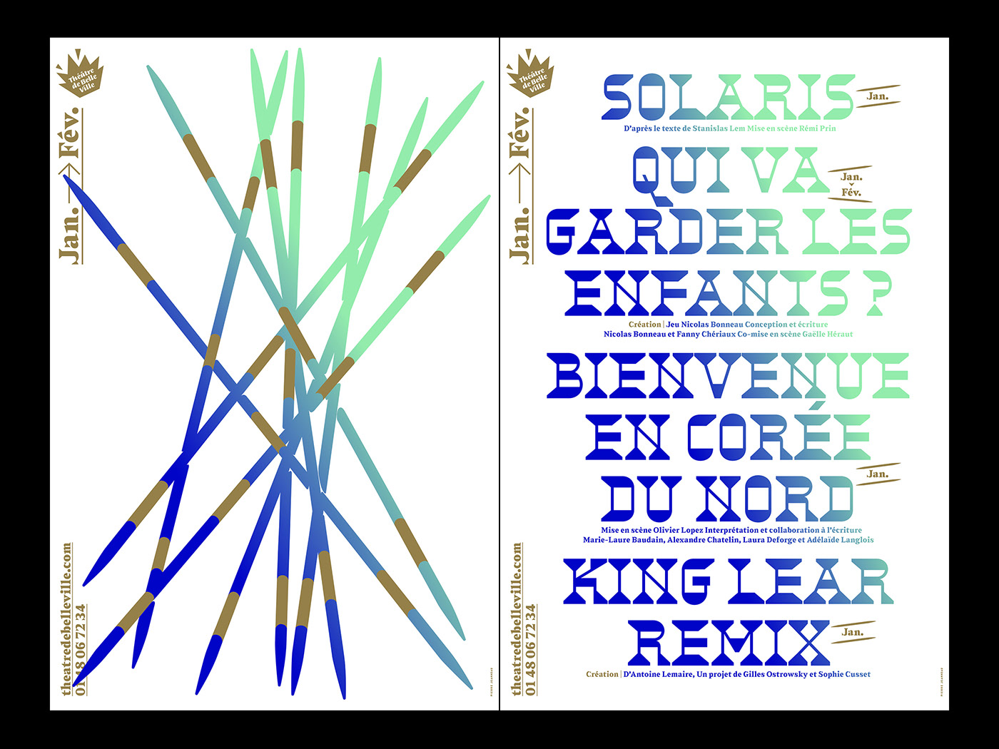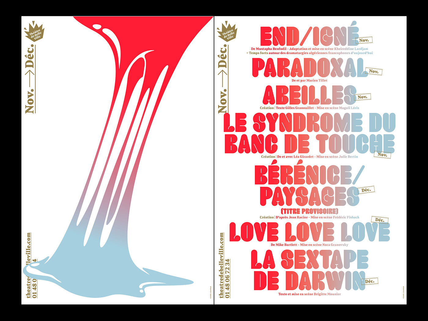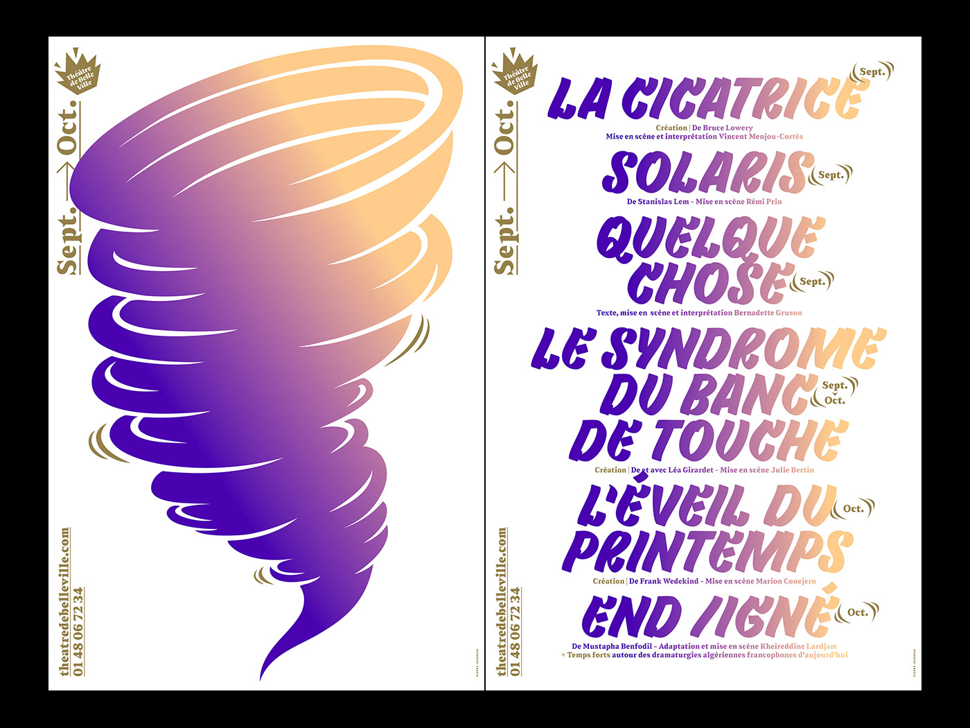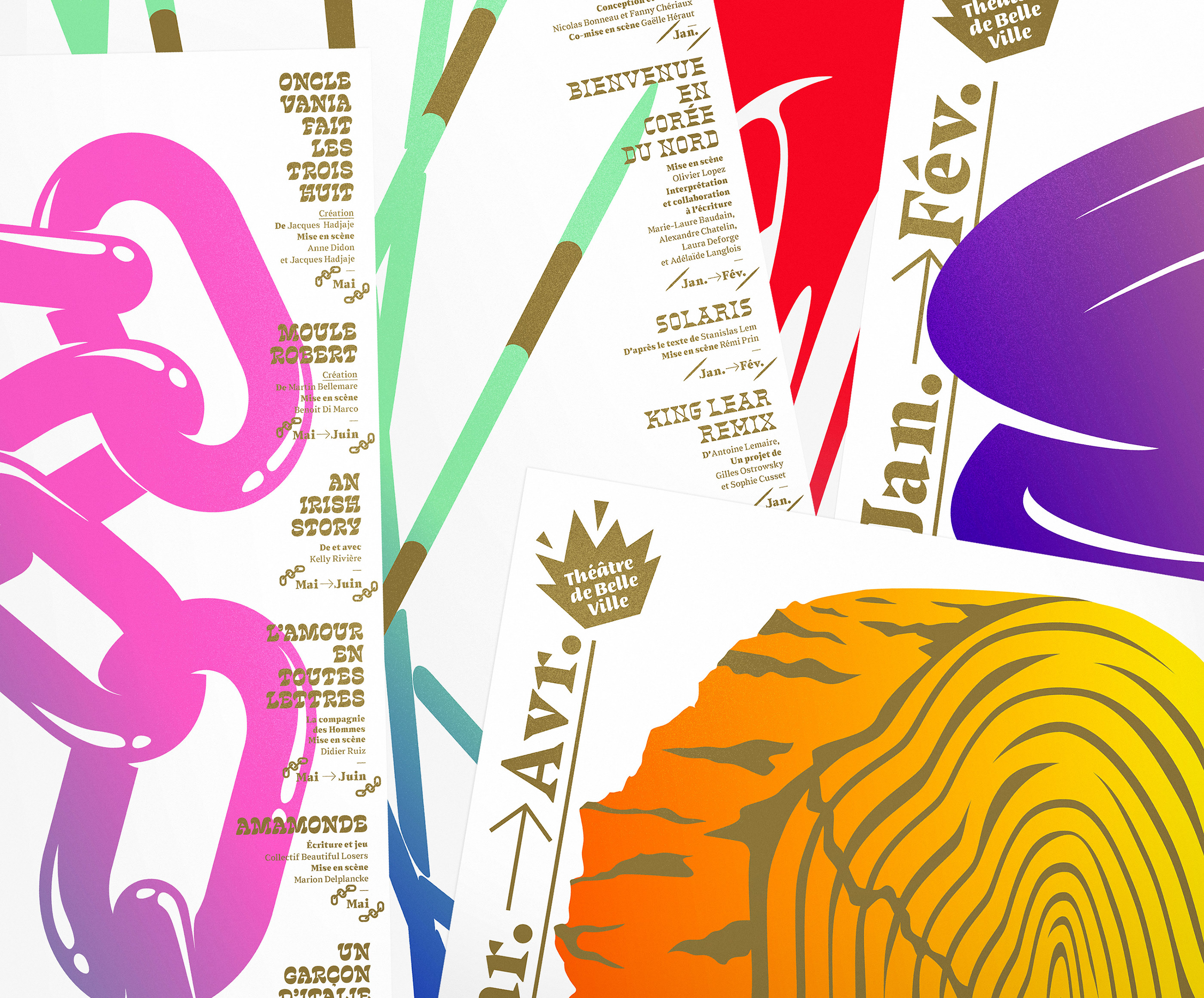 The current season of the Théâtre de Belleville in Paris runs from September 2018 to July 2019. The new visual identity was designed by Pierre Jeanneau and is built around five illustrations. Each visual is shown for a period of two months and comes with a typographic poster announcing the plays. The typefaces were chosen to create the best harmony with the respective illustrations. Each poster is printed in Pantone spot colors on 70×100 cm and 40×60 cm formats on matte offset paper. The program is designed as a concertina fold that can be divided into four different flyers, printed on both sides. The visual link between illustration and typography is strengthened by five unique color gradients for each period.