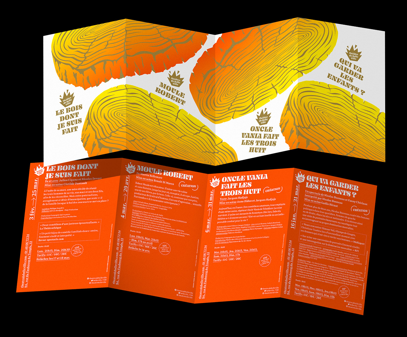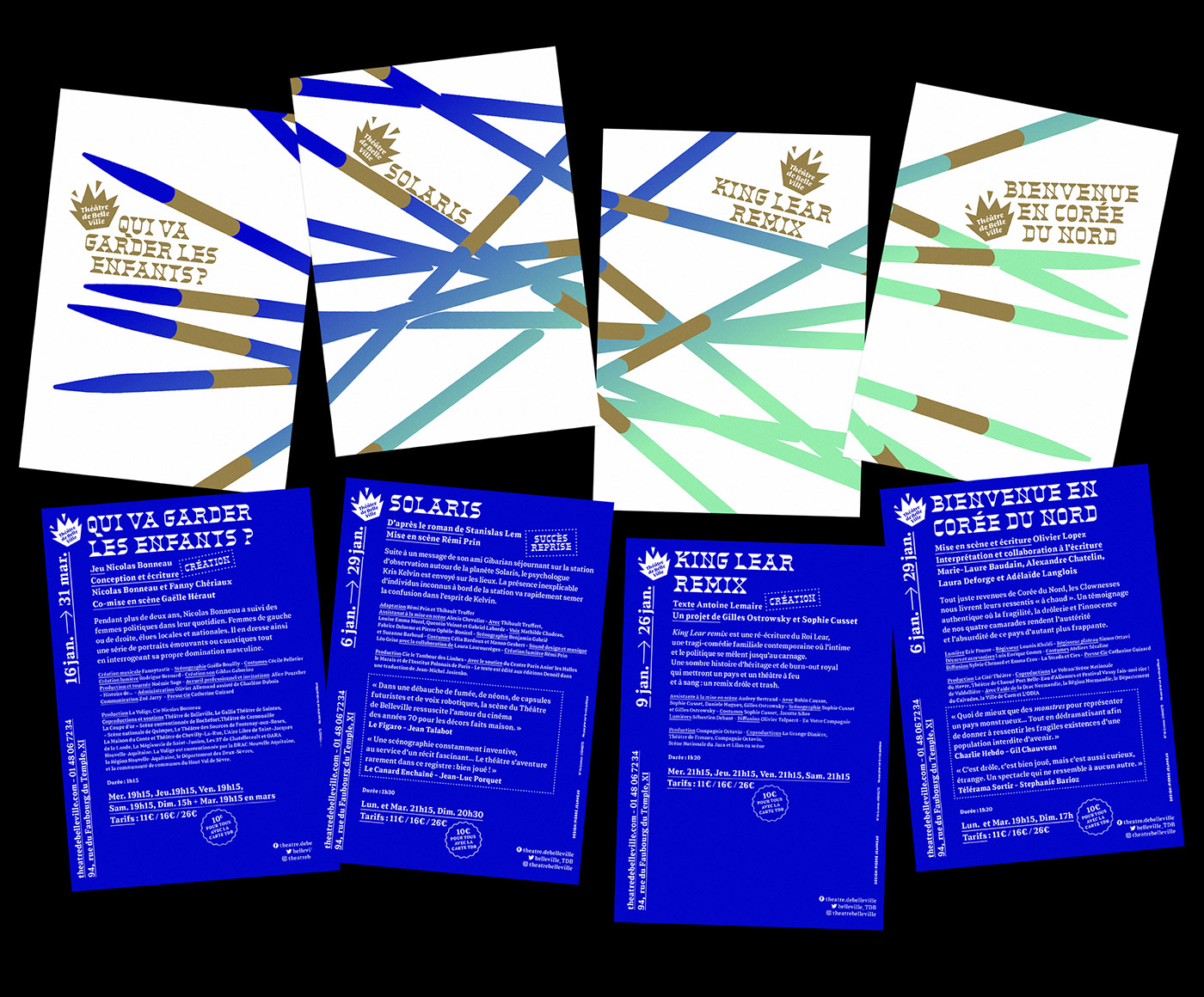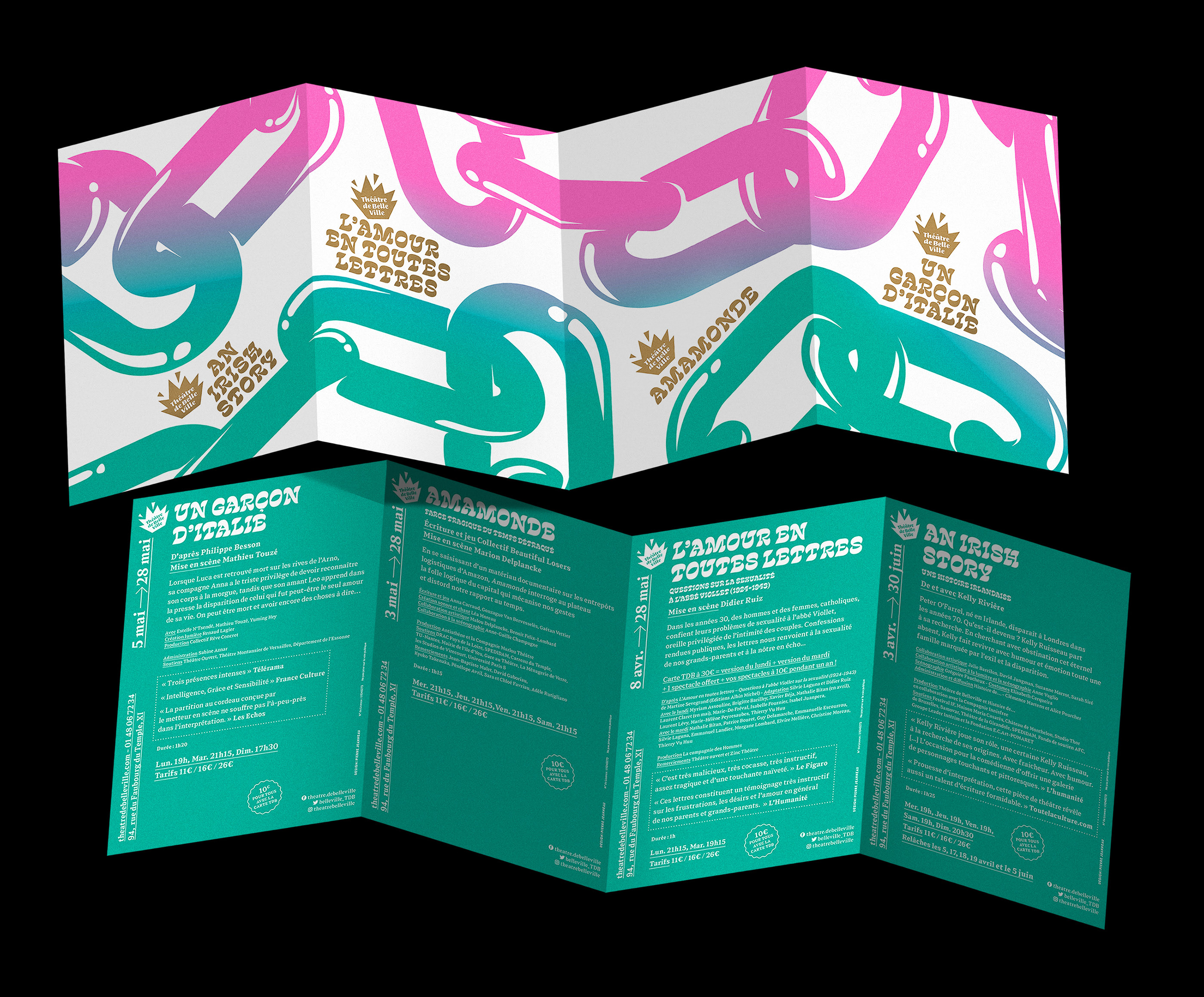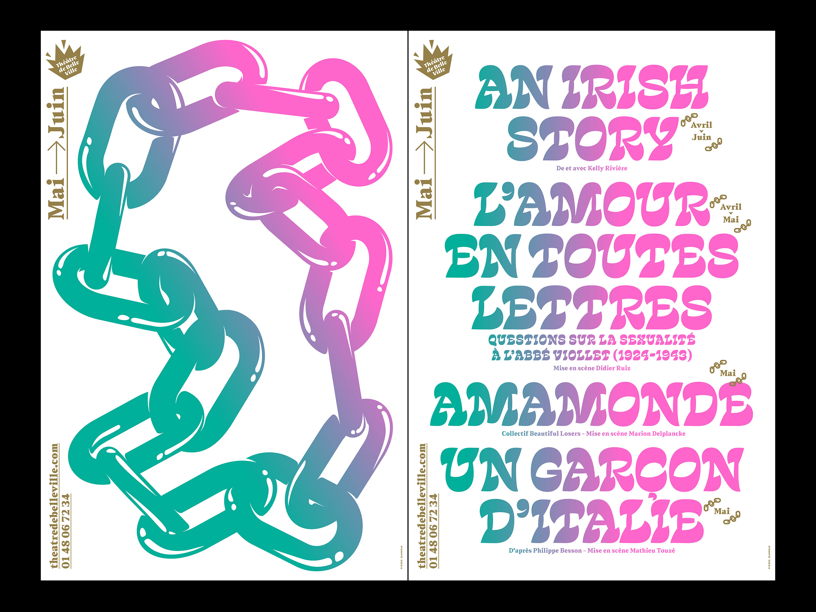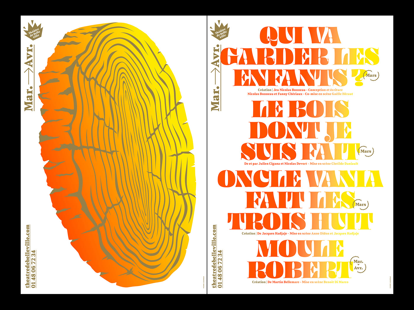 The current season of the Théâtre de Belleville in Paris runs from September 2018 to July 2019. The new visual identity was designed by Pierre Jeanneau and is built around five illustrations. Each visual is shown for a period of two months and comes with a typographic poster announcing the plays. The typefaces were chosen to create the best harmony with the respective illustrations. Each poster is printed in Pantone spot colors on 70×100 cm and 40×60 cm formats on matte offset paper. The program is designed as a concertina fold that can be divided into four different flyers, printed on both sides. The visual link between illustration and typography is strengthened by five unique color gradients for each period.