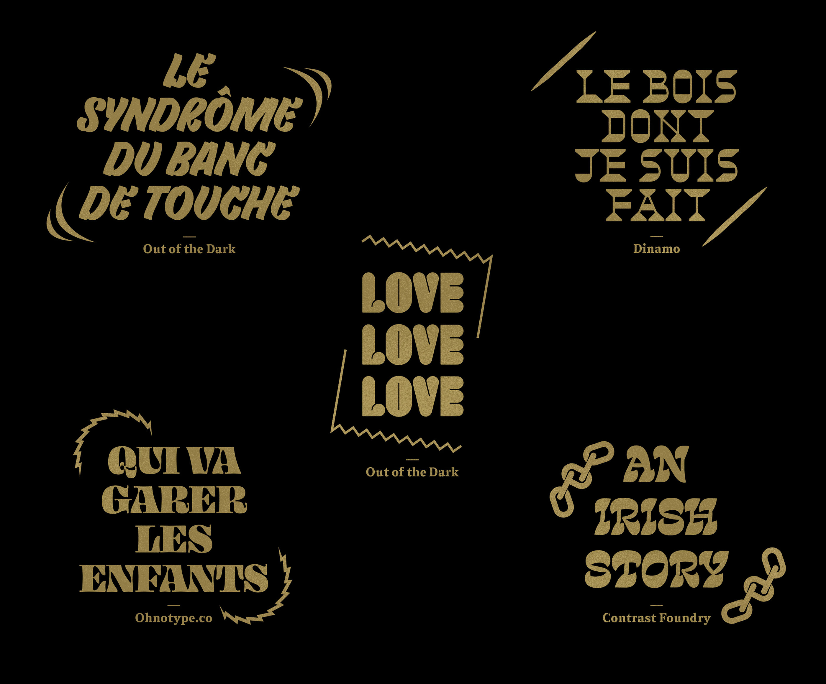 The five featured typefaces are Quick Marker (Out of the Dark) for September/October, Crack (Out of the Dark) for November/December, ABC Pareto Triangular (Dinamo) for January/February, Ohno Blazeface (OH no Type Co.) for March/April, and CoFo Chimera (Contrast Foundry) for May/June. They are paired with Sabre (Alias) for text. The logo of the Théâtre de Belleville uses Briem Script Ultra (Adobe).