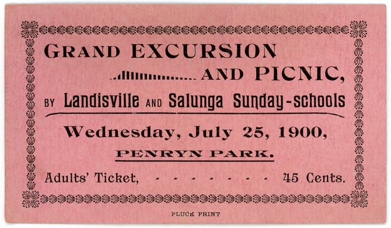 In 1900, the Sunday schools of churches in Landisville and Salunga, Lancaster County, Pennsylvania, organized a trip to Penryn Park, a trolley park that was located about eighteen miles away near Cornwall in Lebanon County (YMCA Camp Shand, a children’s summer camp, occupies the park site today).