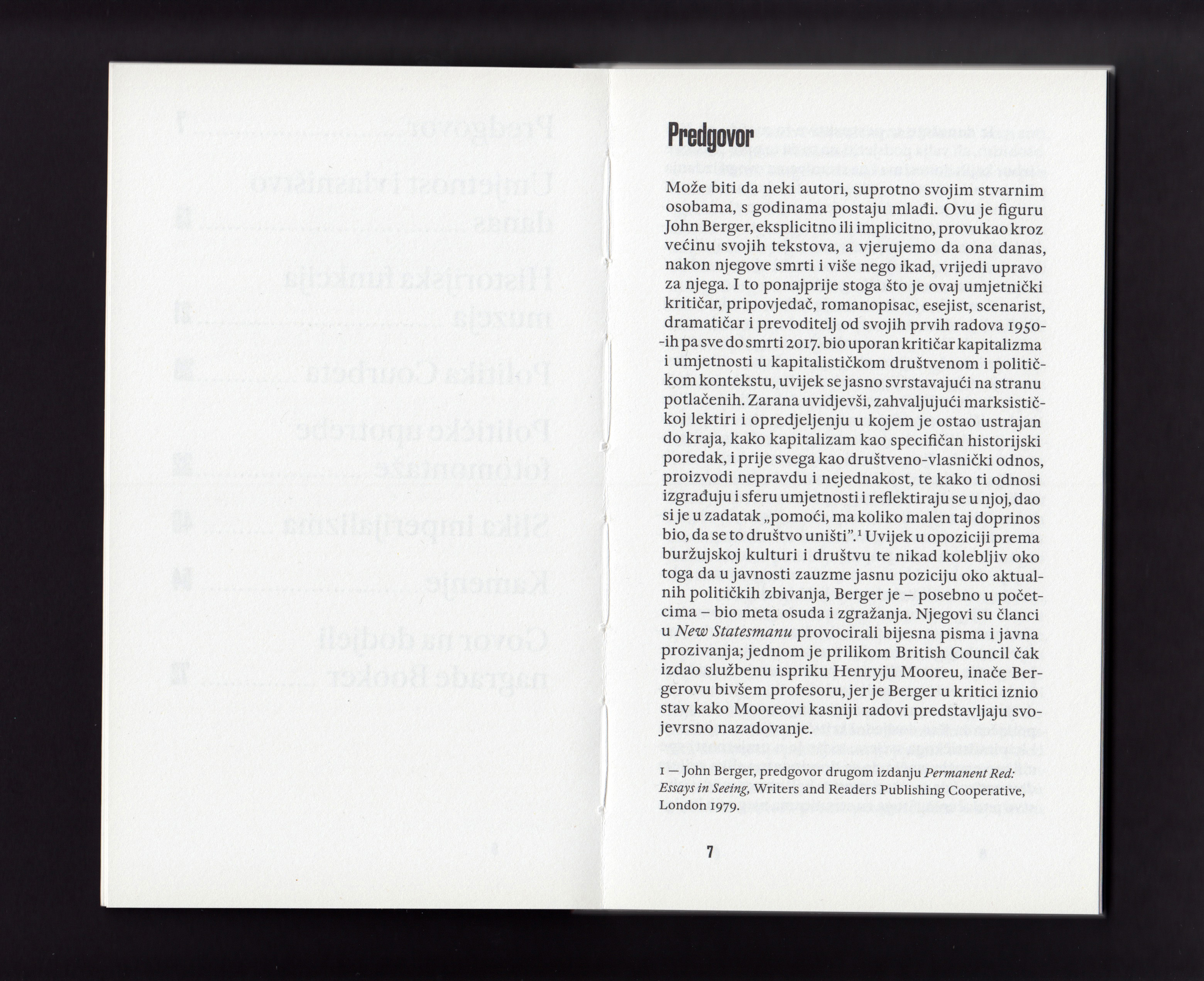 The design contrasts the full color coated cover with the more rough interiors printed in Berger’s tradition, only in black on uncoated paper.