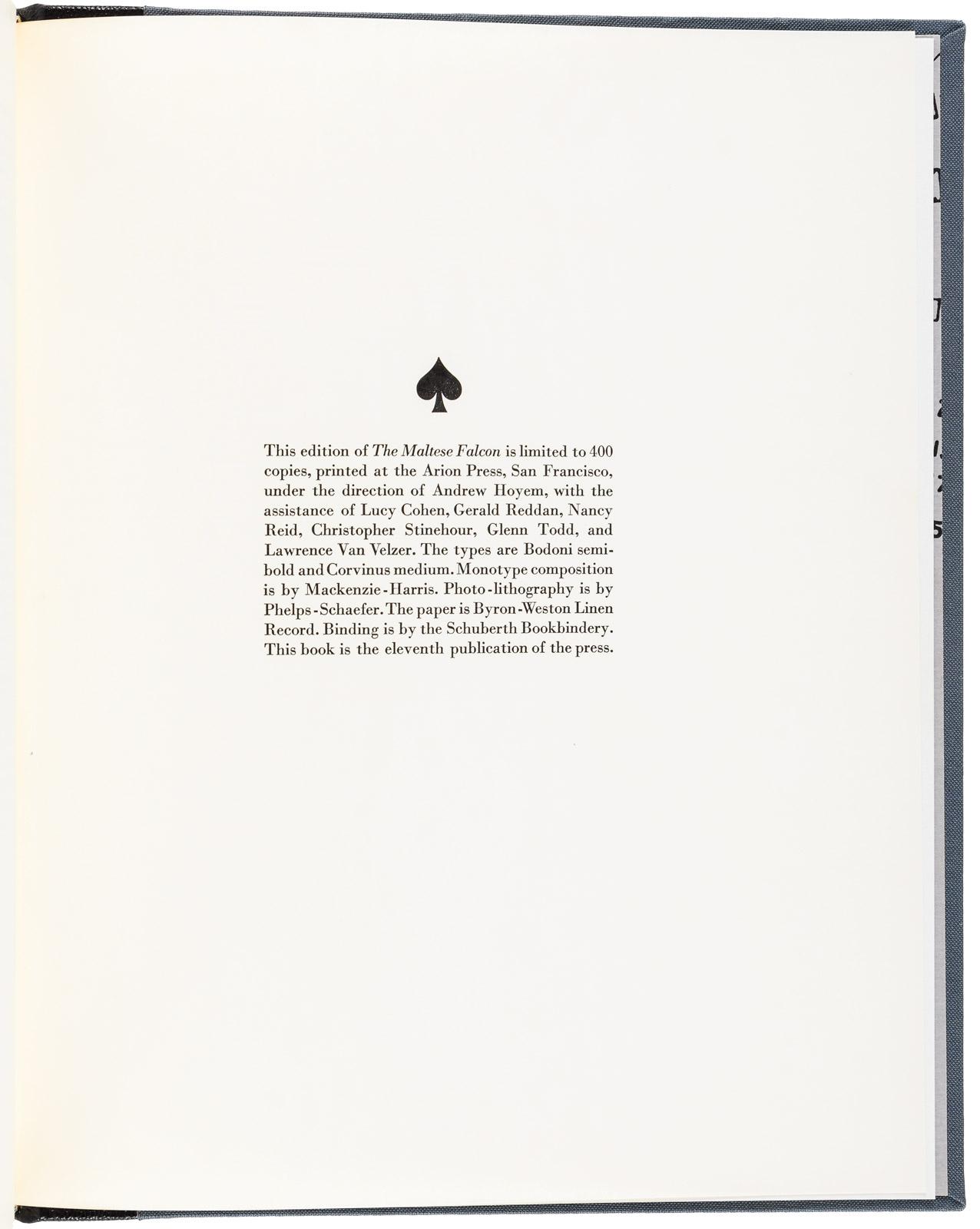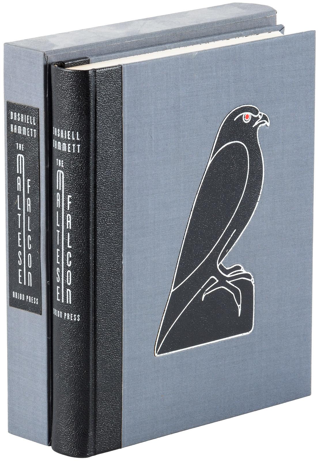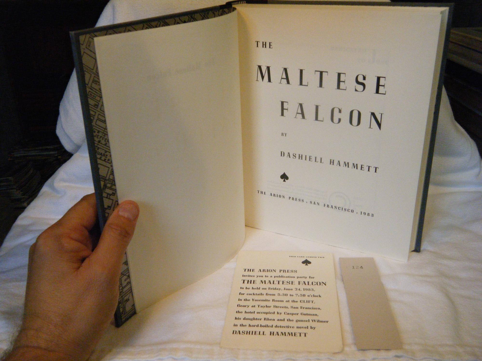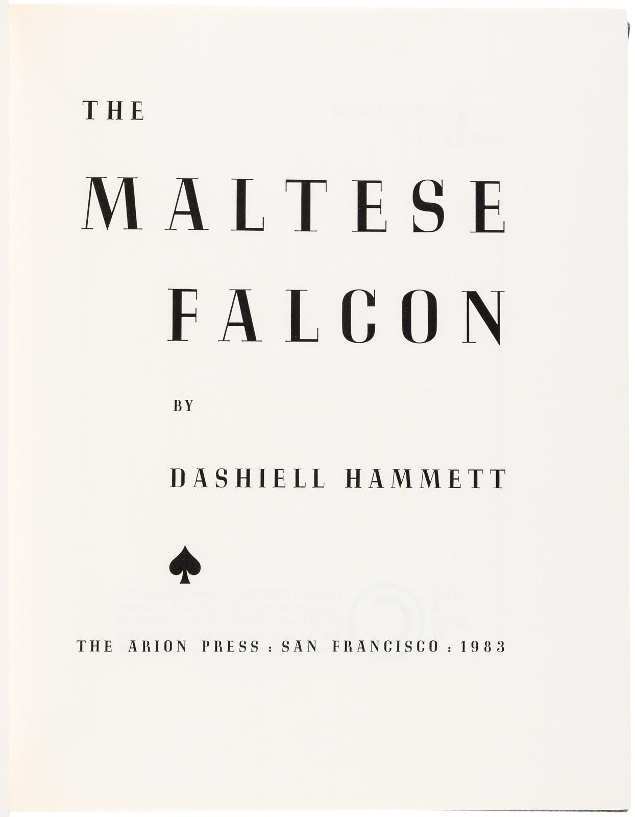Limited edition (400 copies) of The Maltese Falcon by Dashiell Hammett (1894–1961). Published by Arion Press, San Francisco 1983. Illustrated with photographs of Sam Spade’s San Francisco. Original morocco backed cloth, morocco onlay to covers, slipcase, invitation card for publication party laid in.
