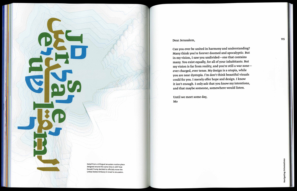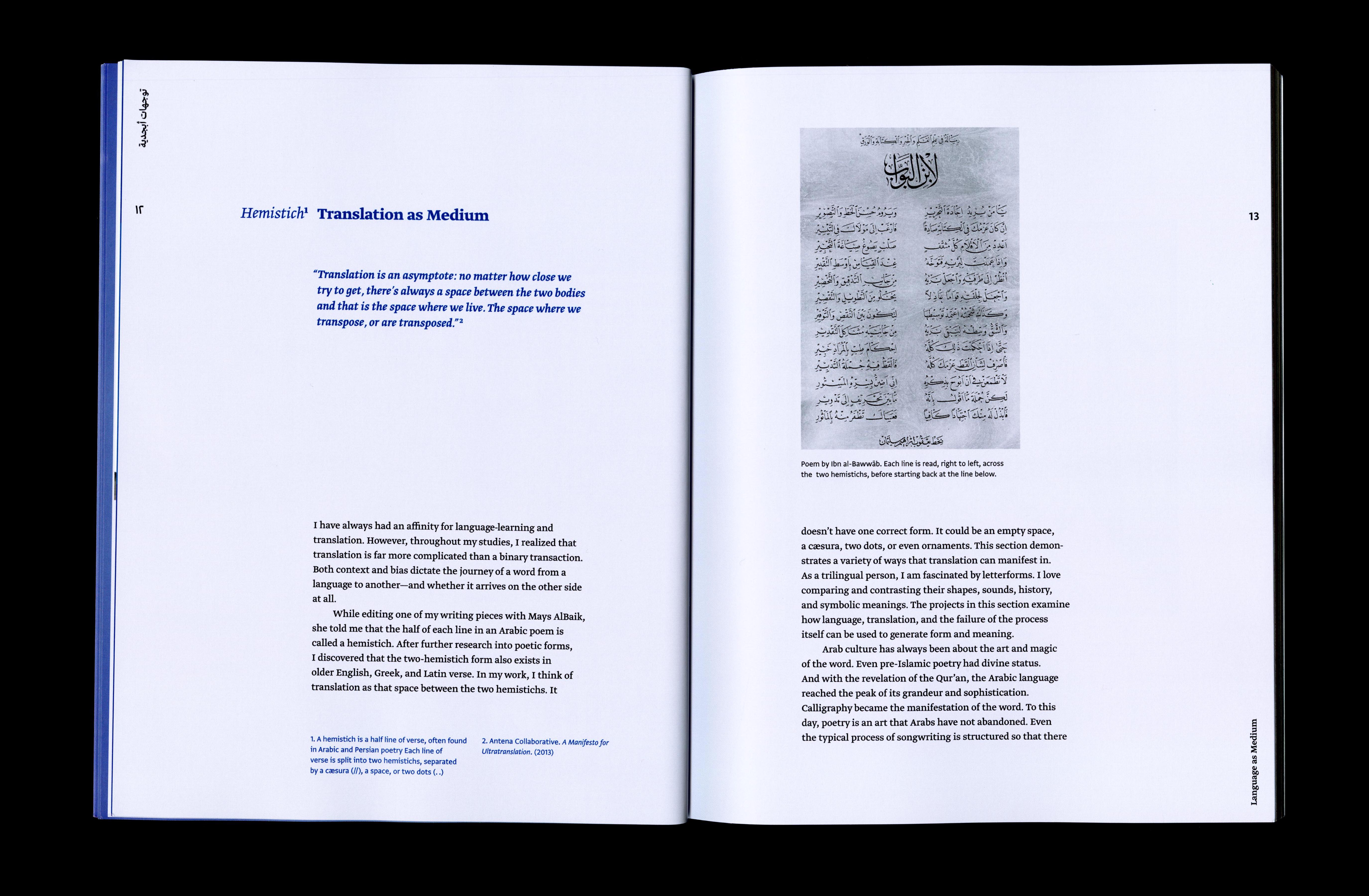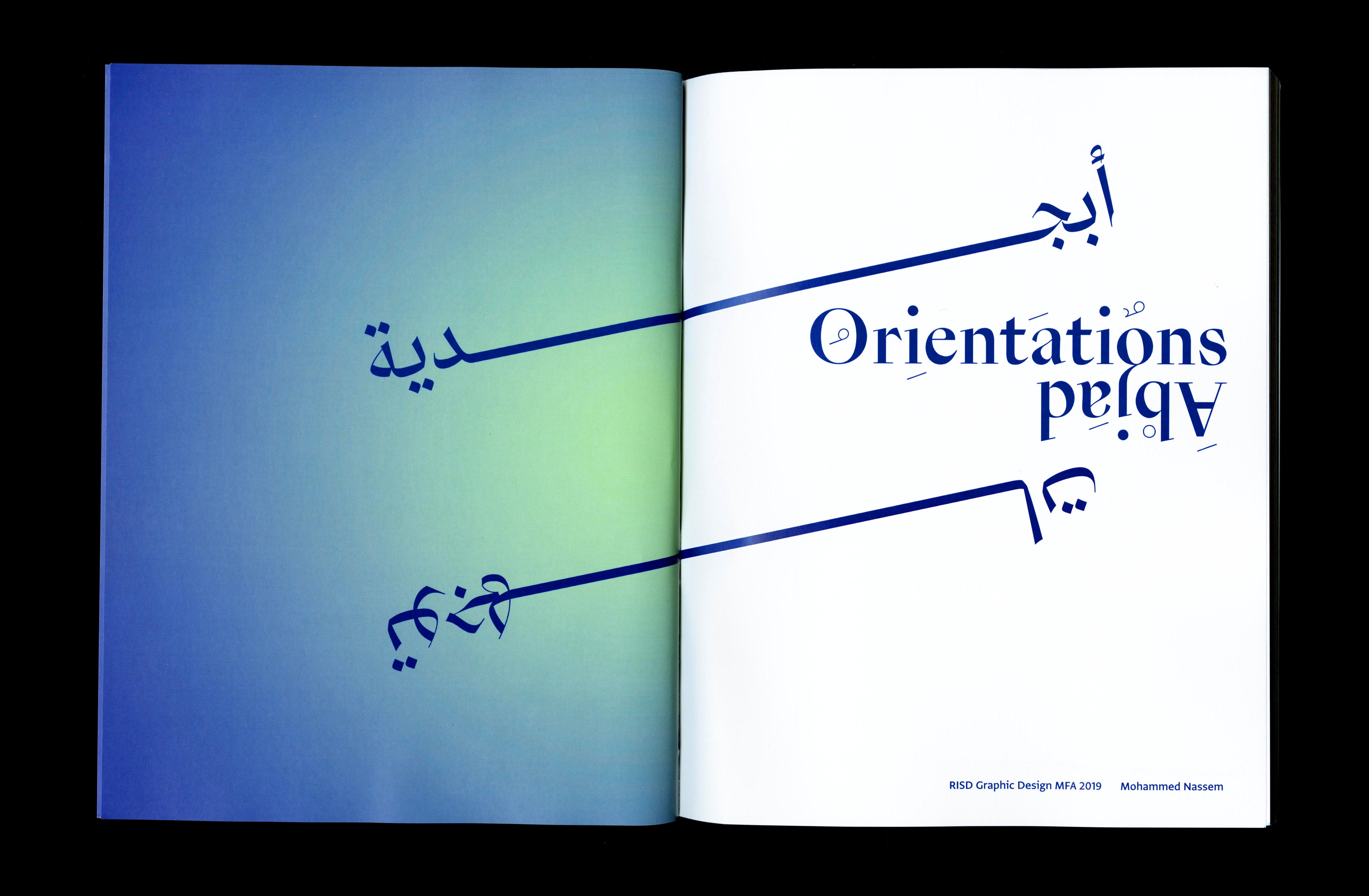 Abjad Orientation is a Graphic Design MFA thesis designed and written by Mohammed Nassem at the Rhode Island School of Design. The body of work investigates verbal and visual language through a lens of translation, queerness, and diaspora. Abjad Orientations is a process of shifting the focal viewpoint to reorient myself and/or audience and allow for a closer probe of cultural reality. My eclectic identity as a queer, muslim, multilingual Arab living in the United States drives the form and content of the design inquiries to reconcile one or more aspects of selfhood.