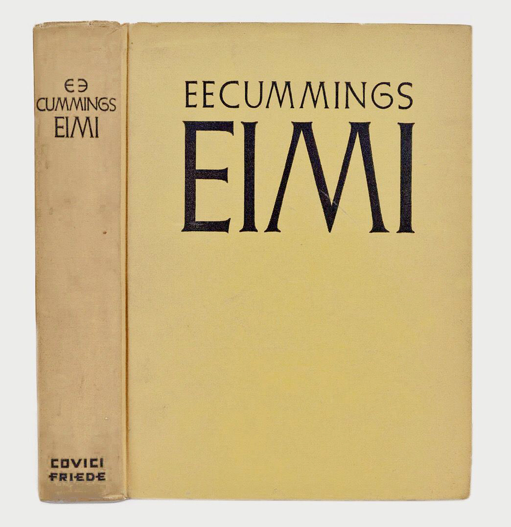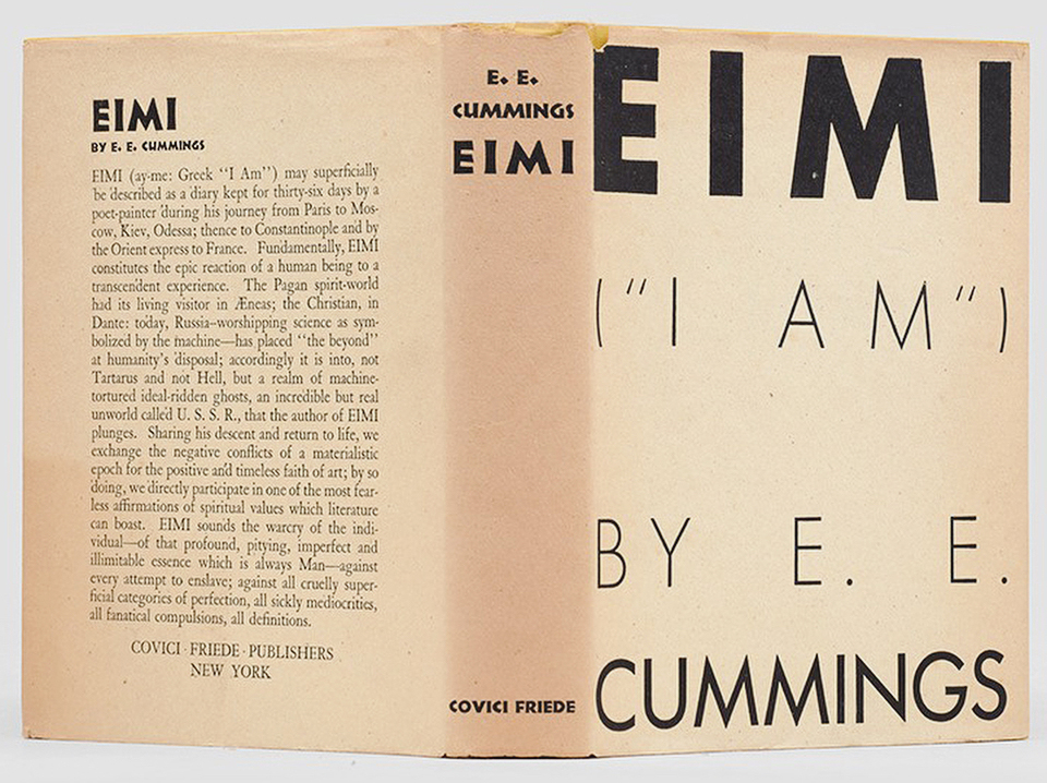 First edition of EIMI (“I Am”), E.E. Cummings’s stream-of-conscious travelogue of his 1931 trip to the Soviet Union, published in 1933 by Covici Friede.