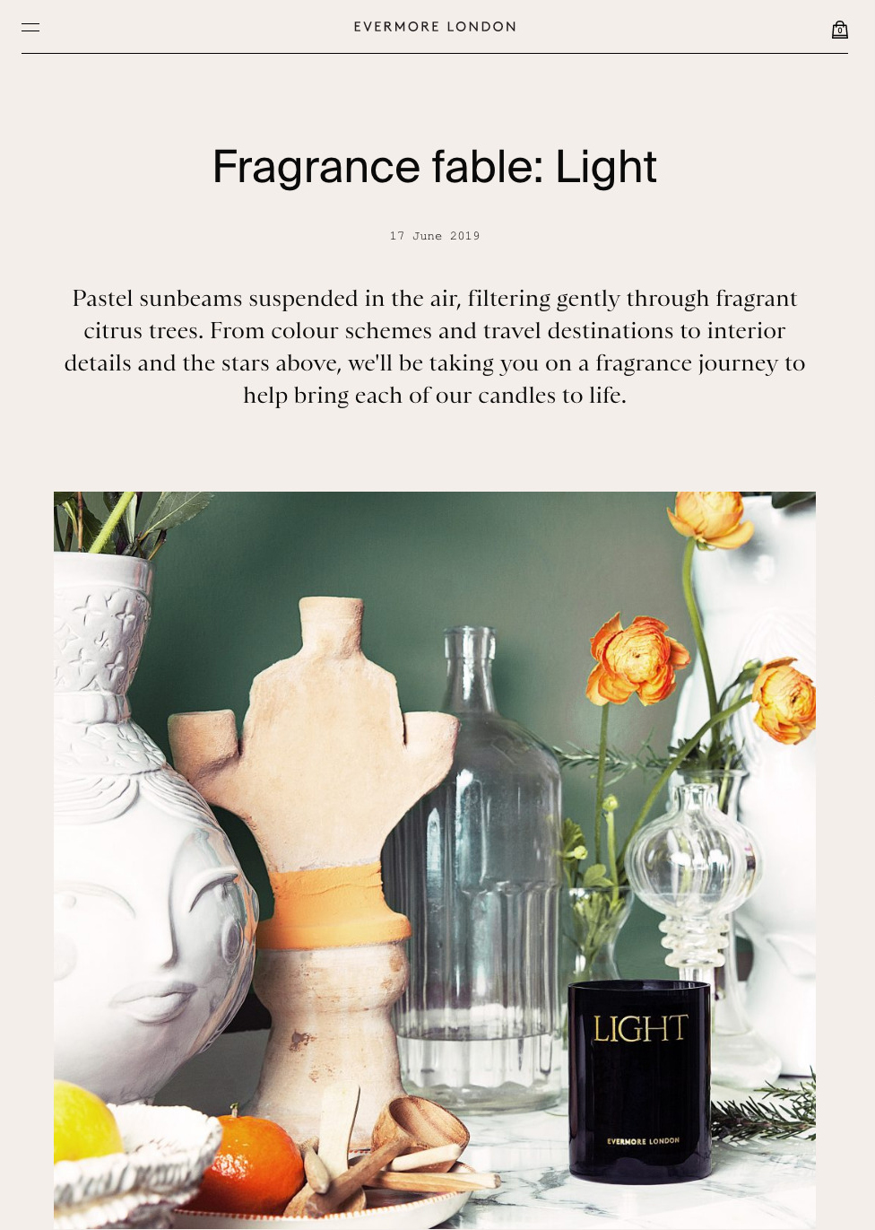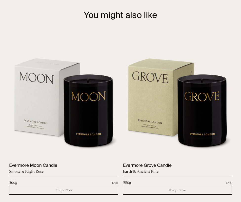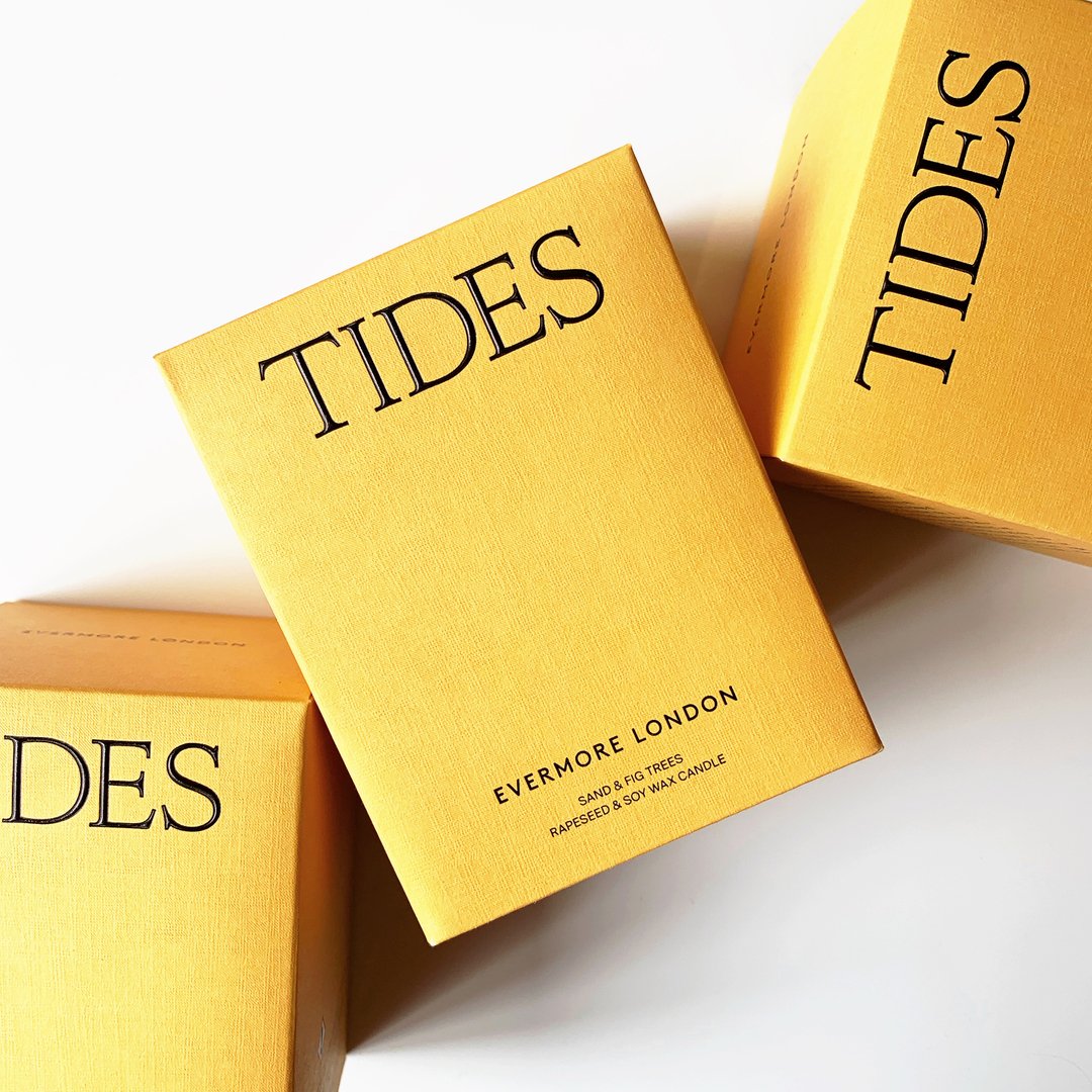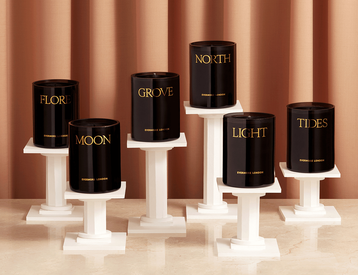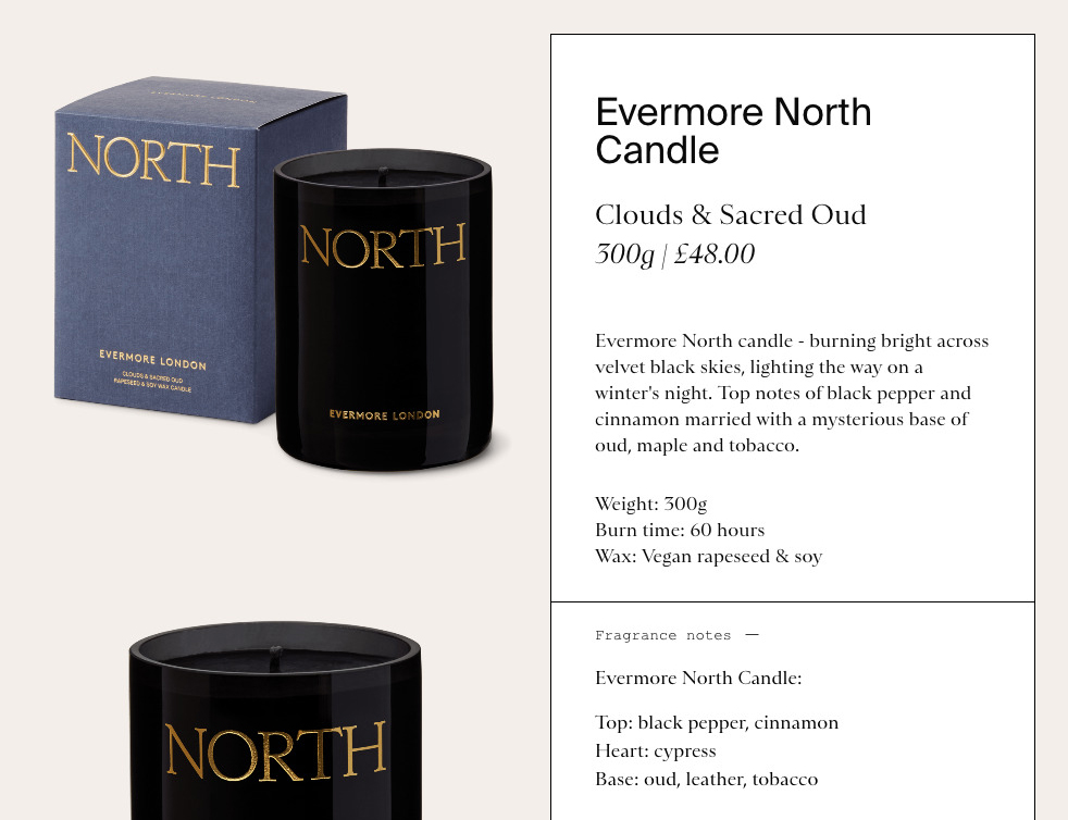 Sainte Colombe is the typeface chosen by POST for the packaging and the website of Evermore London Candles. The delicate serif by Production Type appears in raised caps to present the fragrance names on the colored boxes. It’s contrasted with a logo set in the sans-serif LL Brown. Sainte Colombe also serves on the website, where it’s used for body copy in journal posts and for description texts in the online shop. Here it’s combined with Suisse Int’l (headings) and Courier New (labels and buttons).