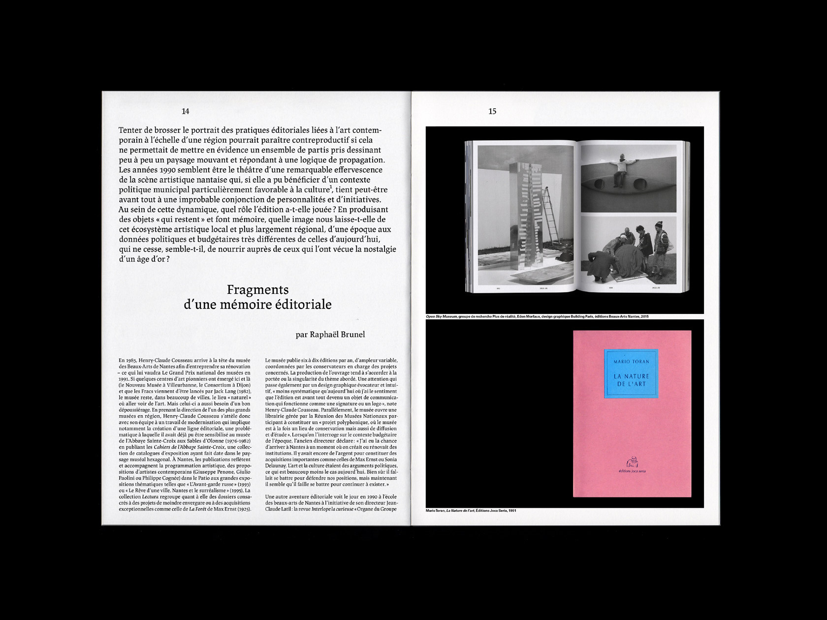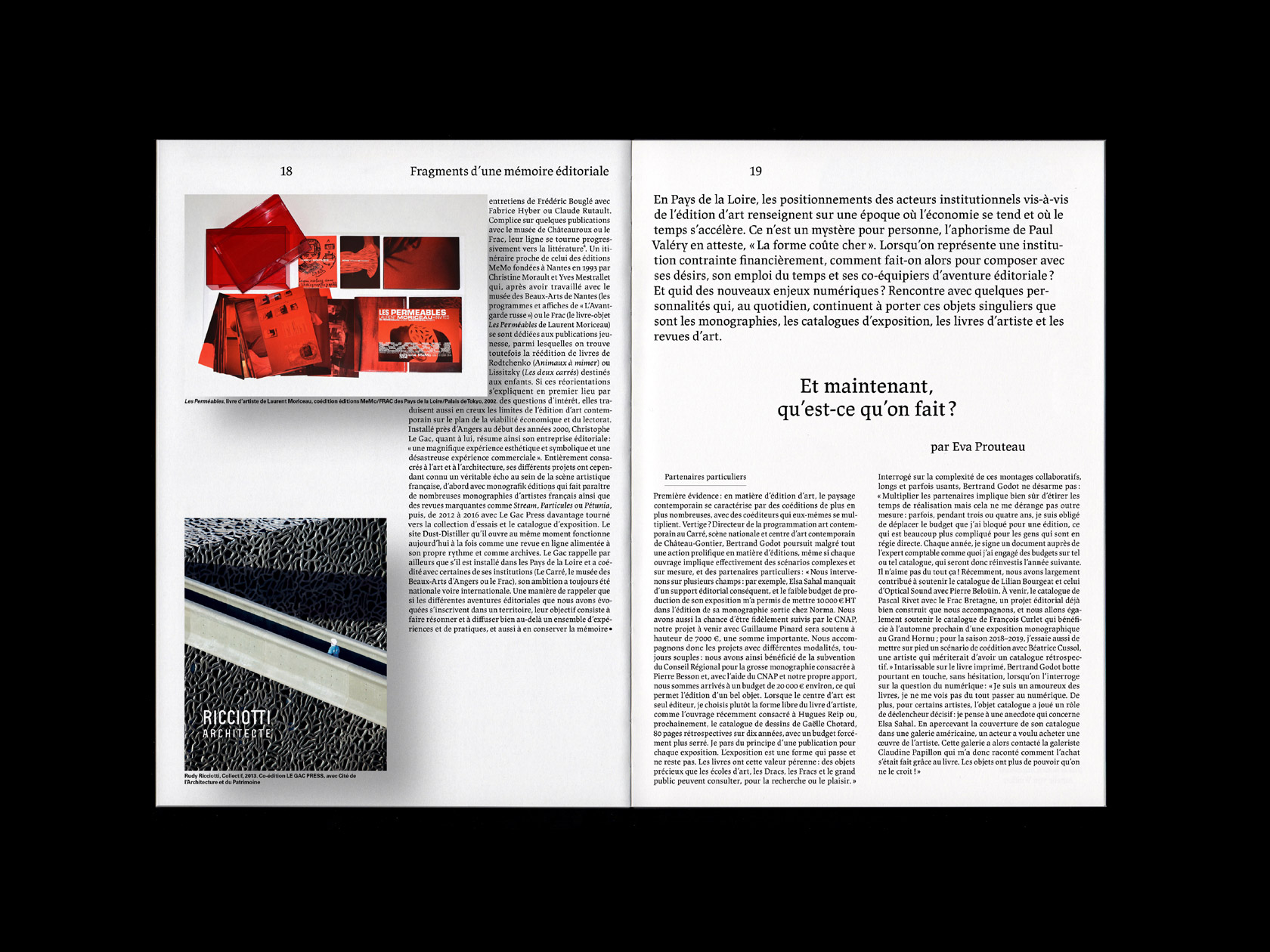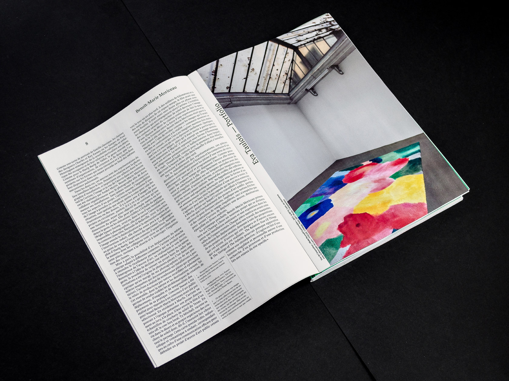 At the occasion of the 6th issue, we reinterpreted the design created in 2002 by highlighting its most recognizable characteristics. This dense magazine, with its irregular text-image balance, meant finding a functional and vivid solution. We chose to give a great rigor to the sequence of theoretical texts and interviews, but to overcome this rigor by the arbitrary introduction of images that disturb the grid, to float above the texts. In the Portfolio section, maximum exposure is given to artists’ works and exhibition views with full-frame photos for immersion. — GeneralPublic