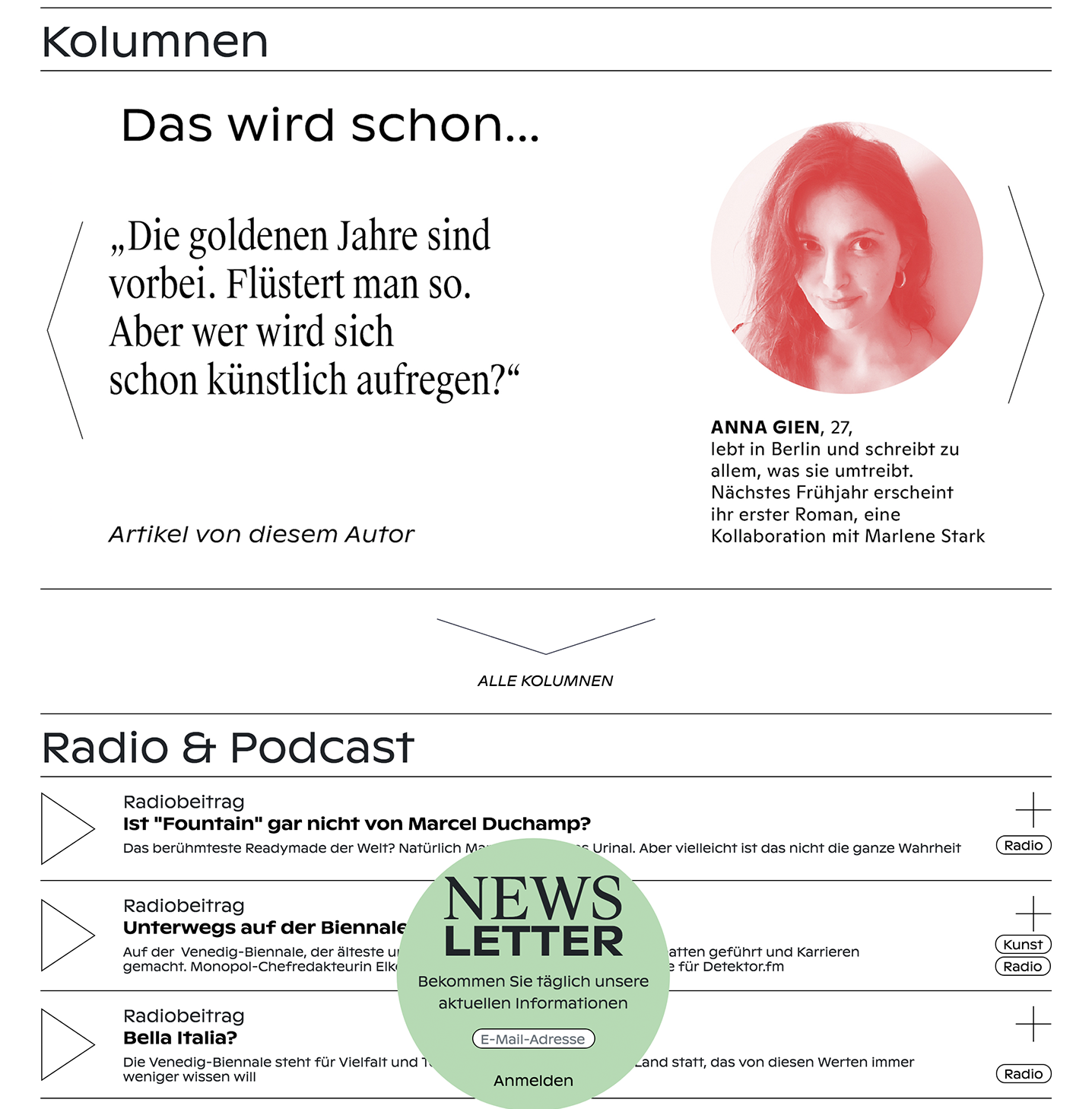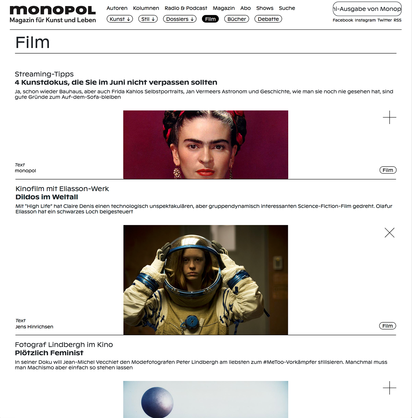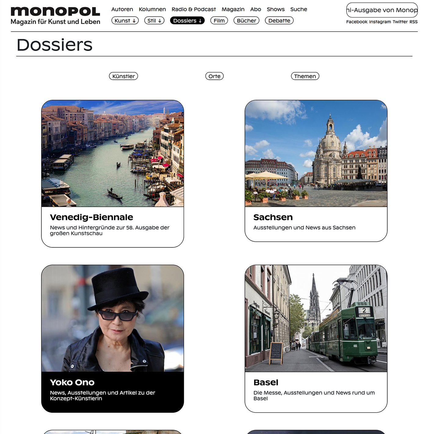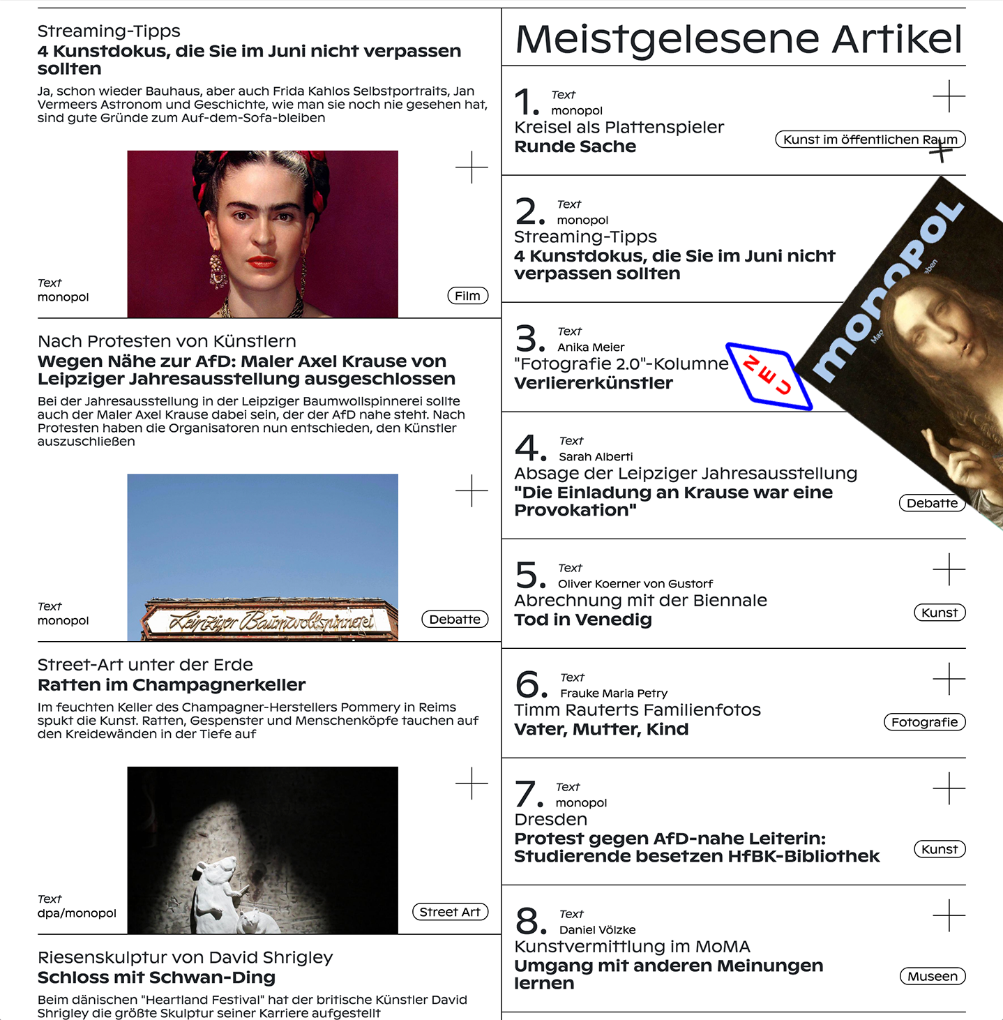 Pop paired with formal stringency – our redesign for the website of the German art magazine Monopol presents new features and a distinct design that combines clarity and playfulness. The main typeface is Seb McLauchlan’s ABC Ginto Nord (Dinamo, 2018). The wide sans is used in several of its sixteen styles. Featured in a supporting role is the serif Suisse Works (Swiss Typefaces, 2015).