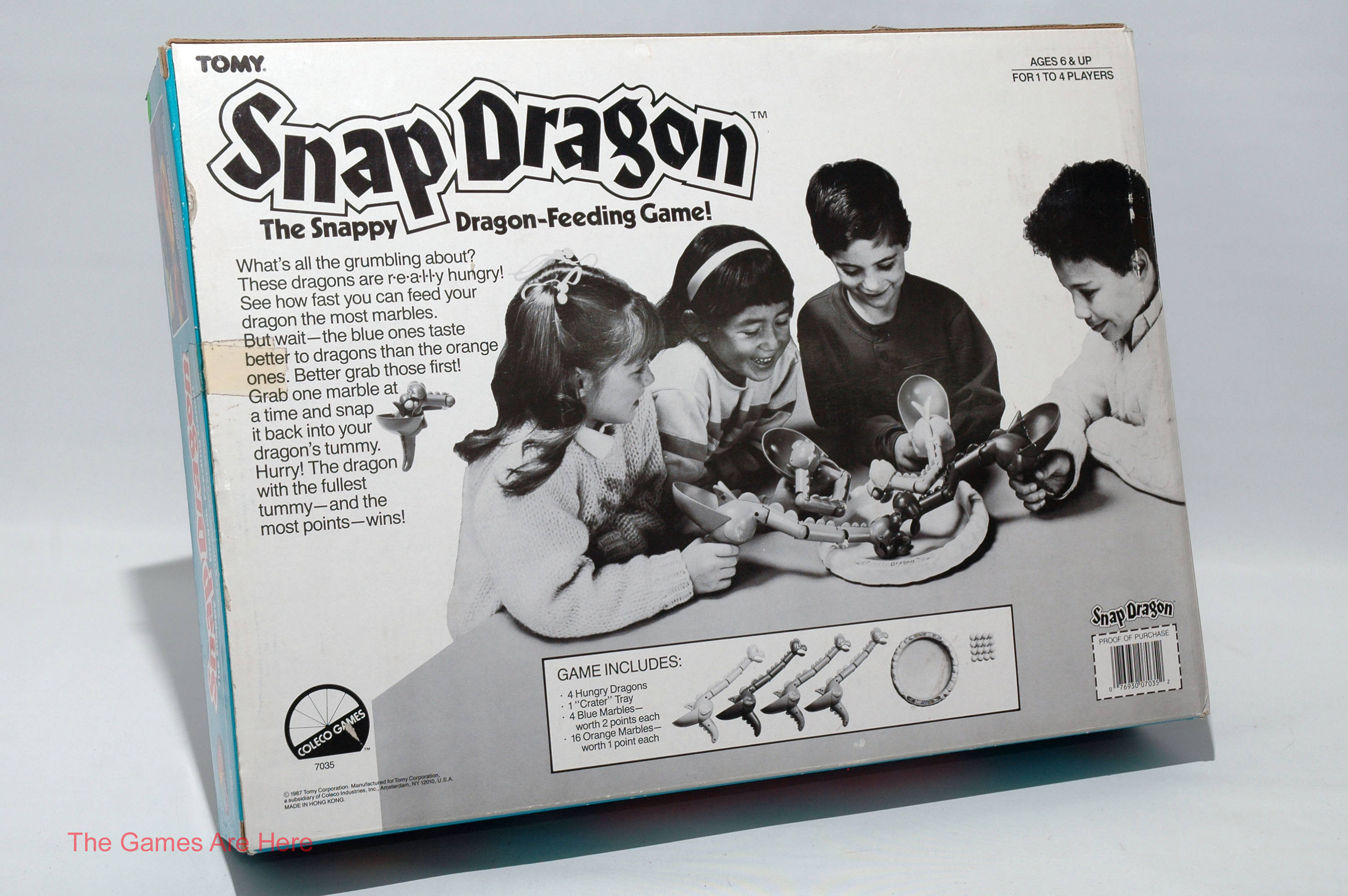 ITC Honda (1970) is used for the logo of Snap Dragon. “The snappy dragon-feeding game” was first published by Tomy Corporation, then a subsidiary of Coleco Industries, Inc., Amsterdam, NY, in 1987. The game was also known as De gulzige draken (Dutch) and Dragons affamés (French).