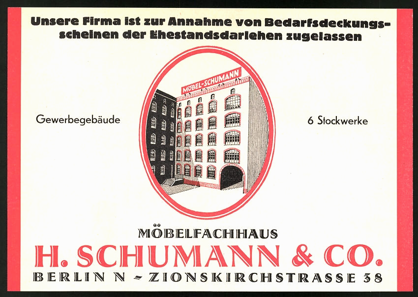 Letterhead for the furniture store of H. Schumann & Co., proudly depicting the six-story commercial building at Zionskirchstraße 38 in the north of Berlin. The design is undated. The company is not yet listed in the 1922 issue of Berlin’s Branchenbuch (yellow pages). H. Schumann & Co. appeared in 1927 (then on no. 30). It was on no. 38 in 1941. By 1948, it had moved to nearby Zehdenicker Straße 5.