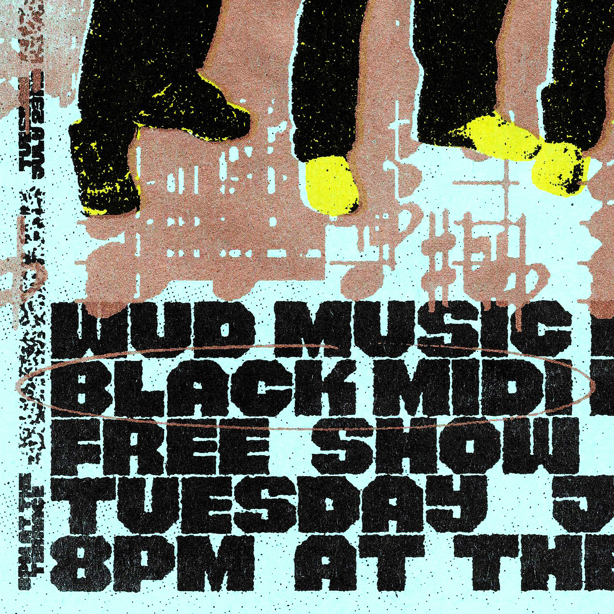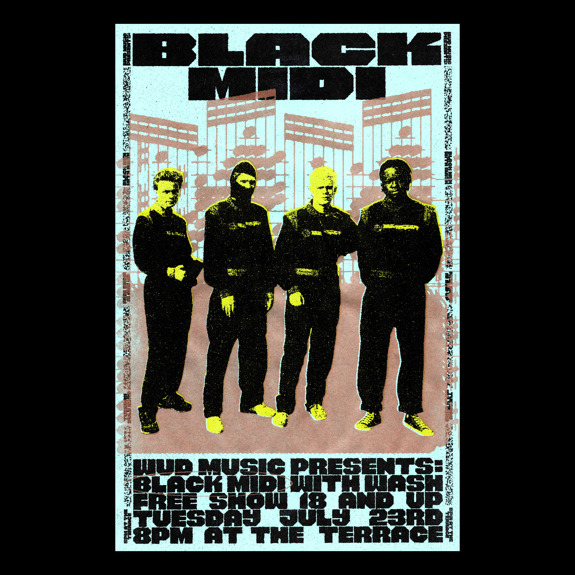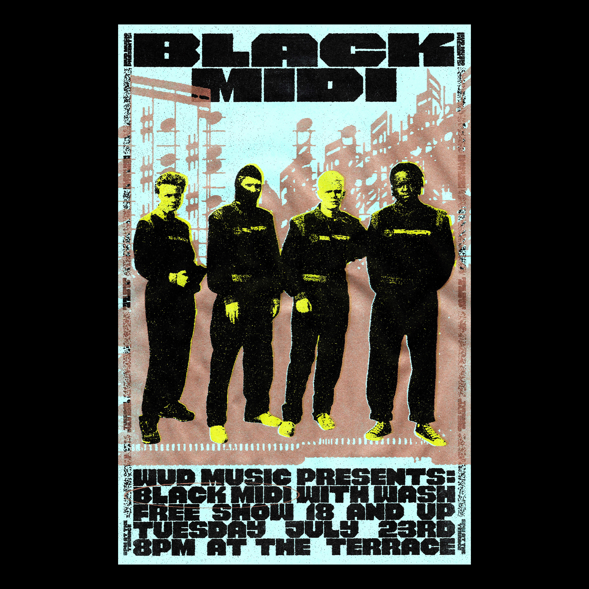 A series of risograph concert posters for Black Midi at the Terrace in Madison. Black Midi’s music is chaotic, experimental, and frenetic prog rock. The band is named after an electronic genre where the computer is overwhelmed with impossible music arrangements of thousands of stacked notes. I pulled some of these weird compositions from YouTube videos to make up the background shapes.