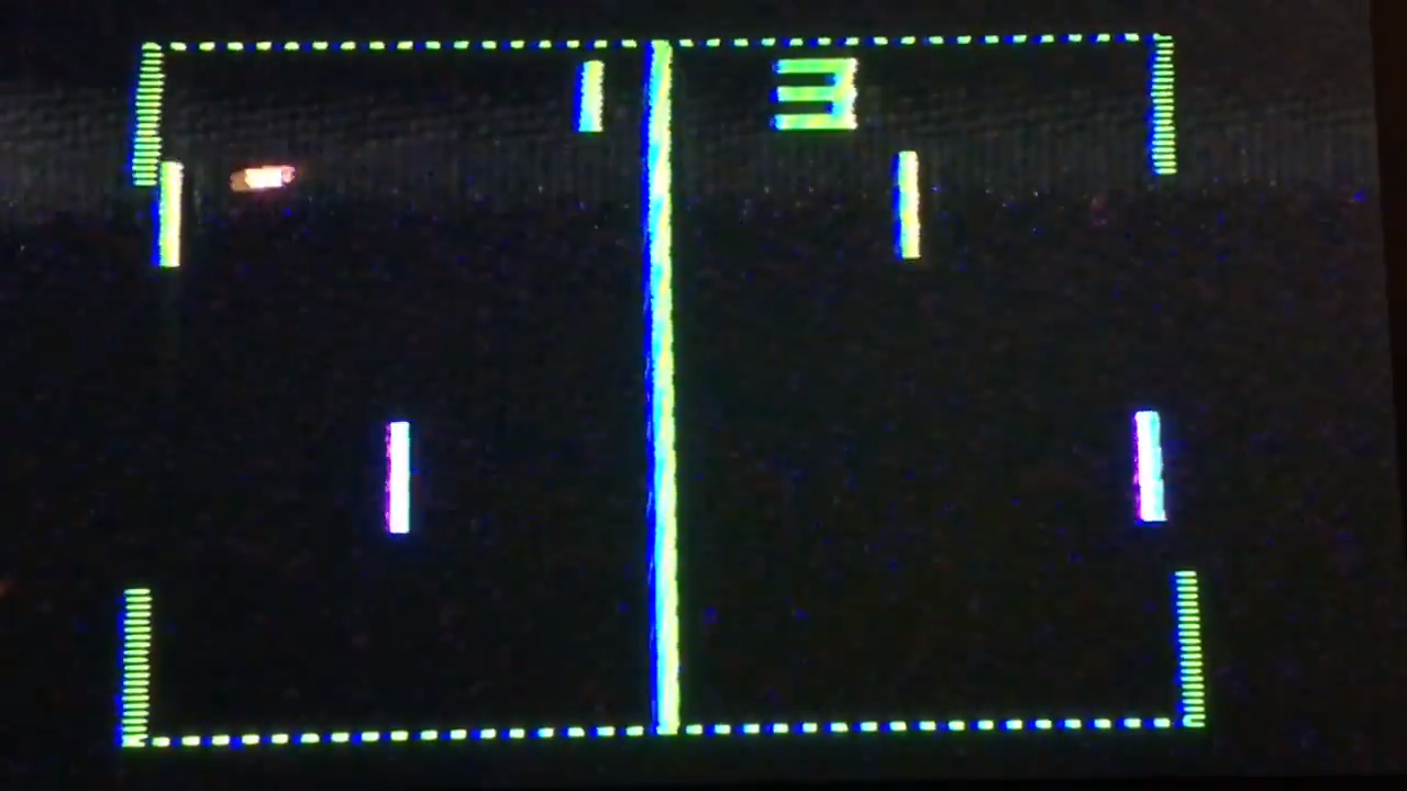 Well, this is excessive. Instead of two controllers, let’s have two consoles! Aside from the clunky design, the game works okay, except the right controller’s a little jittery. That’s what happens – the thing about these Pong consoles, and one of the things that make them so fun to play, is that the paddles move so fluently. It’s like an analog control that doesn’t exist in games today. The downside is that they break easily, and sometimes you get this jittery movement.