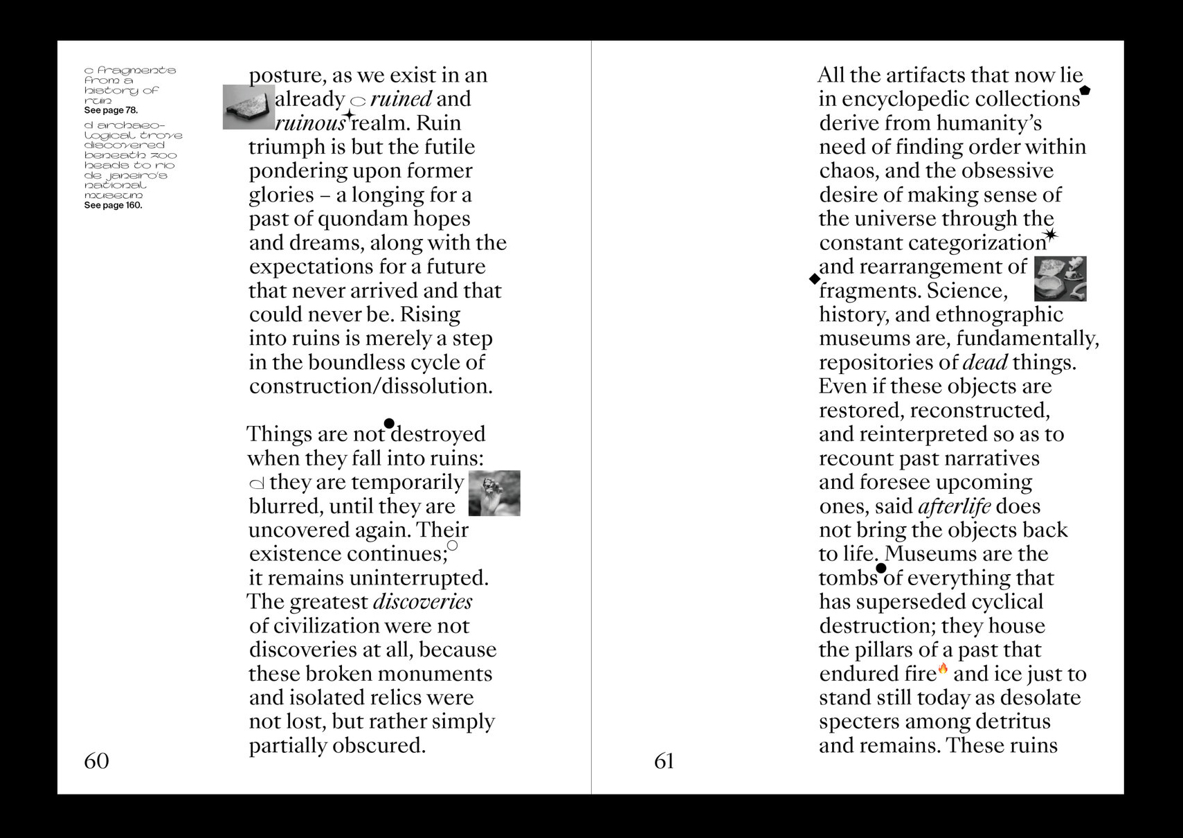 The reader, then, comes as an attempt to do so. It exists as a book, wall, vitrine, and shelf, simultaneously; as a moment of tension between logic and fantasy, and a space of both containment and dispersal. It stands as a memento mori because in a time when civilization itself is paving the way towards its own destruction, conserving the contemporary comes as a means of critical resistance.