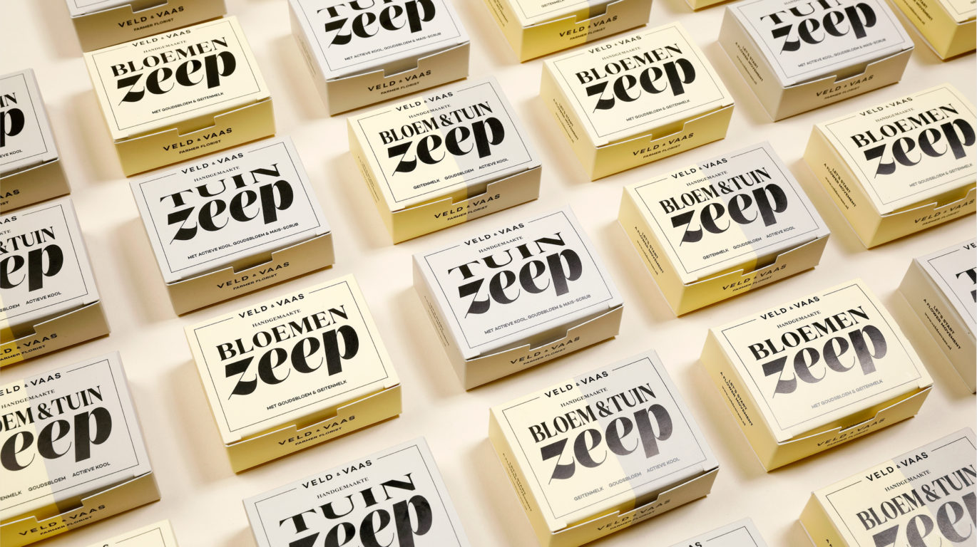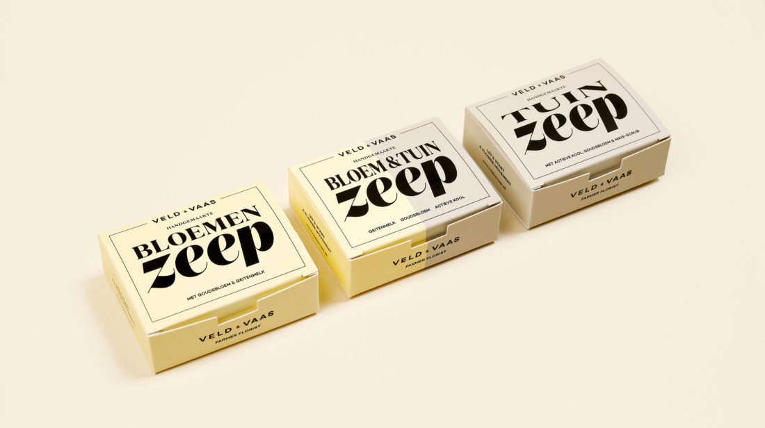 Veld & Vaas presents itself as a symbiosis of two worlds, which formed the starting point for the design of their floral soapboxes (“bloemenzeep”). The packaging is adorned with both serif and sans-serif typefaces; the typefaces Domaine Text & Domaine Display (Klim Type Foundry, 2013), a subtly modified Domaine Sans Display (Klim Type Foundry, 2014), and Campton (René Bieder, 2014).