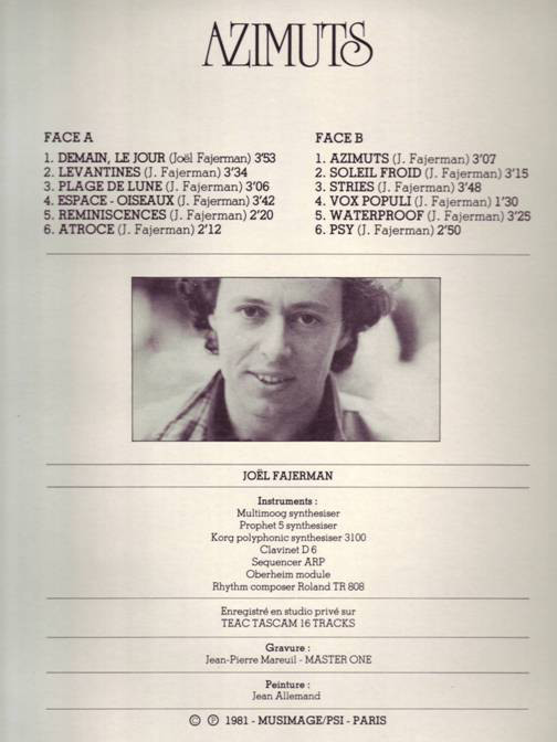 Azimuts is a record album by French electronic music composer Joël Fajerman. It was produced by PSI/Musique pour l’Image. Title set in all-caps University Roman, Stymieis used for everything else. The cover painting is by Jean Allemand. See also Turbulences from 1983.