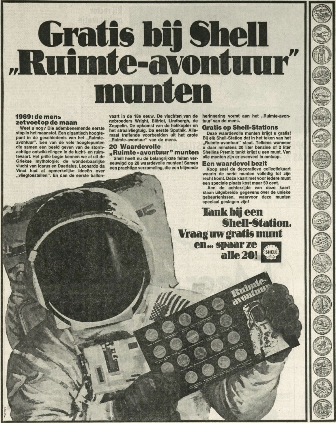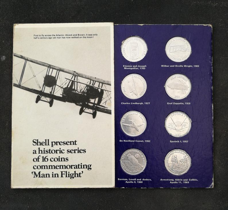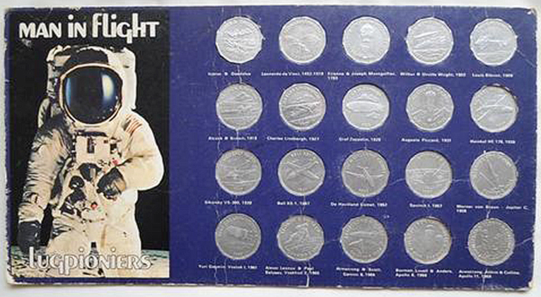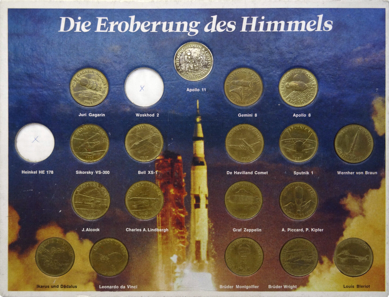 Several months after the successful Apollo 11 mission, Shell somehow belatedly jumped on the moon craze bandwagon and issued a series of coins commemorating milestones from the history of aviation and space travel. The motifs range from Icarus and Daedalus to Armstrong, Aldrin, and Collins. Gas station customers could obtain coins for every bigger purchase and collect them in designated cardboard holders.