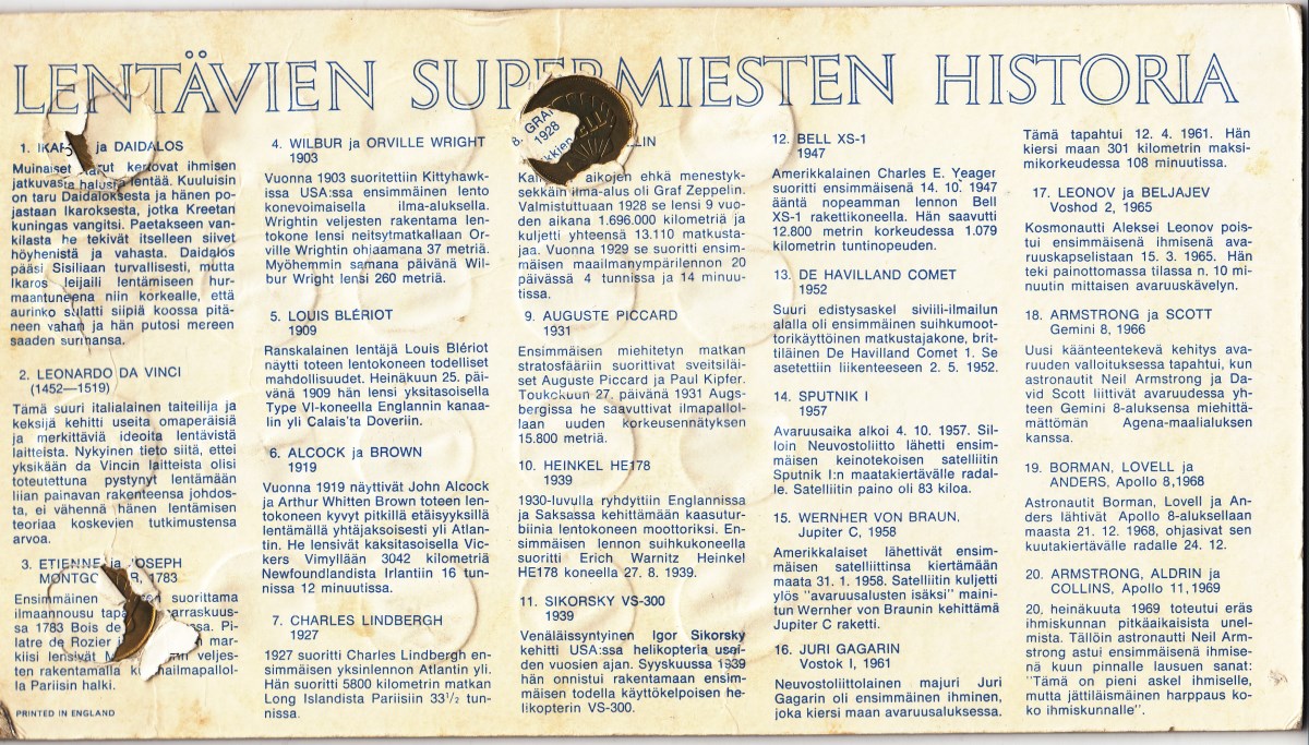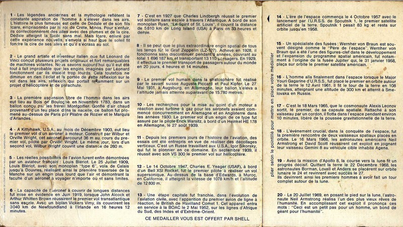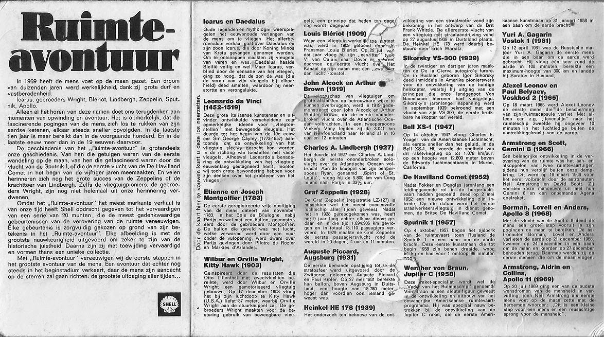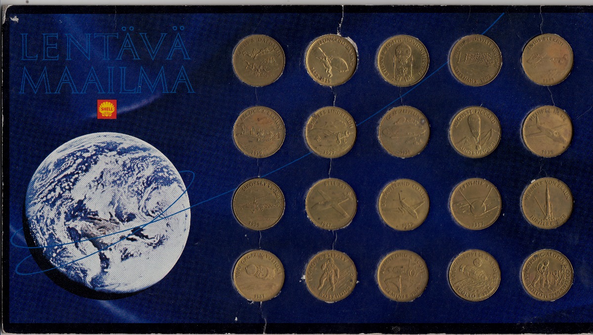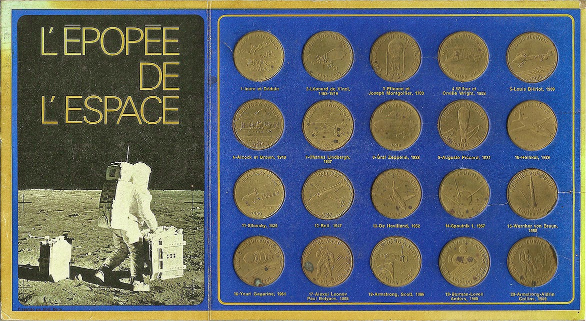 Several months after the successful Apollo 11 mission, Shell somehow belatedly jumped on the moon craze bandwagon and issued a series of coins commemorating milestones from the history of aviation and space travel. The motifs range from Icarus and Daedalus to Armstrong, Aldrin, and Collins. Gas station customers could obtain coins for every bigger purchase and collect them in designated cardboard holders.