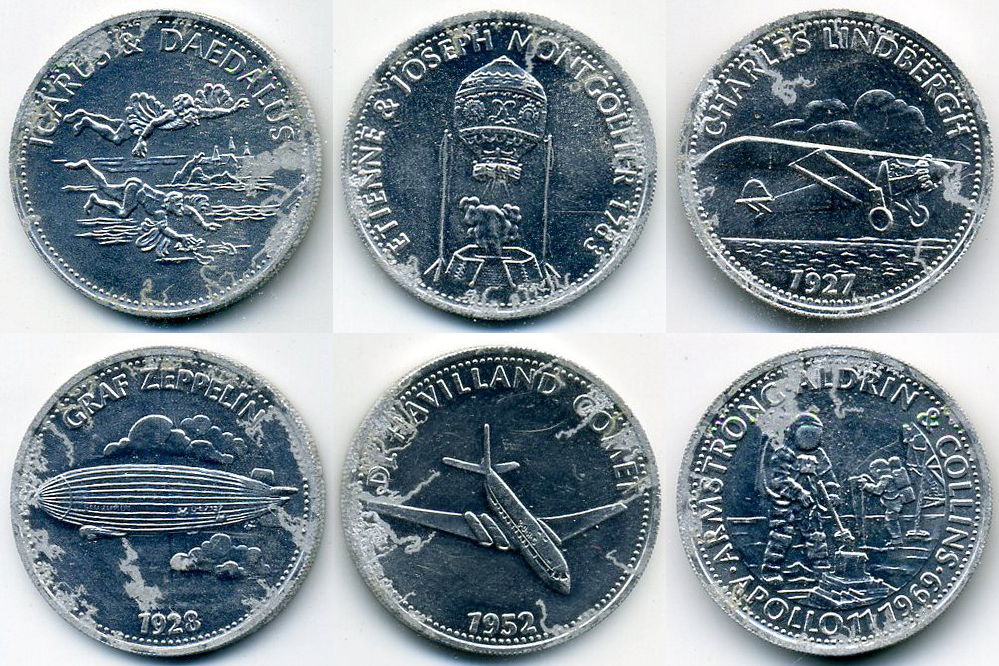 The depicted series were preceded by another set of promotional coins by Shell issued in the United States in 1969. Available in aluminium and bronze, Man In Space focused on the U.S. manned space missions. These coins are not included here.