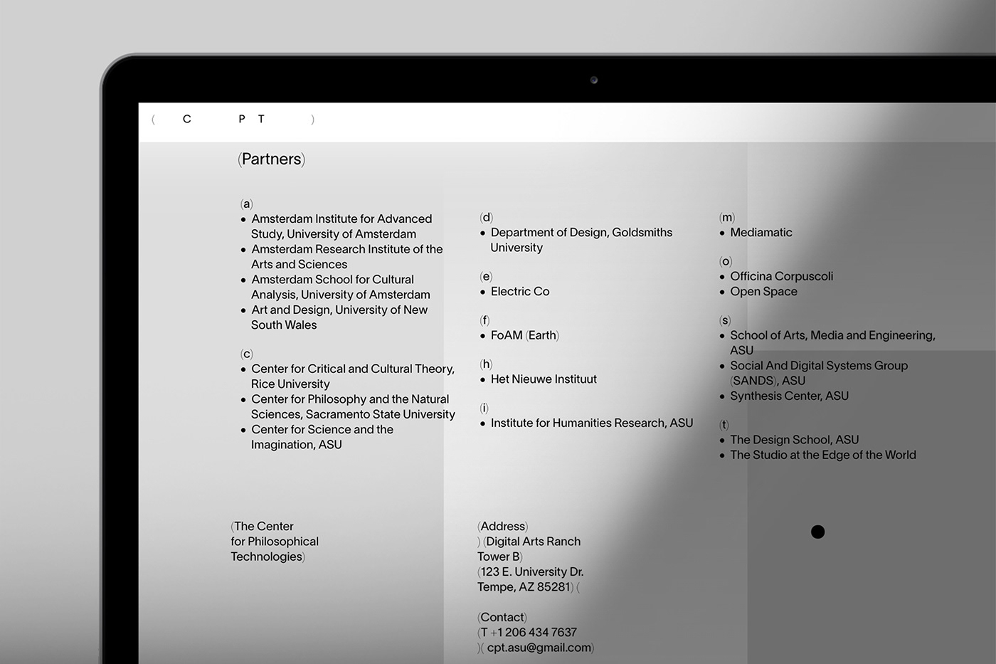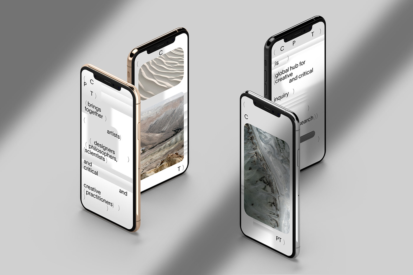 Reflecting the center’s dynamic DIY approach, the logo builds on the acronym (CPT) whereby letters can be arranged freely within the system and are framed by parentheses. Our research into language and expression of ideas through typography led the conceptual rediscovery of parentheses: They allow writers the freedom to provide additional and clarifying information, inserting relevant thought, always providing context and content.