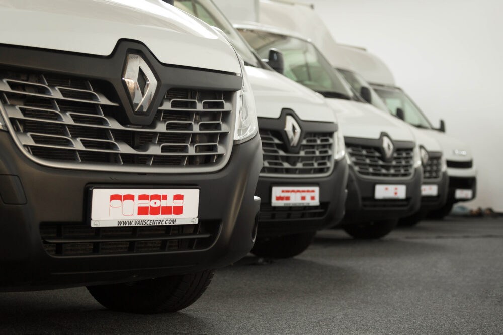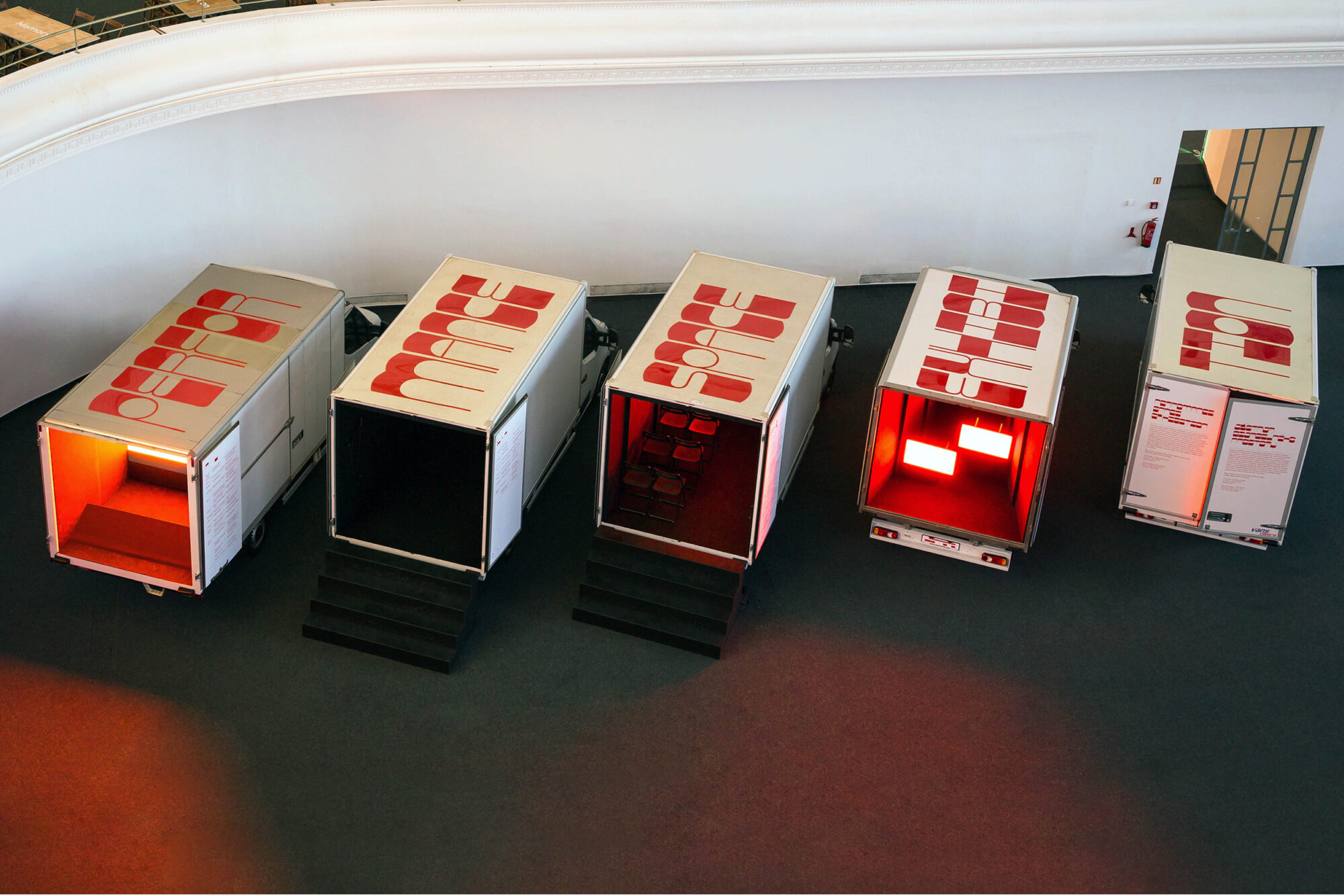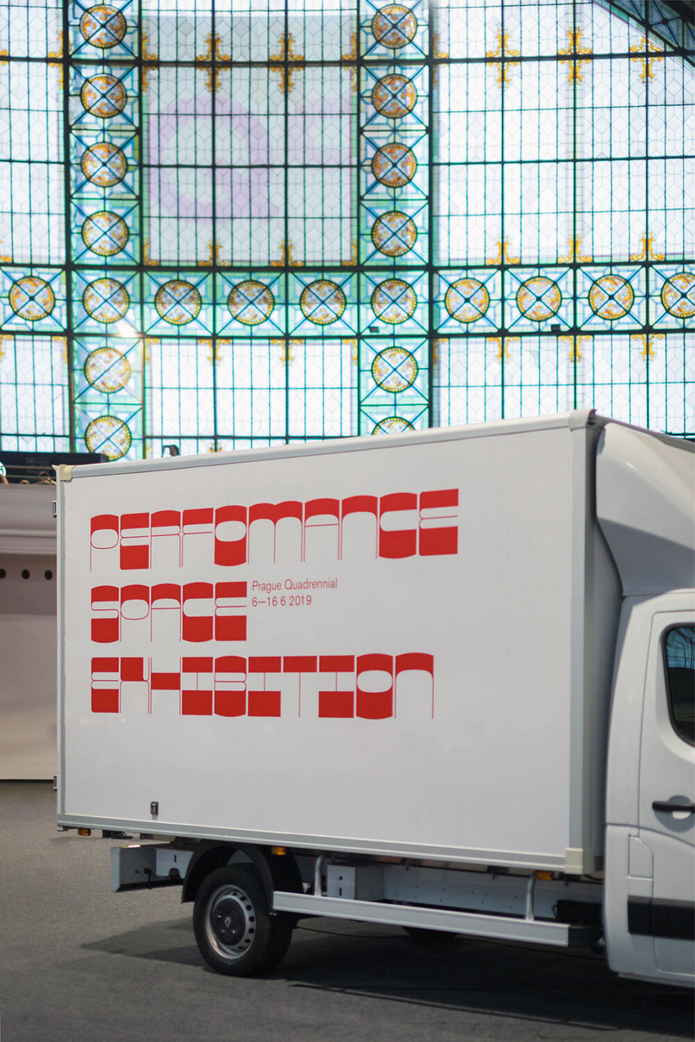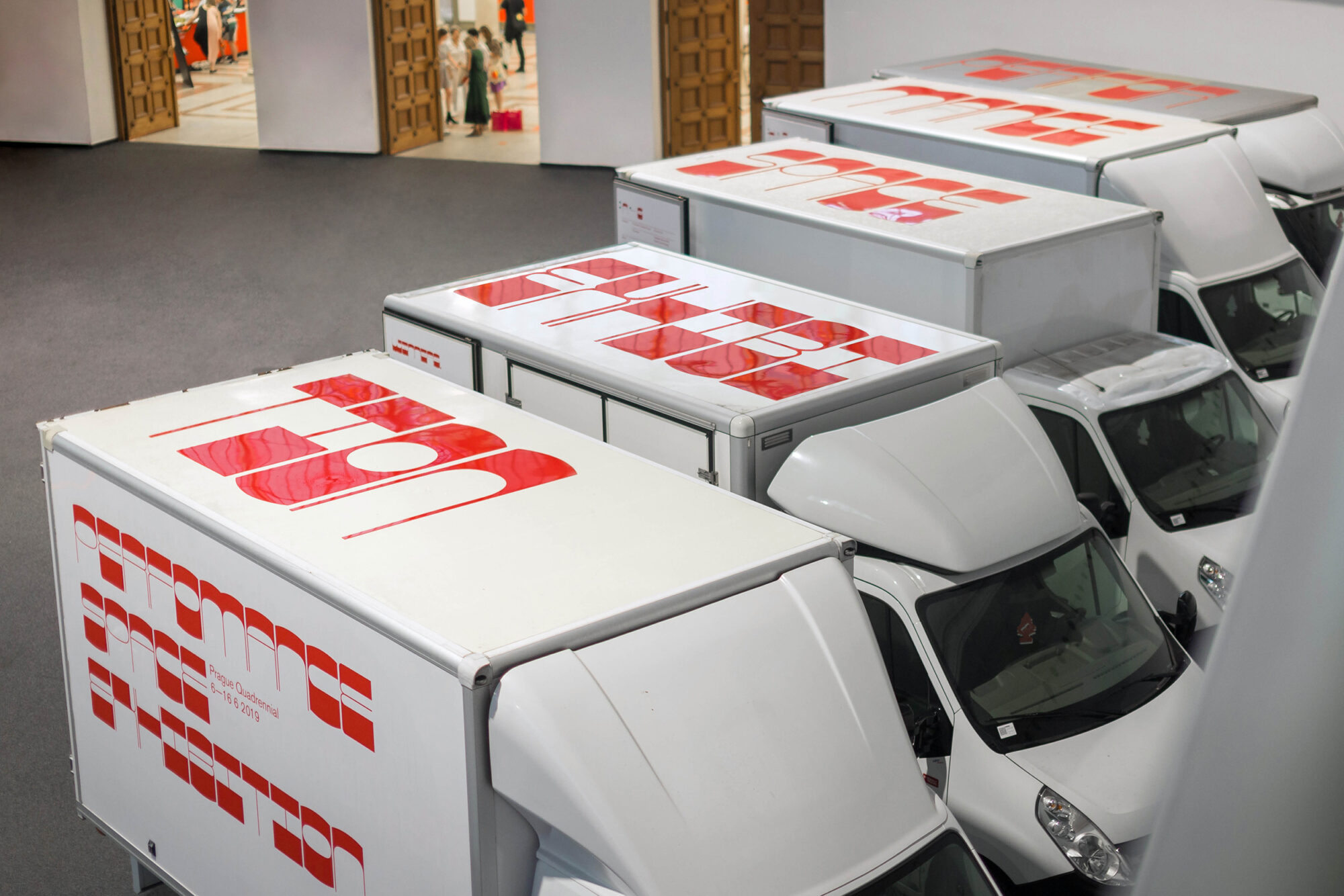 A group of five white trucks is parked in the monumental Výstaviště Praha Holešovice – Central Hall of the Industrial Palace in Prague. Usually this is the kind of vehicle that transports works of art to an exhibition. Here, as a part of the Prague Quadrennial, the trucks themselves are the exhibition space.