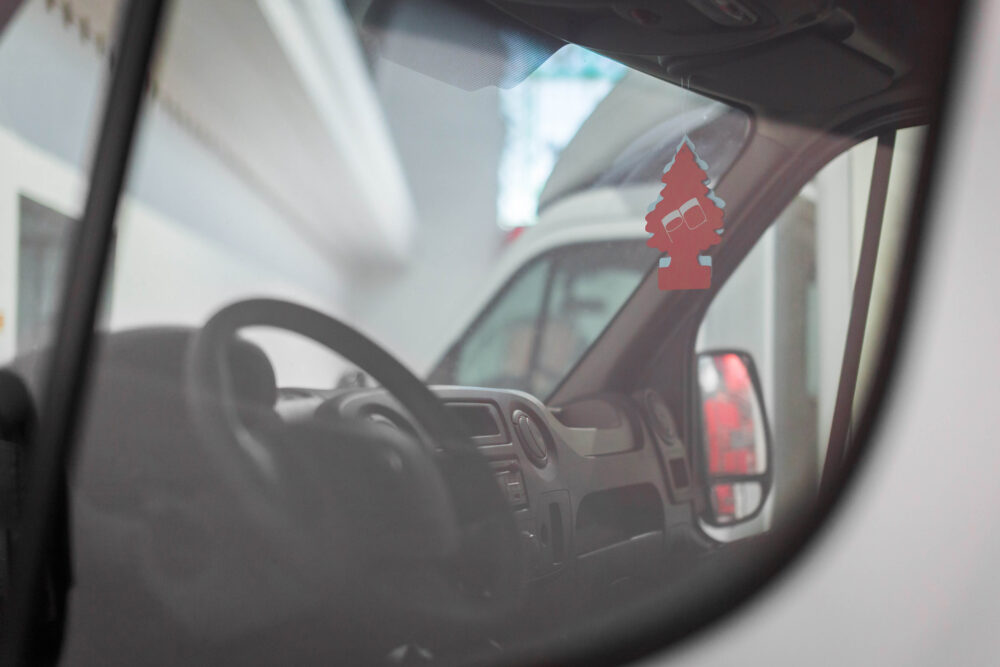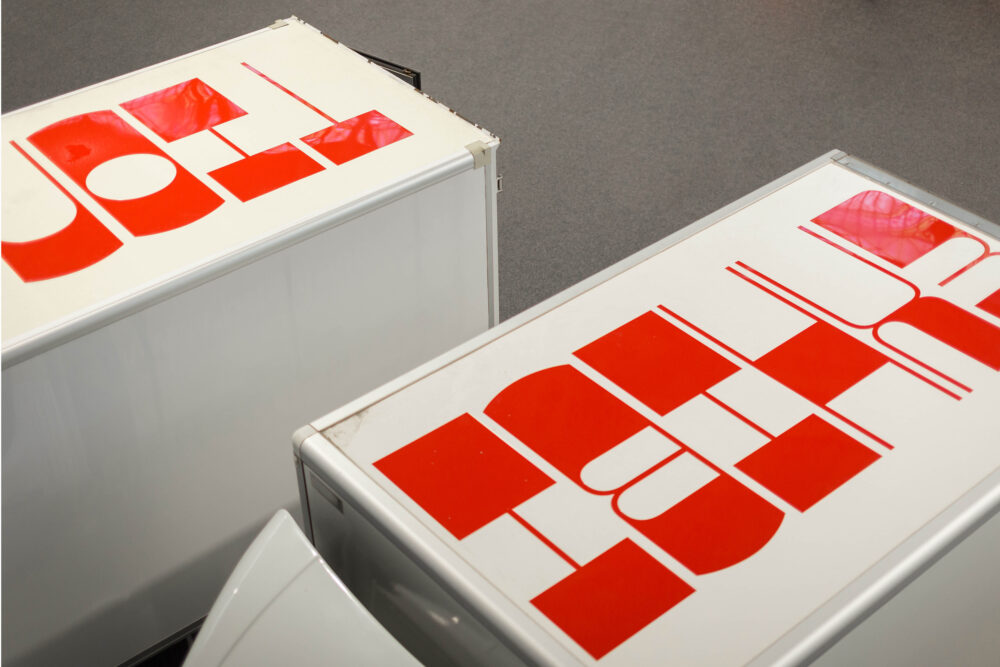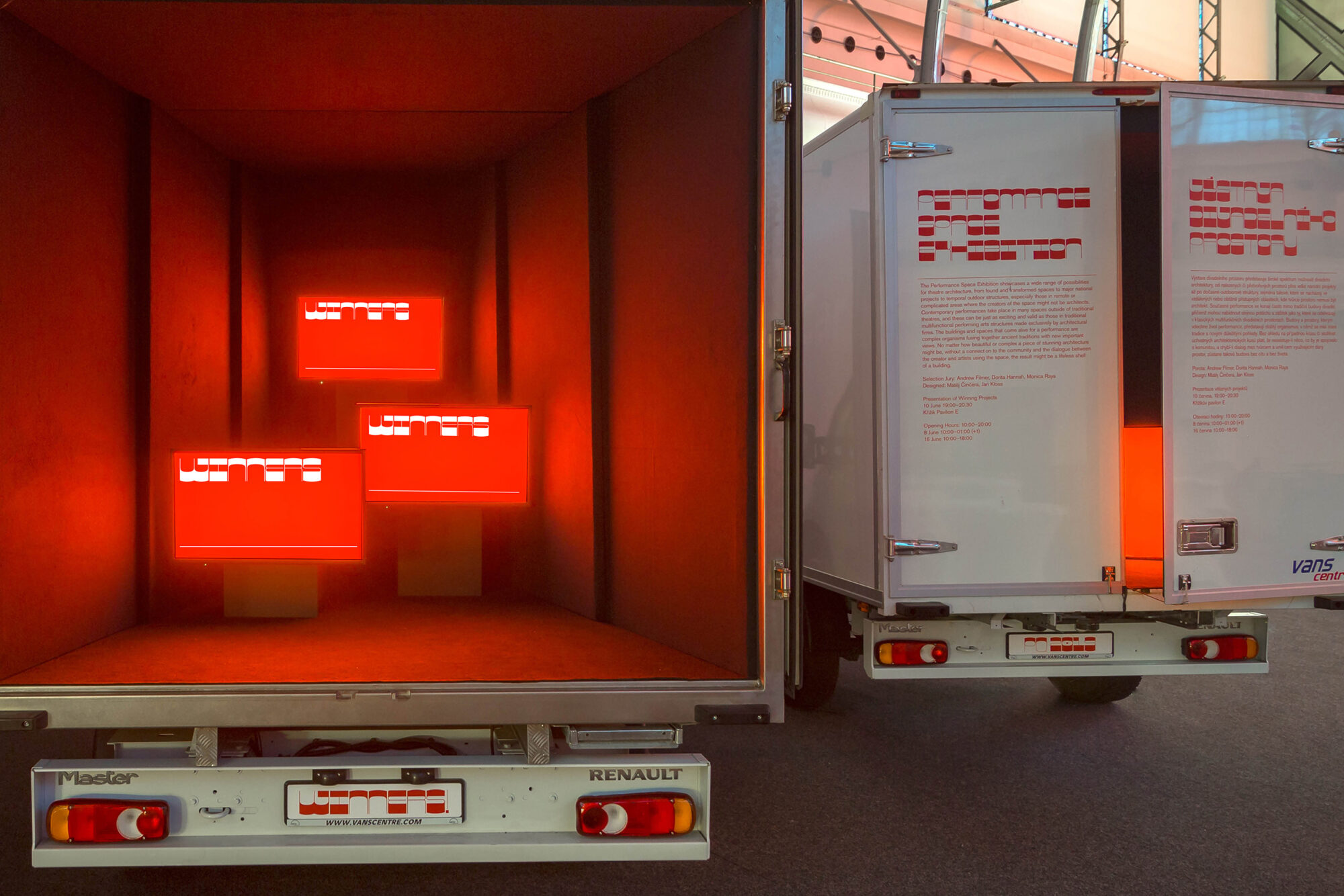 Inside, loading space is repurposed as display cabinet and cinema; on the outside, designers Matěj Činčera and Jan Kloss left no possibility unused to brand the vehicles with vibrant red typography. From the installation art itself and the type on the roof to number plates and the obligatory Wondertree air freshener: the high contrast Zoo (designed by Quentin Coulombier and available from Blaze Type) is used throughout. Its offbeat shapes are counterbalanced by straightforward typography with programme information, using Akzidenz-Grotesk.