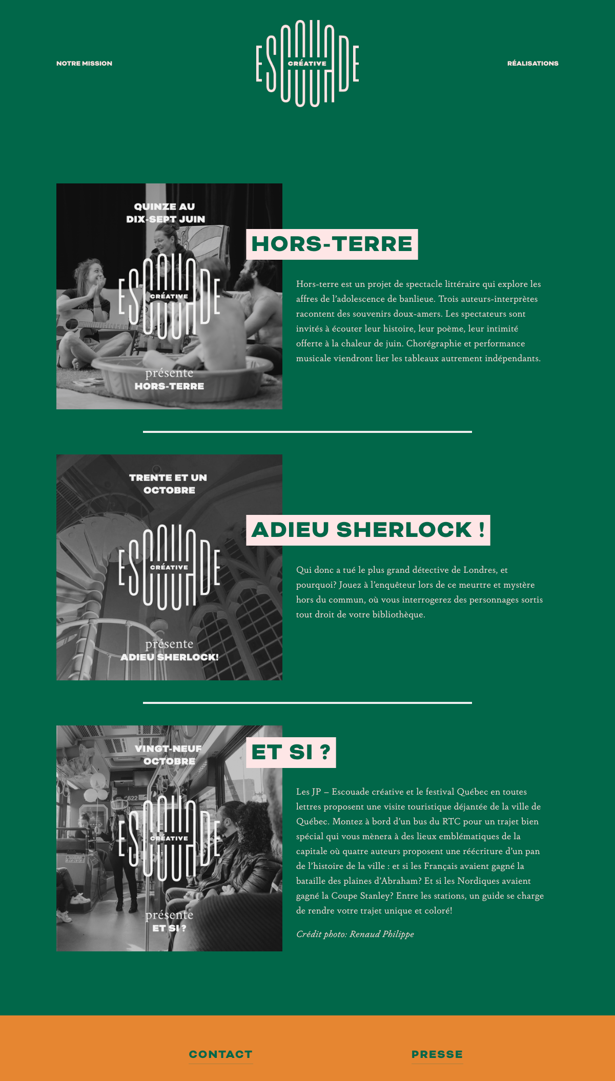 L’Escouade Créative is a multidisciplinary literary collective that seeks to make literature accessible by celebrating it. The members organize events in unexpected places and with unexpected mediums (digital, historical, etc.). For example, they did a show about What-Ifs of Quebec’s history which took place on the city’s bus transit.