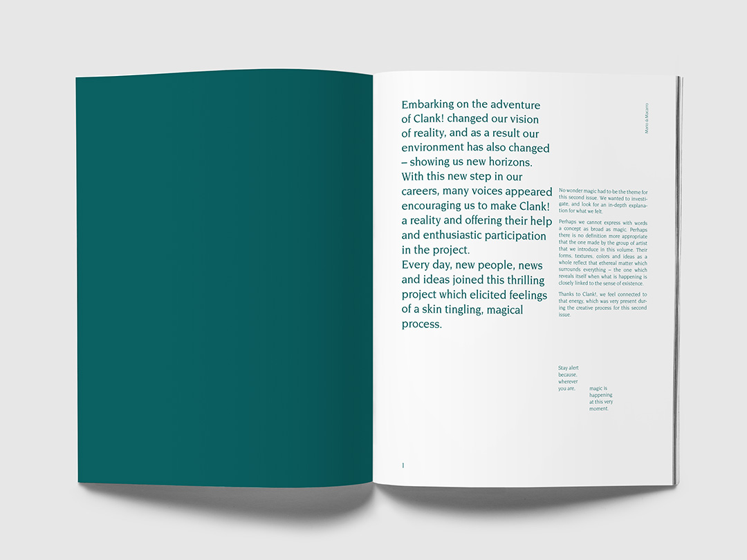 Clank! was born out of the need of two professionals, the photographer Juan Manuel Macarro and the multidisciplinary space Maant Studio. They wanted to explore new creative fields, to get out of the traditional editorial esquema, exploring all kinds of artistic disciplines.