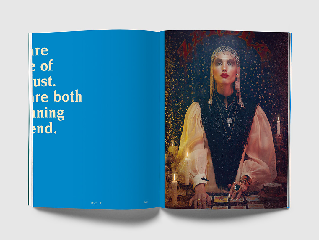 This issue is dedicated to magic, as an homage to the feeling that creating this magazine produces. Inspired by the grimorios (old magic books) it’s divided in 3 chapters: origin, life and end. The “occult” concept runs through all the content using different resources like UV tints, overlays, gradients, folded pages, and hidden elements.