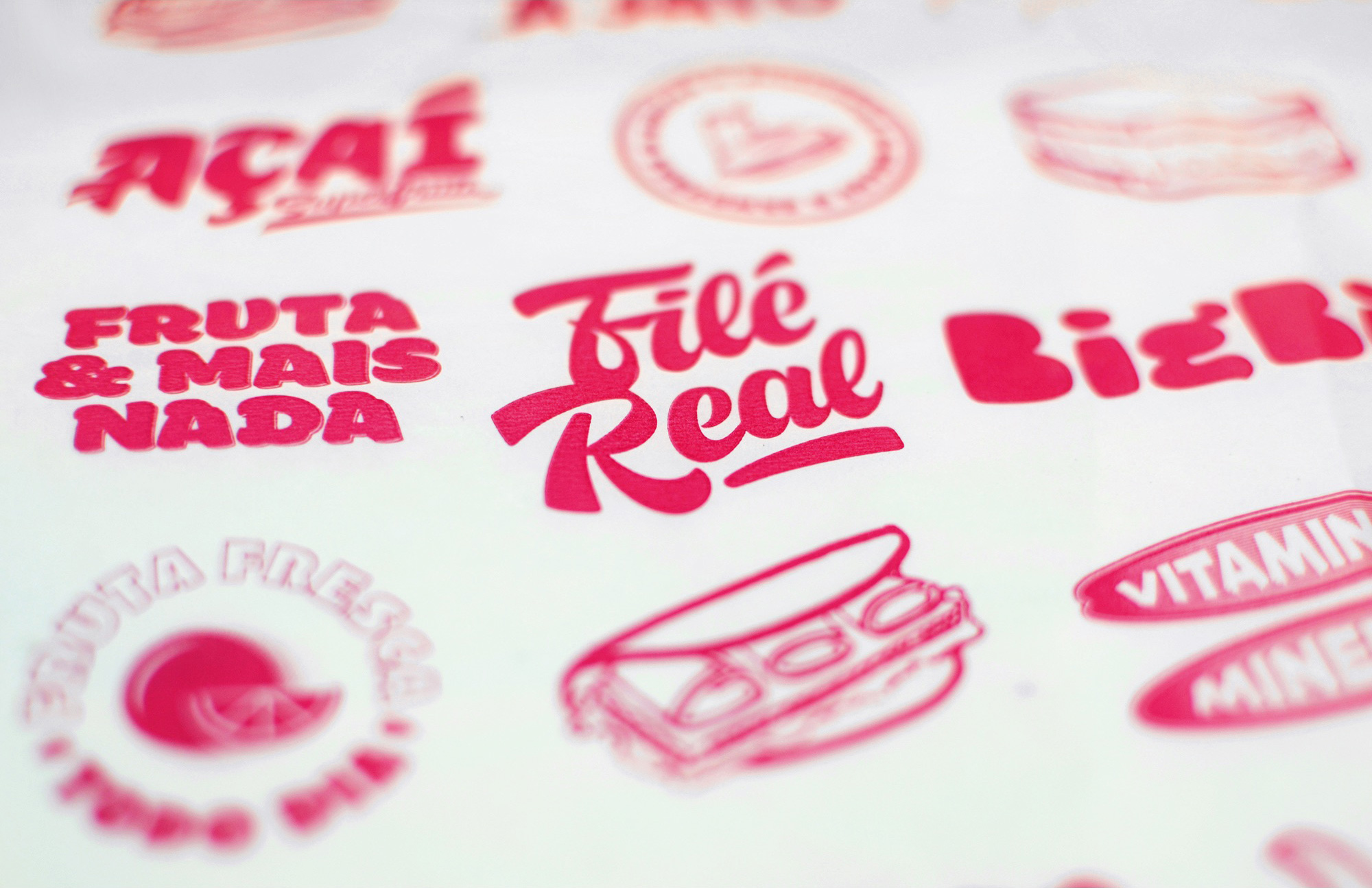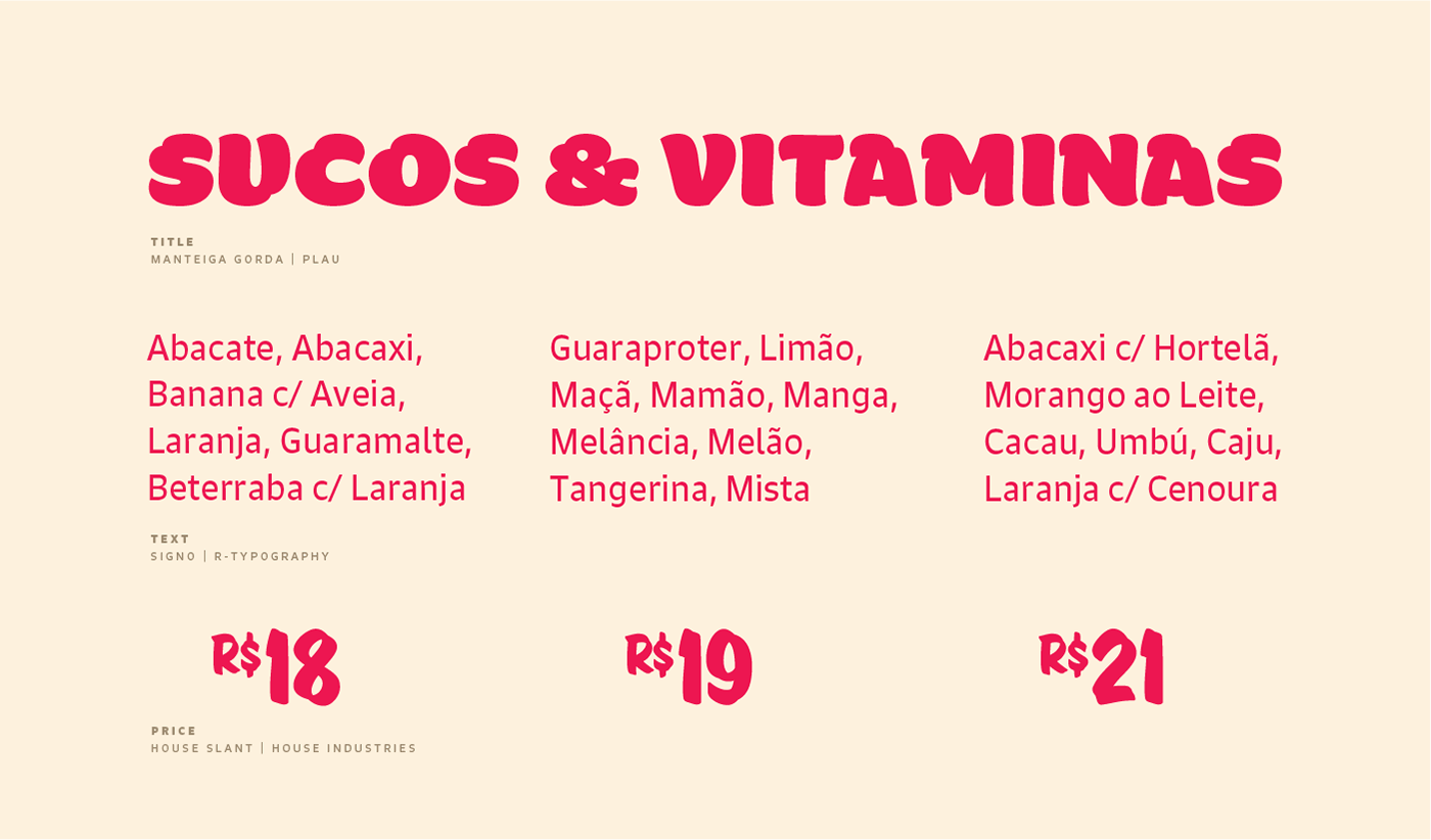 Our own Manteiga was used as the main display typeface, for setting titles in the menu, posters and elsewhere. Then we threw some ingredients to the juice, adding the usual suspects for this type of work, like the House Signpainter collection (Showcard for numbers, Casual for the small dotted lines), Felipe Calderón’s Hollie Script, Erik Spiekermann’s HWT Artz, as well as some other 80s inspired graphics, set in Skia, which has a Lithos vibe, a typeface that was overused in Rio’s late 80s/early 90s scene.