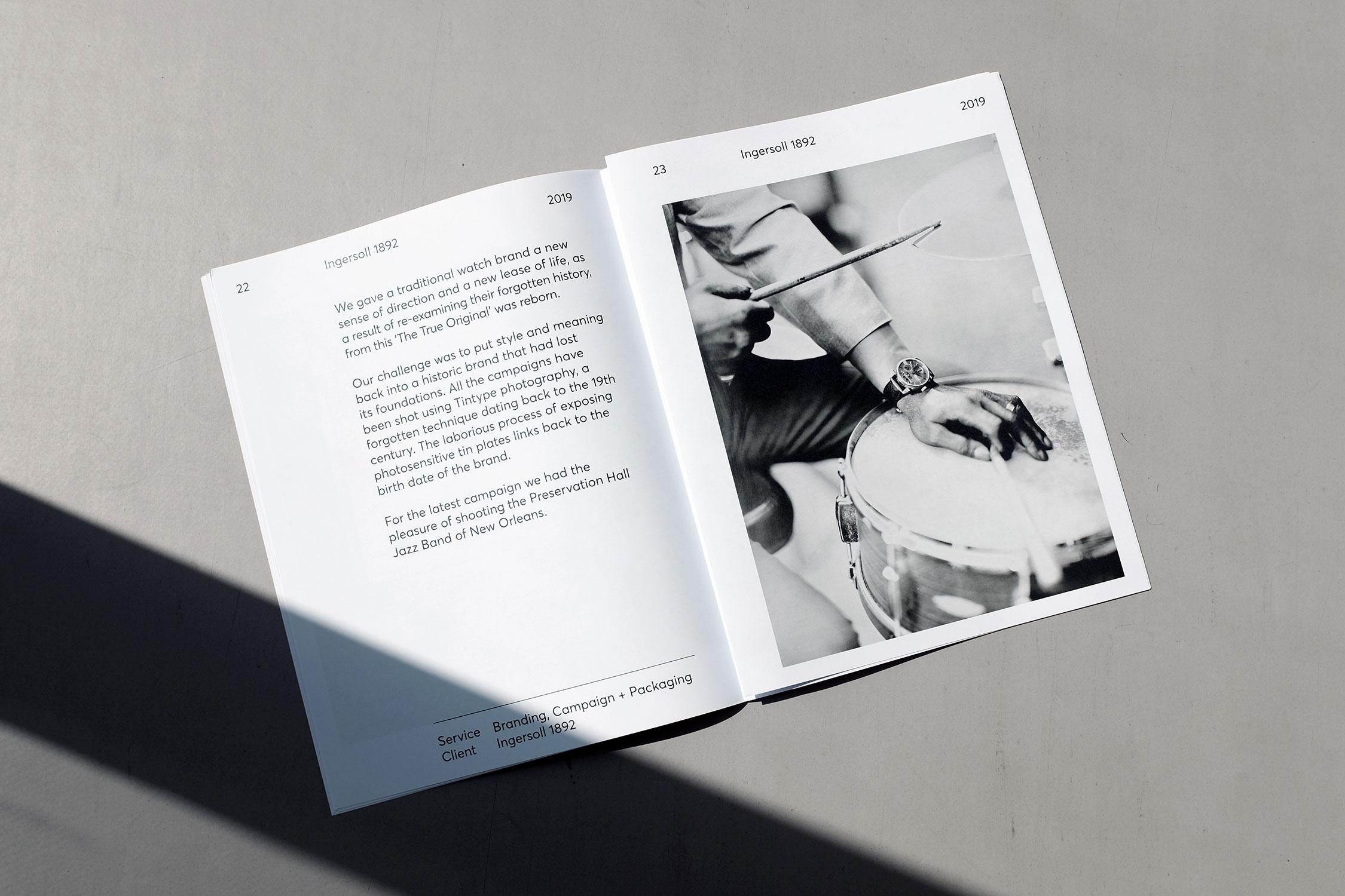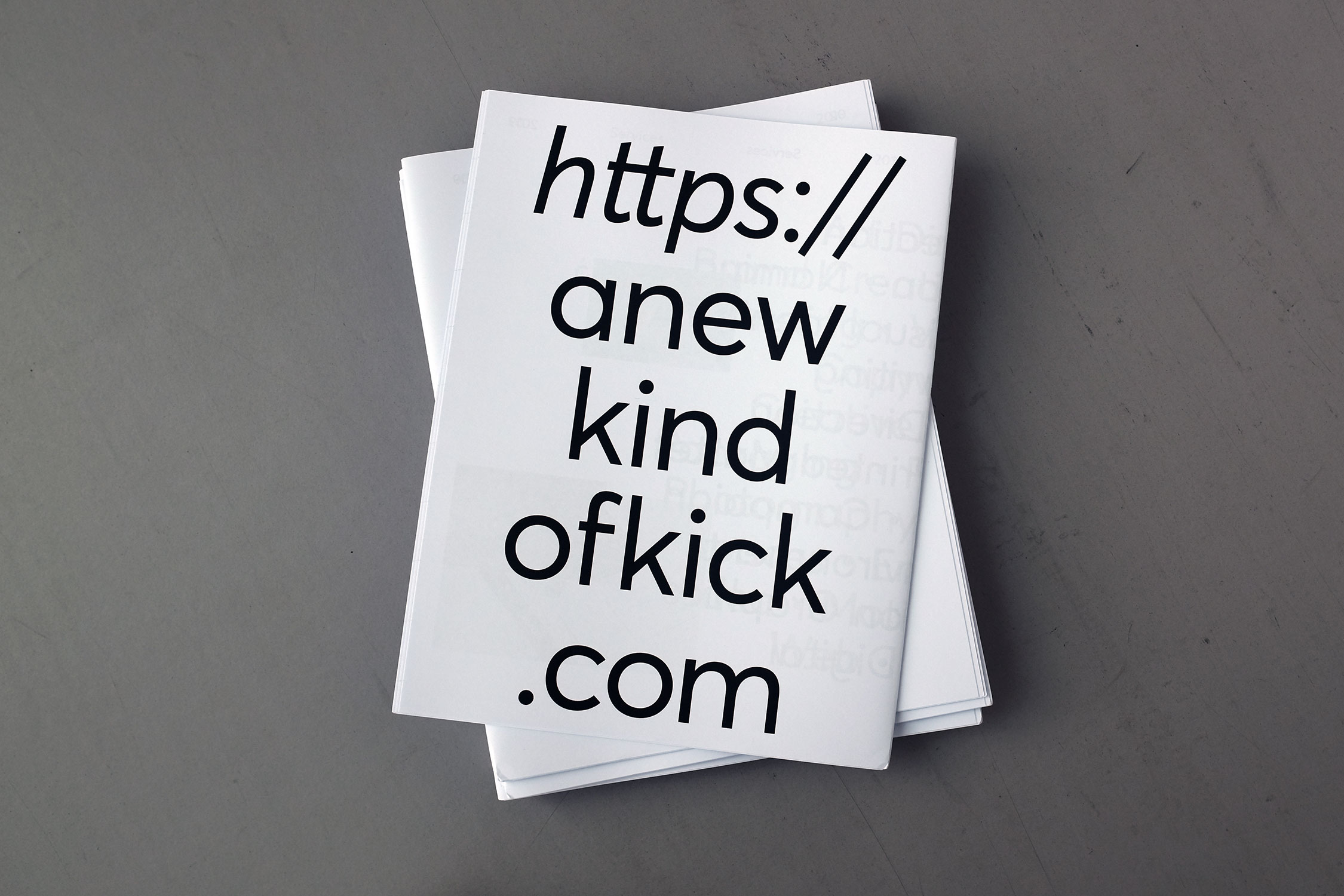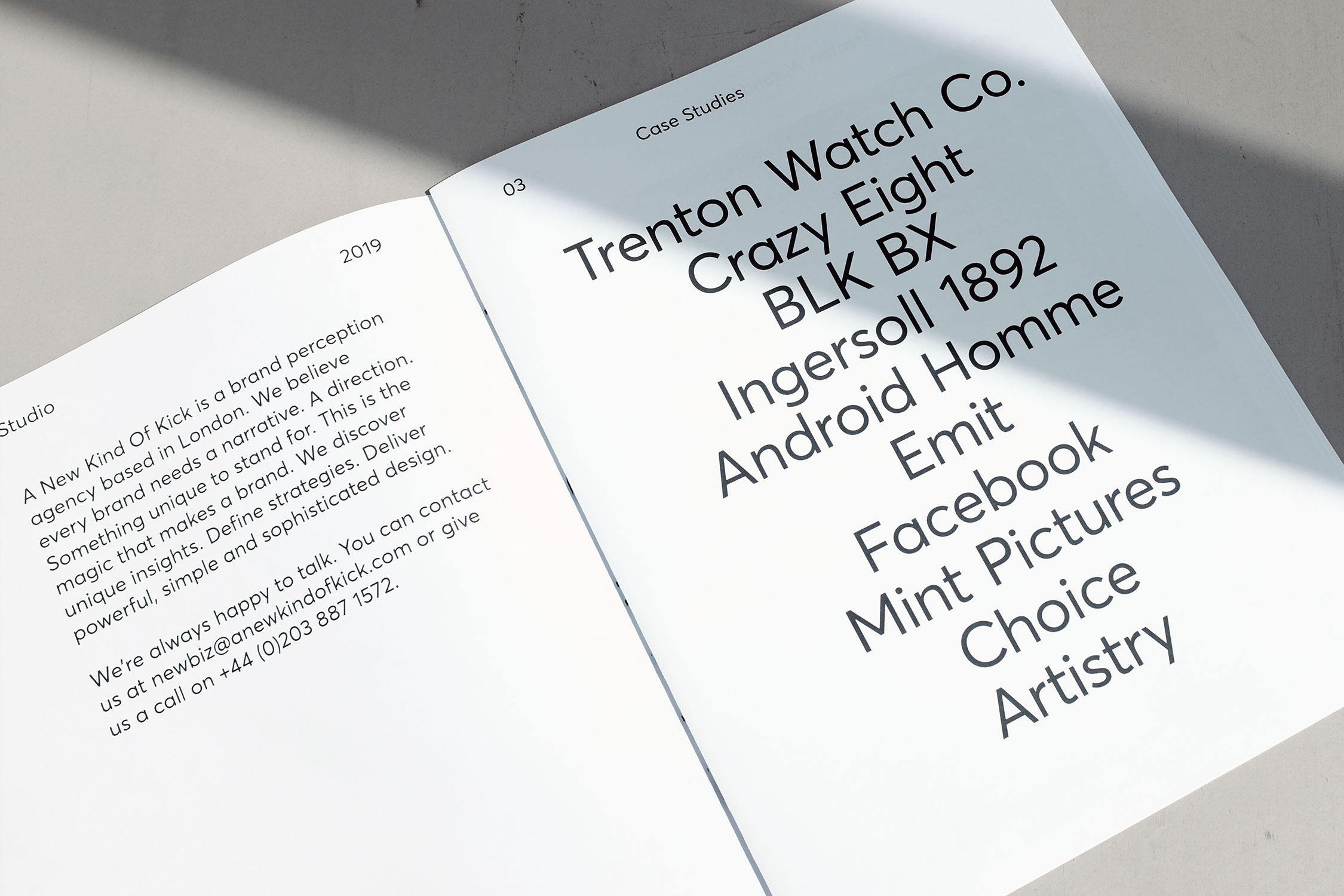 A New Kind Of Kick is a brand perception agency based in London. Celebrating our year end we printed a promotional newspaper documenting the previous 12 months’ projects. The tabloid (289×380 mm) was printed on 90gsm Bright paper with a limited print run which was distributed to clients and friends. Contents includes global watched campaigns for Ingersoll 1892, the reinvention of Trenton, identity for BLK BX, a revolving retail space, as well as branding projects for Mint Pictures, Emit, Choice, and Artistry. The typography exclusively uses Averta.
