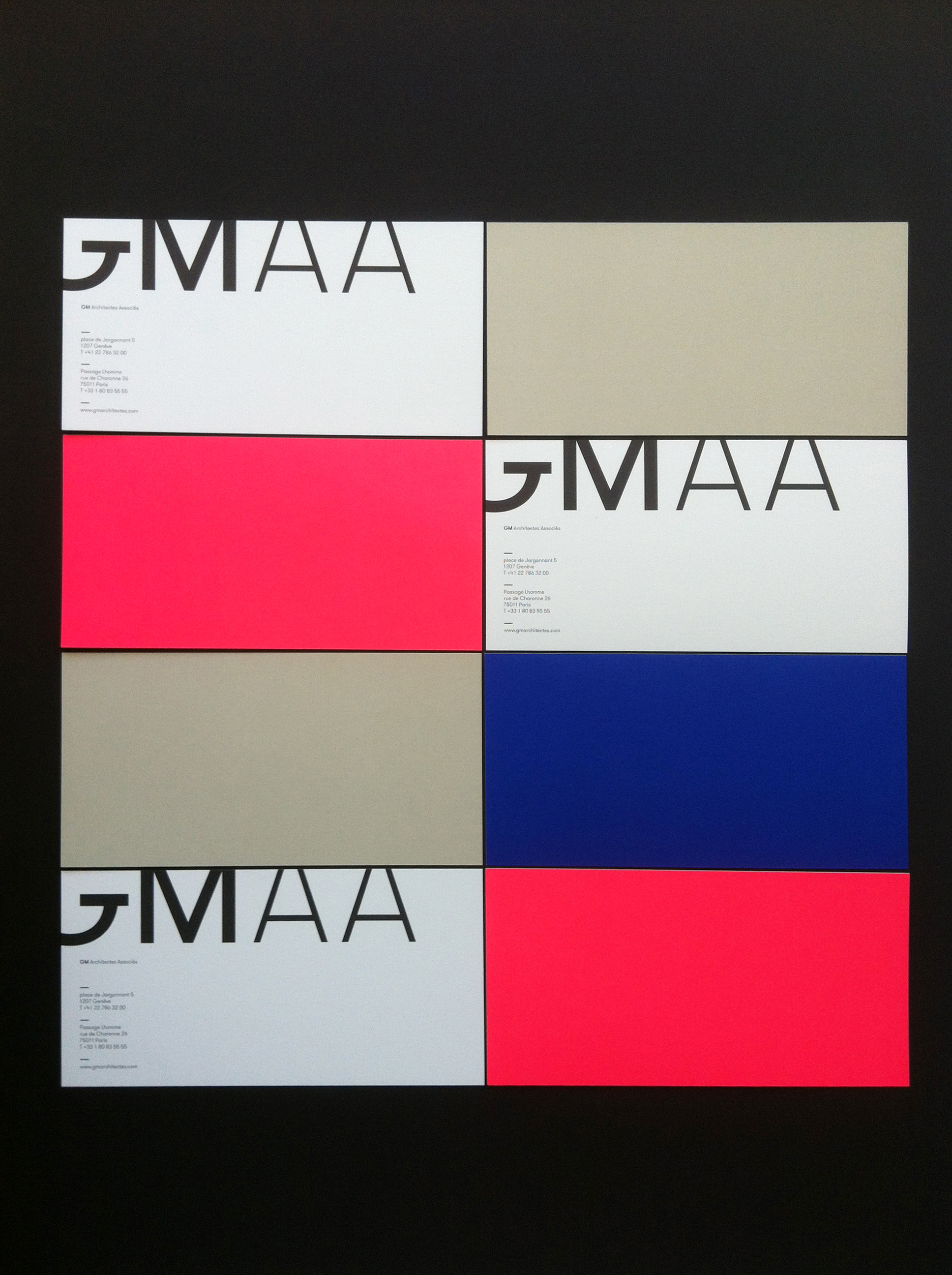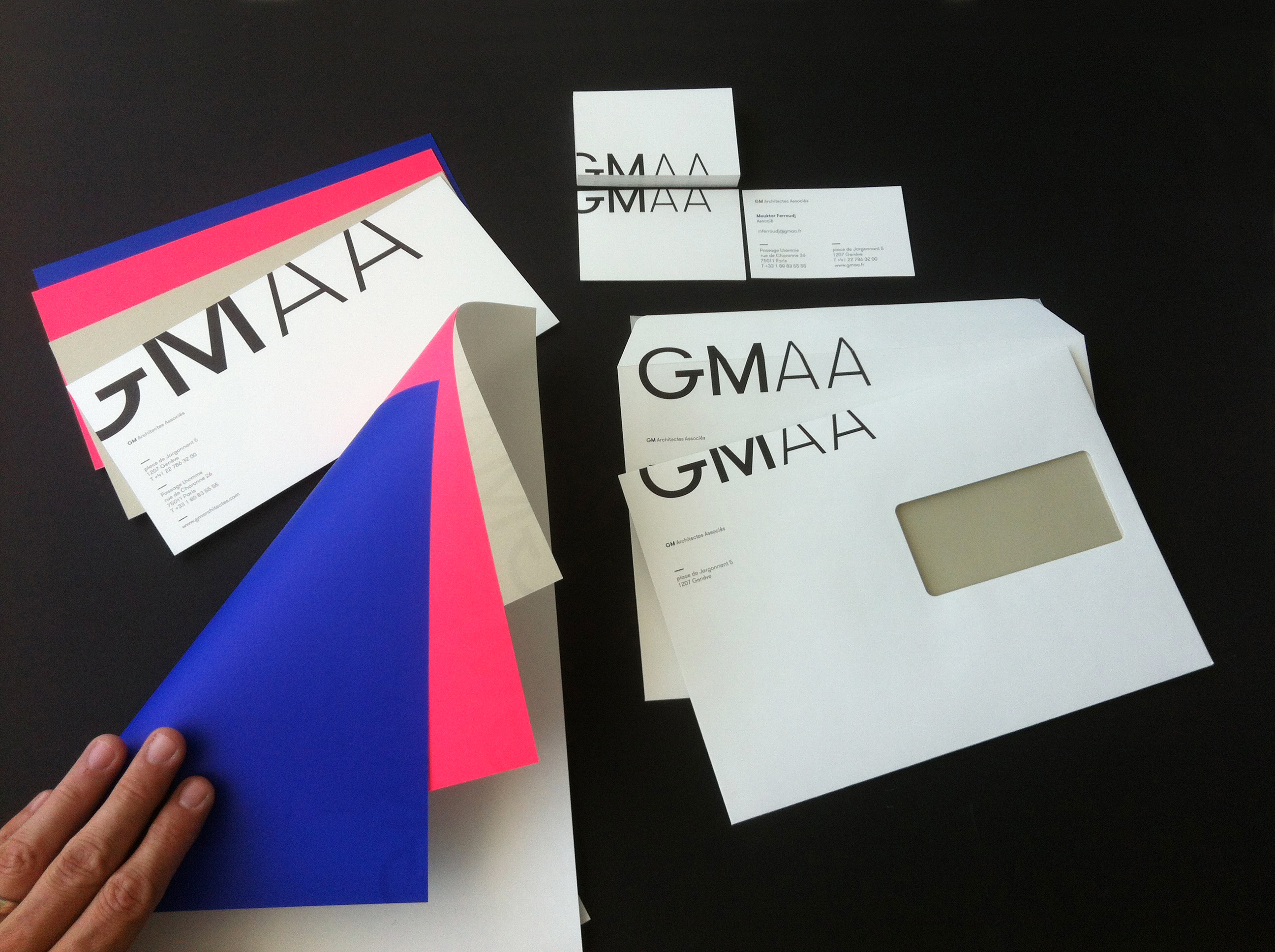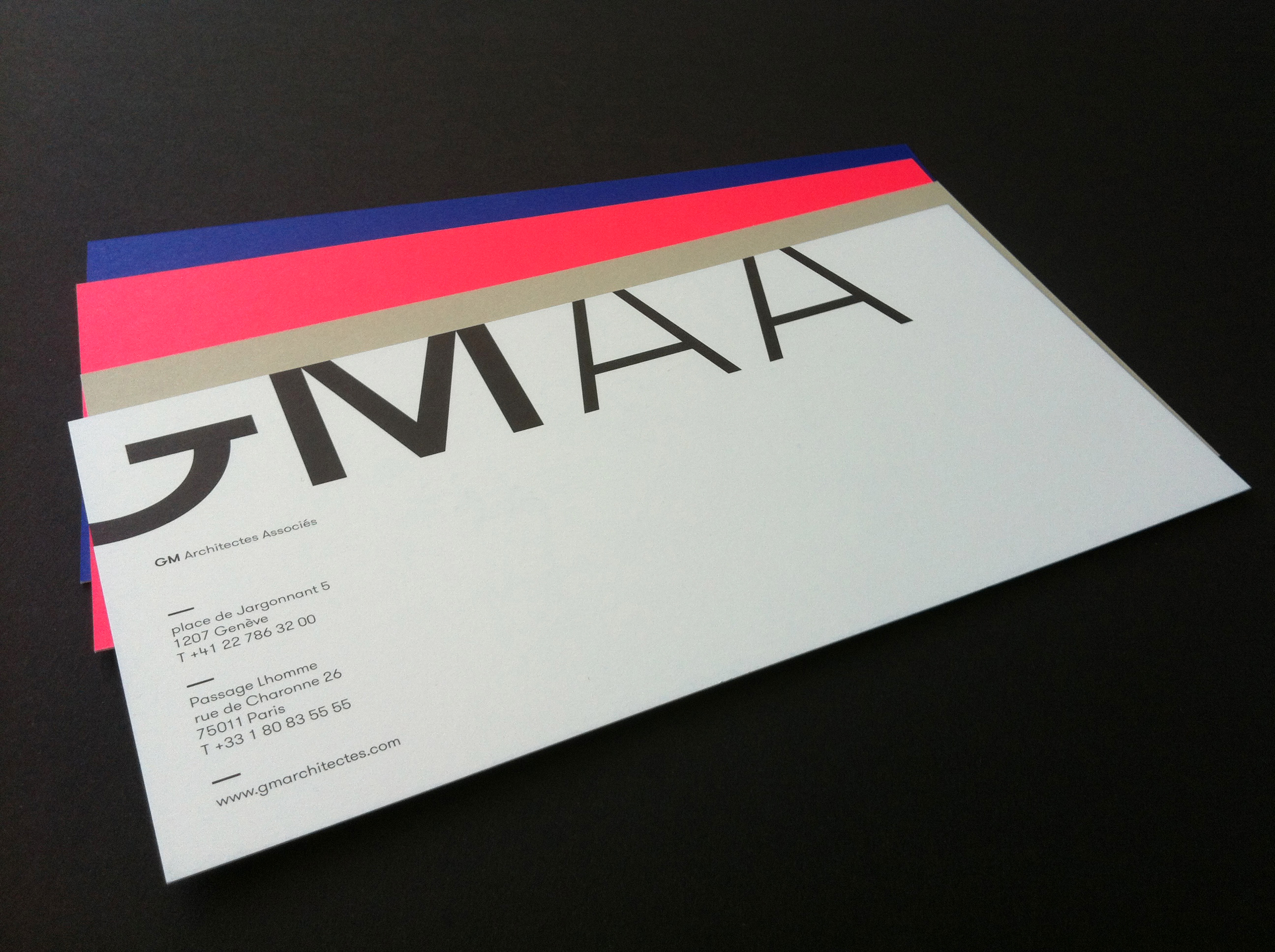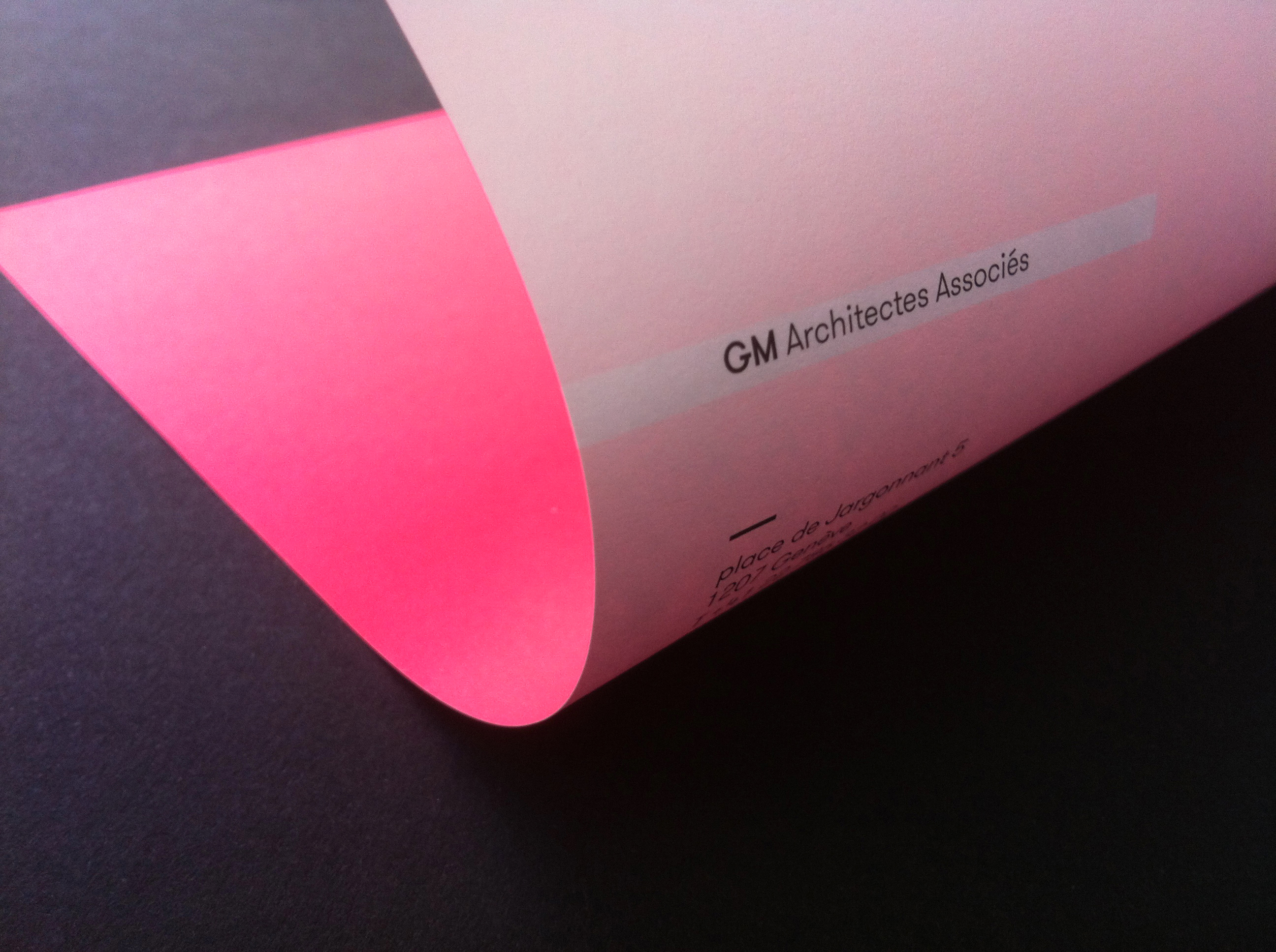 GT Walsheim-powered visual identity for Geneva, Switzerland based architecture studio GM Architectes Associés. Design by GVA Studio. The combination of the pink and blue with only two weights and sizes of GT Walsheim creates a strong impact paired with Swiss simplicity.