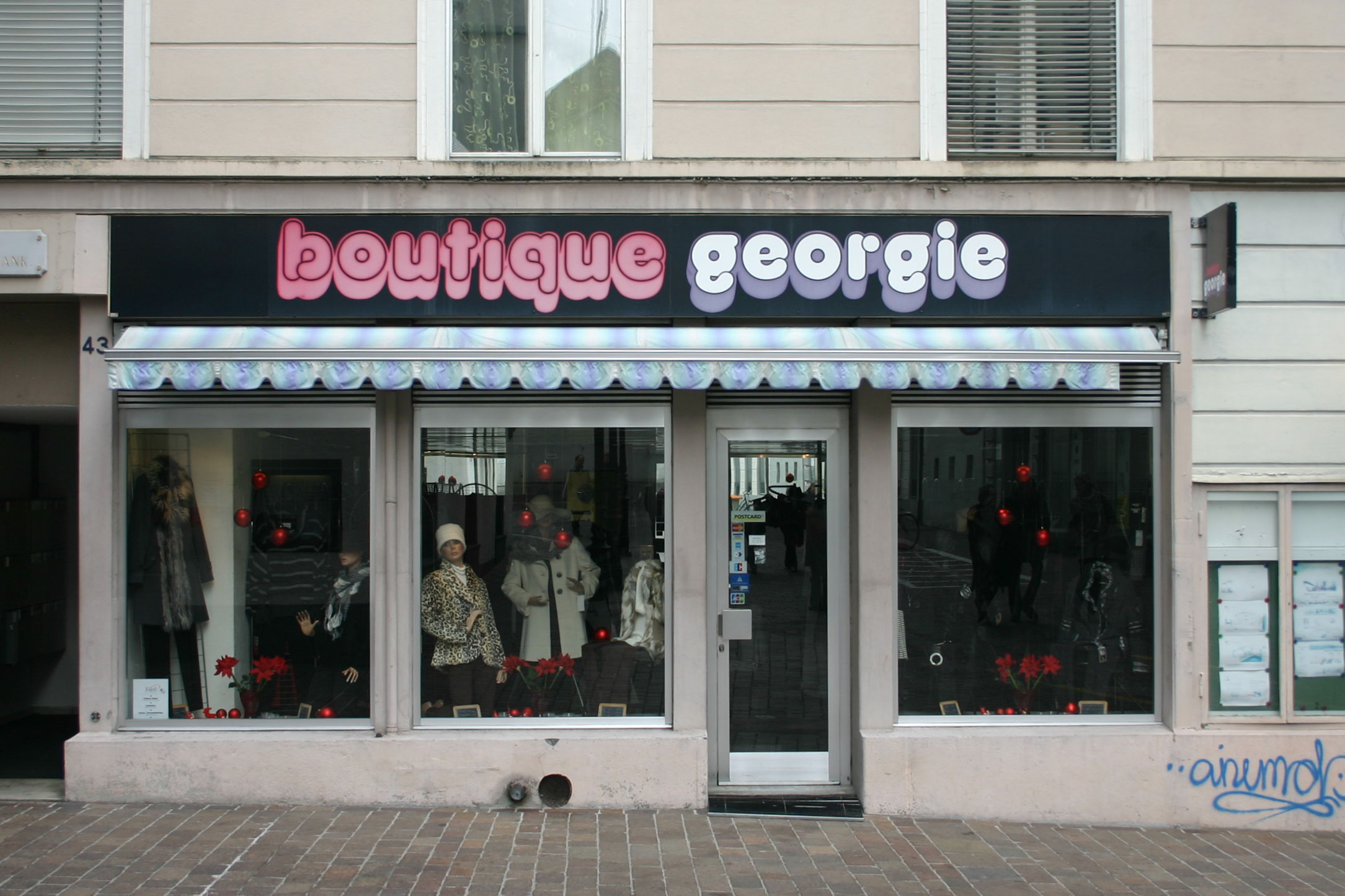The shop sign of Boutique Georgie on St. Gallen’s Spisergasse uses Madeleine Shaded by Colin Brignall.