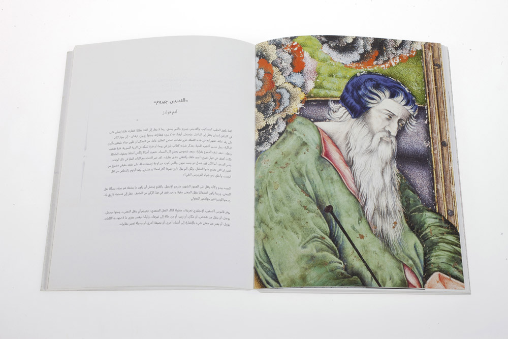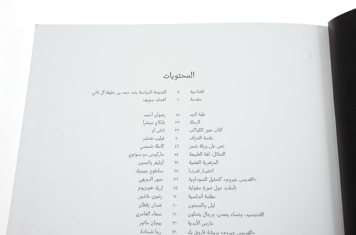 Both the Arabic and English editions of Reflections on Islamic Art were designed by Muiz Anwar, a graphic designer based in London. Anwar’s solution for these books is reduced and thoughtful. Each edition is a mirror of the other. Images play the primary role in the design, often taking up full pages, or half of a spread.