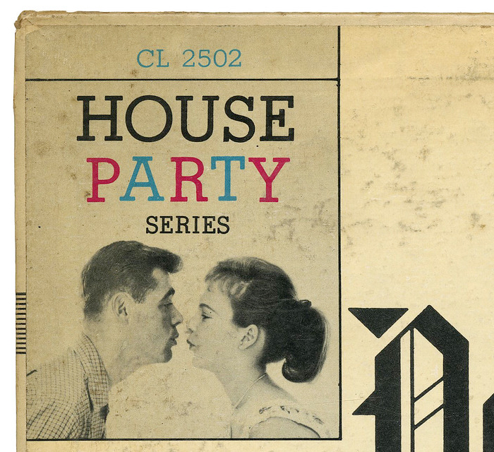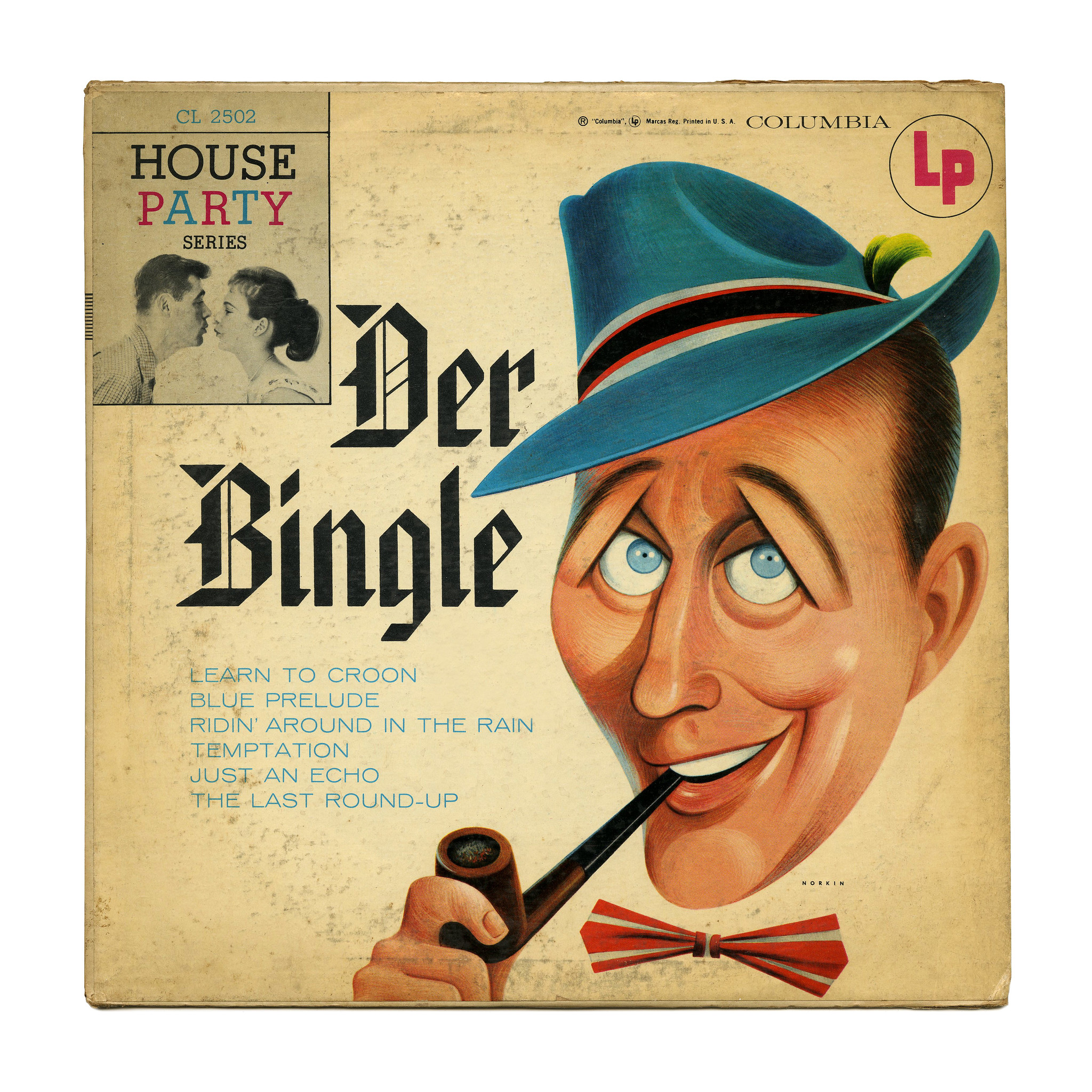 Der Bingle is the fifth release in the “House Party” records series of Columbia Records (ca. 100 albums, 1955–56). The covers for Der Bingle and Get Happy (Frank Sinatra) featured caricature portraits by Sam Norkin. With exception of the label, placed top left on all album covers, there is no serial element in terms of artwork. The slab serif caps – arranged on a bouncing baseline, with alternating letter colors, – are from Stymie.