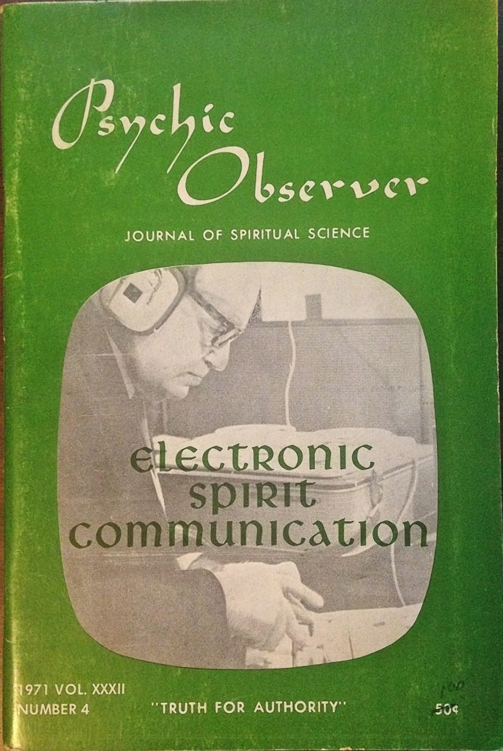 Psychic Observer, Vol. XXXII No. 4, 1971. Legende here appears sharper than in later issues. “Electronic Spirit Communication” is set in Libra. The smaller type uses a Futura-like substance.