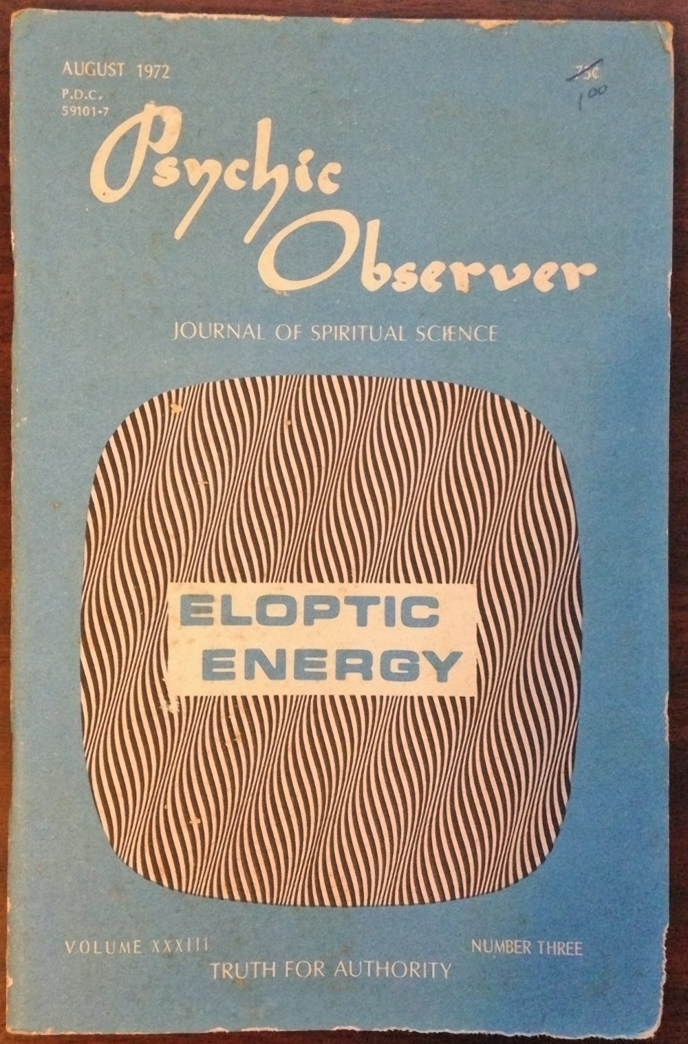 Psychic Observer, Vol. XXXIII No. 3, 1972, with blurry Microgramma and anemic caps from Optima.