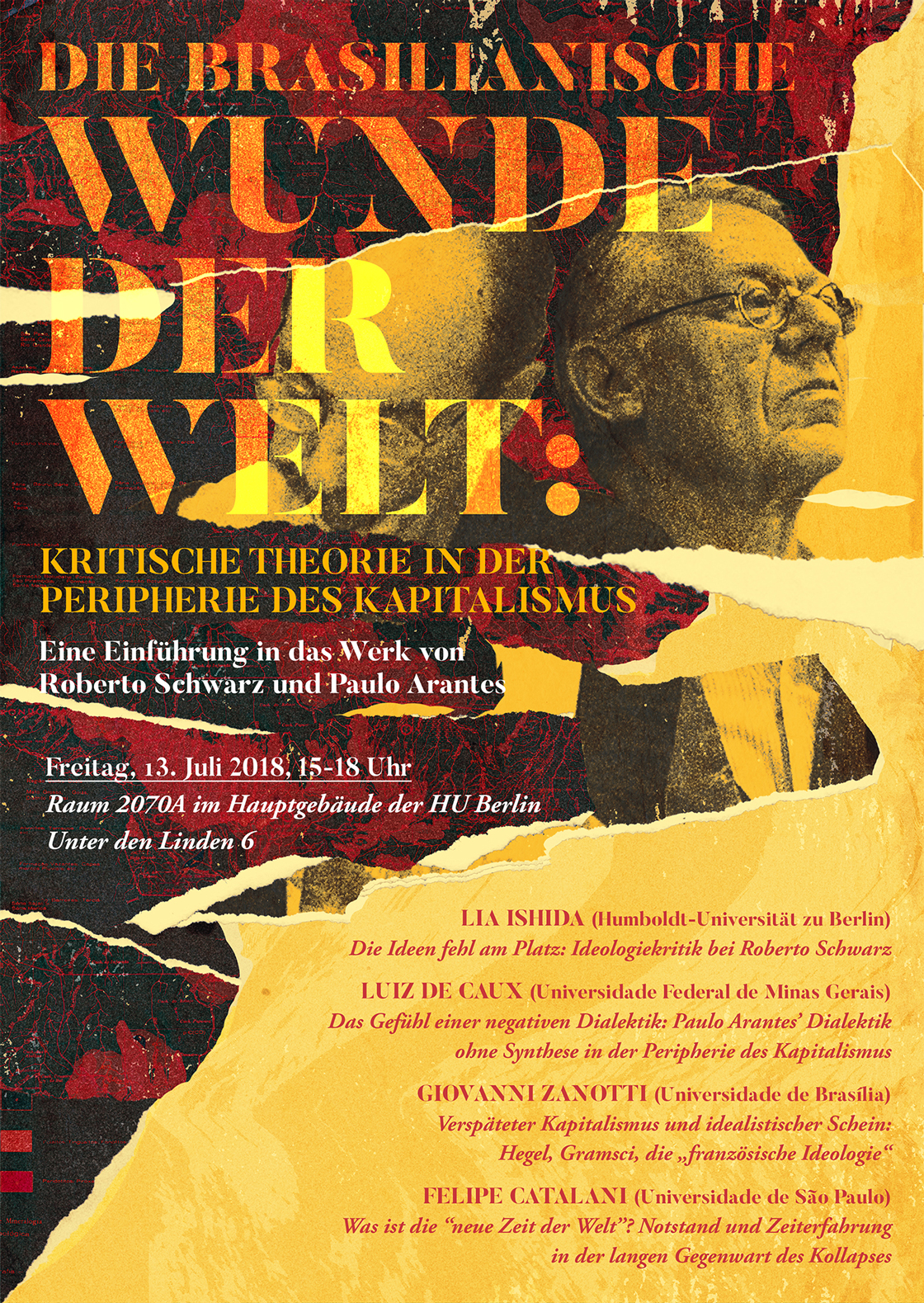 In July 2018 we were invited to create the poster for the colloquium “Die brasilianische Wunde der Welt: kritische Theorie in der Peripherie des Kapitalismus” (“The Brazilian Wound of the World: Critical Theory on the Periphery of Capitalism”). This event held at the Humboldt University of Berlin sought to study the thinking of Brazilian philosophers Paulo Arantes and Roberto Schwarz in German-speaking countries.