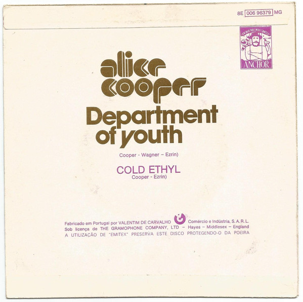 Portuguese single cover for Alice Cooper’s “Department of Youth”, featuring the rare Mecanorma face Triom by Jacques Loison. Released on the Anchor label in 1975 with B-side “Cold Ethyl”.
