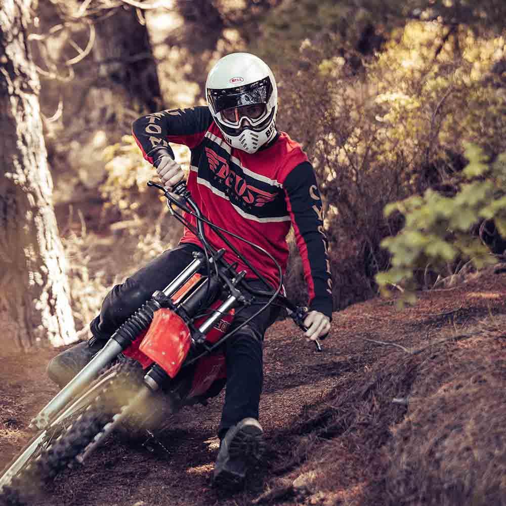 Alias Harbour is adapted in a couple of ways for this Moto-inspired jersey. The D and S are expanded to a wing design for the DEUS type, and the EX MACHINA type is stencilled.